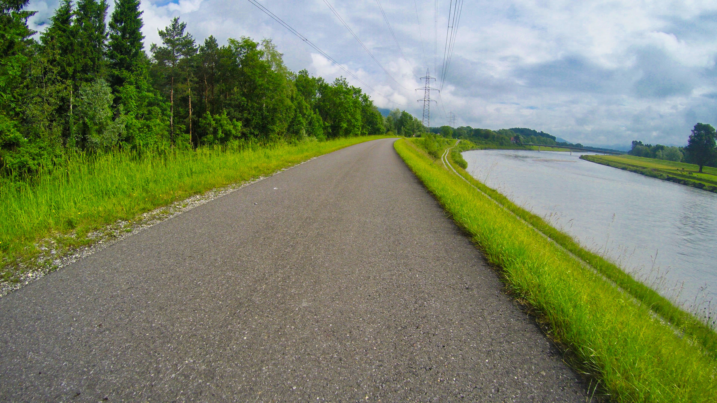 Auf dem Foto sieht man den Rheinradweg. Ich fahre gerade in nördliche Richtung auf Schweizer Seite. Rechts von mir befindet sich das Fürstentum Liechtenstein. Der Baum am rechten Bildrand steht aber bereits auf österreichischer Seite. Gut zu erkennen ist die Brücke im Hintergrund, die Österreich mit der Schweiz verbindet sowie ein Hochspannungsmast. Mit diesen Merkmalen kann man meinen Standort gut bei Googlemaps erkennen.