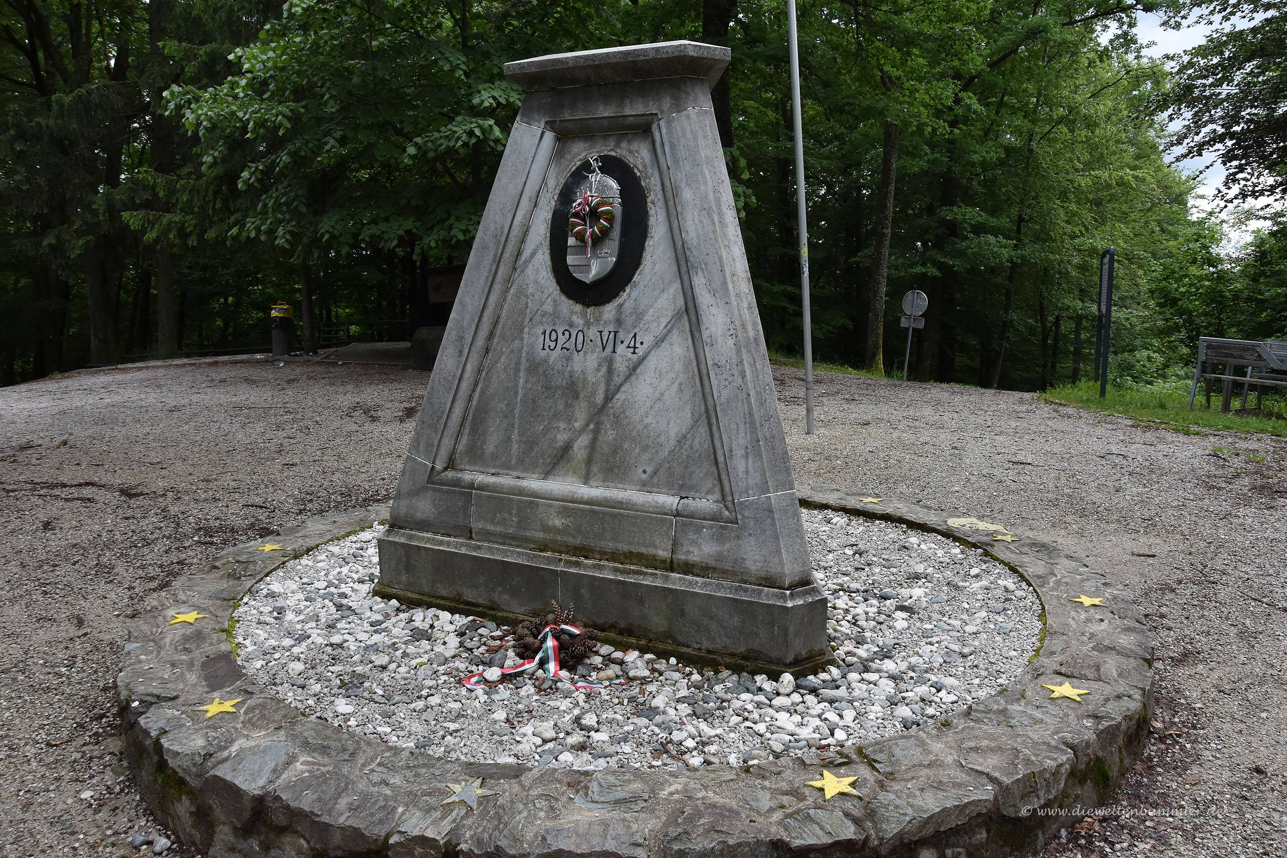Das Ziel ist auf einer kleinen Anhöhe im Wald und besteht aus einer pyramidenförmigen Skulptur. Diese wurde im Jahr 1922 errichtet, als die Nachfolgestaaten der Habsburger Monarchie hier aufeinander stießen. Nach dem Zweiten Weltkrieg war aber genau dieser Punkt politisch recht interessant. Denn Ungarn befand sich auf der einen Seite des Eisernen Vorhangs, Österreich auf der anderen Seite und das damalige Jugoslawien galt gemeinhin als blockfrei.