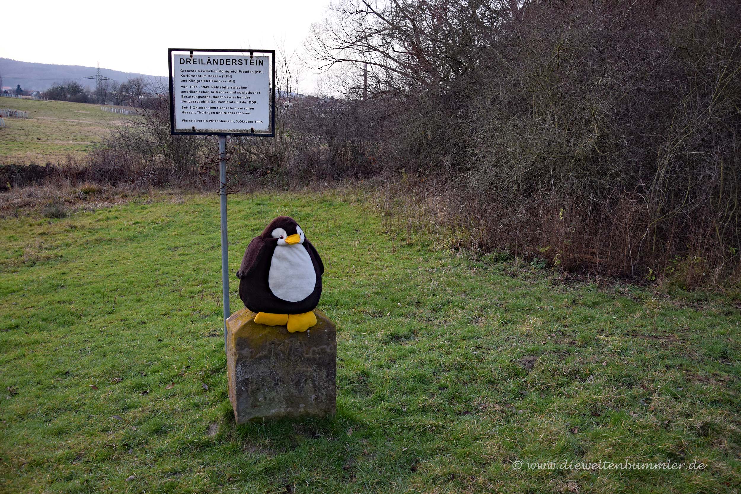 Zu sehen gibt es zwischen den Feldern nicht viel mehr als einen Picknicktisch und ein Hinweisschild. Folgt man dem heutigen Grünen Band entlang der ehemaligen Grenze kann man an einer Stelle noch einen Grenzstein sehen, auf dem die drei Buchstaben DDR eingraviert sind. Allerdings sah mir der Grenzstein fast schon zu westlich und modern aus, um ein originaler Grenzstein der DDR zu sein. Aber es ist einer. Natürlich hatte ich bei der kleinen Wanderung auf dem ehemaligen Todesstreifen auch meinen Begleiter Pingu dabei, wie das Bild zeigt.
