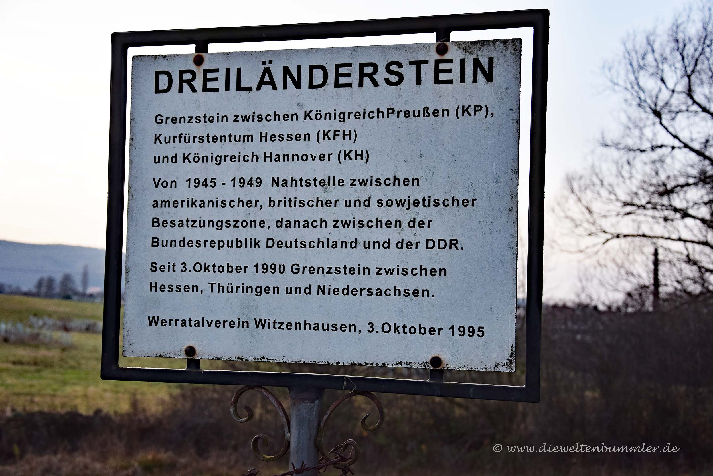 Man könnte es auch anders formulieren: Hier trafen die Bundesländer Hessen und Niedersachsen auf die DDR. Seit der deutschen Einheit ist der Dreiländerstein bei Hohengandern das Dreiländereck von Hessen, Niedersachsen und Thüringen. Es befindet sich logischerweise auf dem ehemaligen Todesstreifen, der sich als deutsch-deutsche Grenze durch das Land zog.