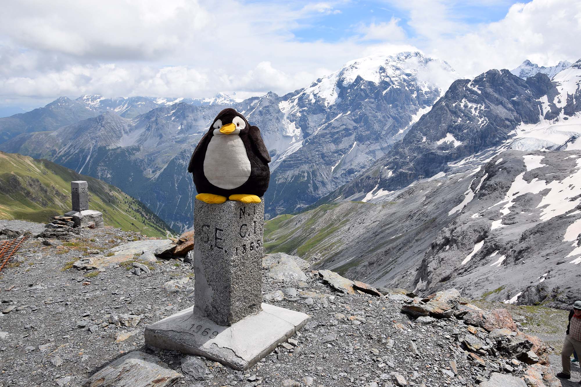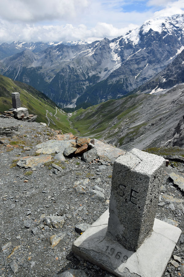 Vom Parkplatz aus ist es dann nicht sonderlich anstrengend, zur Dreisprachenspitze zu gelangen. Diese befindet sich rund 100 Höhenmeter über dem Passübergang. Der Zuweg erfolgt über einen steilen, aber breiten Schotterpfad mit tollen Ausblicken auf die Landschaft in der Ortler-Region. Zu sehen ist dort oben ein Grenzstein mit einer Markierung, die die Grenze zwischen Italien und der Schweiz darstellt. Wie gesagt, ein aktuelles Dreiländereck ist es eben nicht mehr.