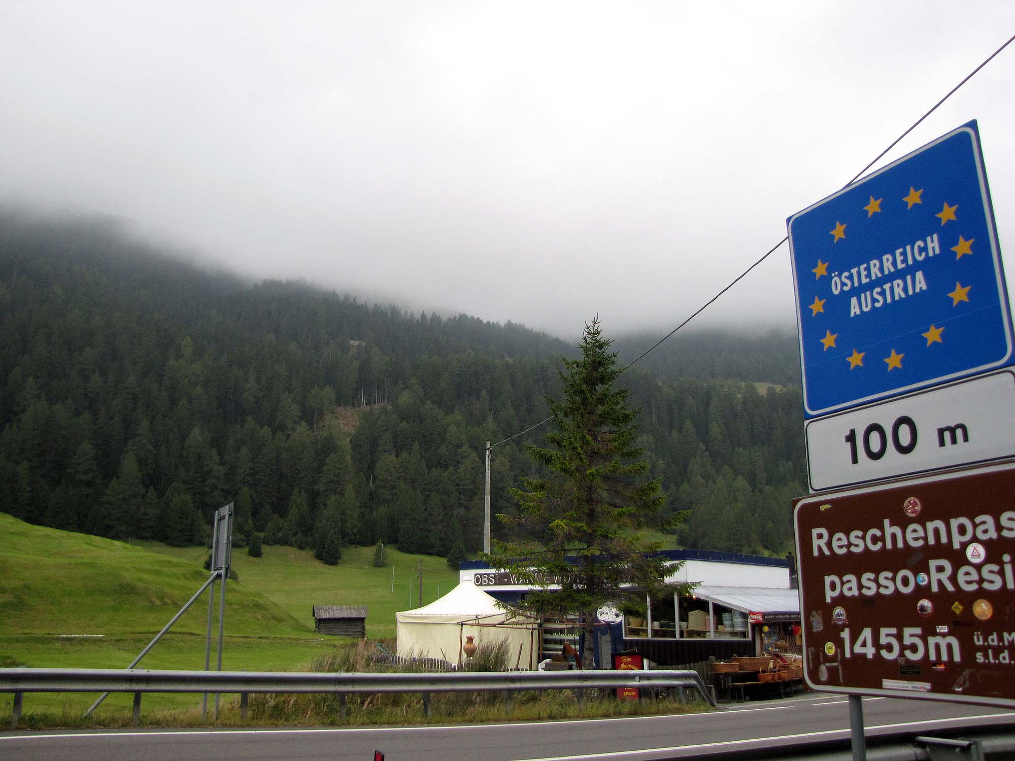 Dieses Foto ist nebenbei entstanden, als ich gerade auf dem Weg von Südtirol nach Hause war und über den Reschenpass fuhr. Das Dreiländereck befindet sich auf dem Berg, der noch ein wenig im Nebel verborgen ist. Der Link führt dementsprechend nicht zum Eck, sondern zum Aufnahmepunkt an der Straße zwischen Österreich und Italien.