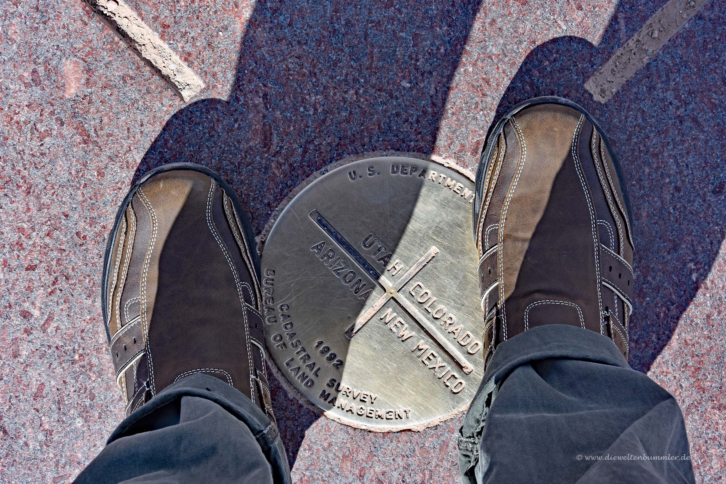 Besonders spannend fand ich aber einen Grenzpunkt, der extrem selten ist. Das ist nämlich ein Vierländereck. In den USA wird es als Four Corners bezeichnet. Gleich vier US-Bundesstaaten treffen an diesem Punkt aufeinander. Das sind im Uhrzeigersinn Colorado, New Mexico, Arizona und Utah.