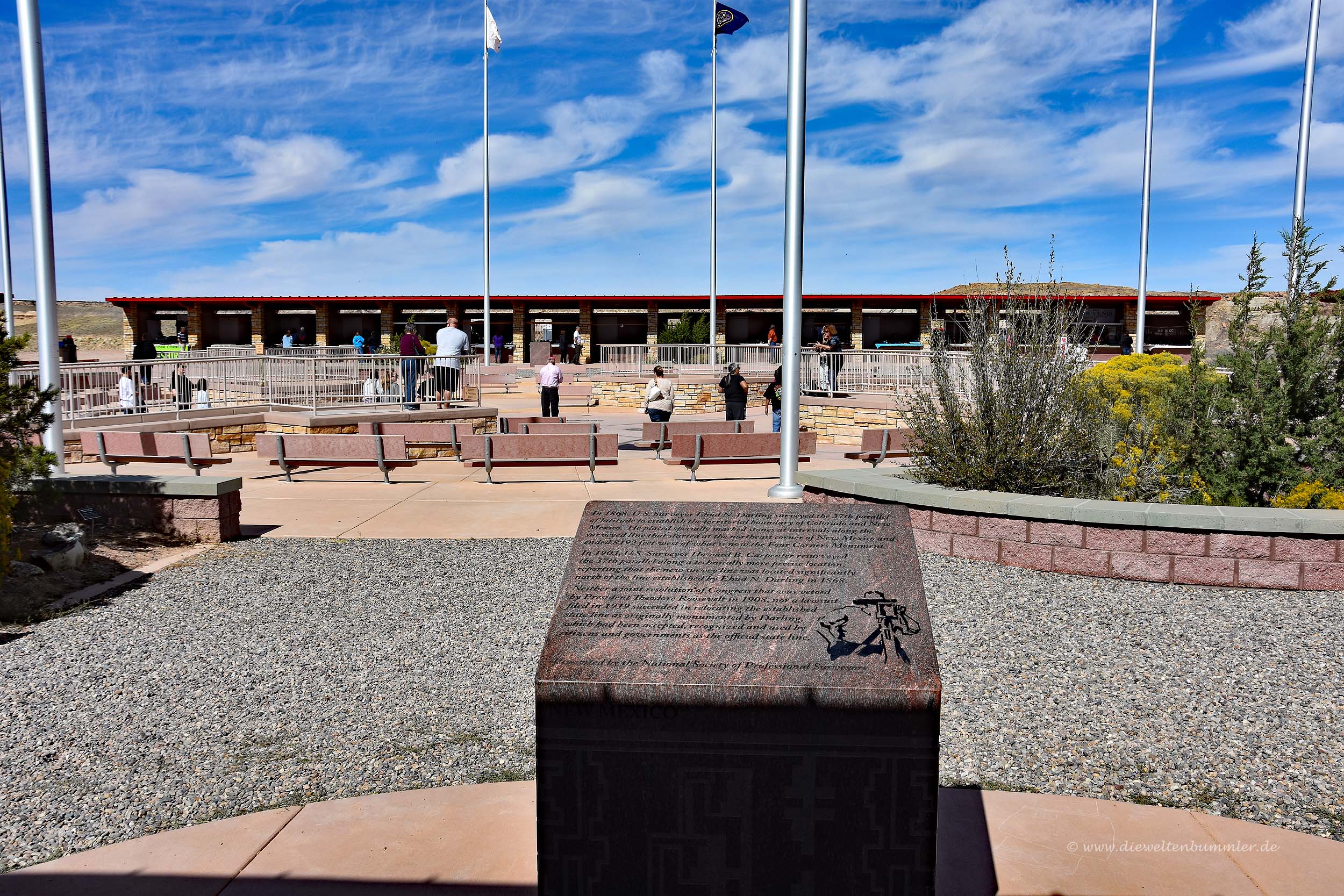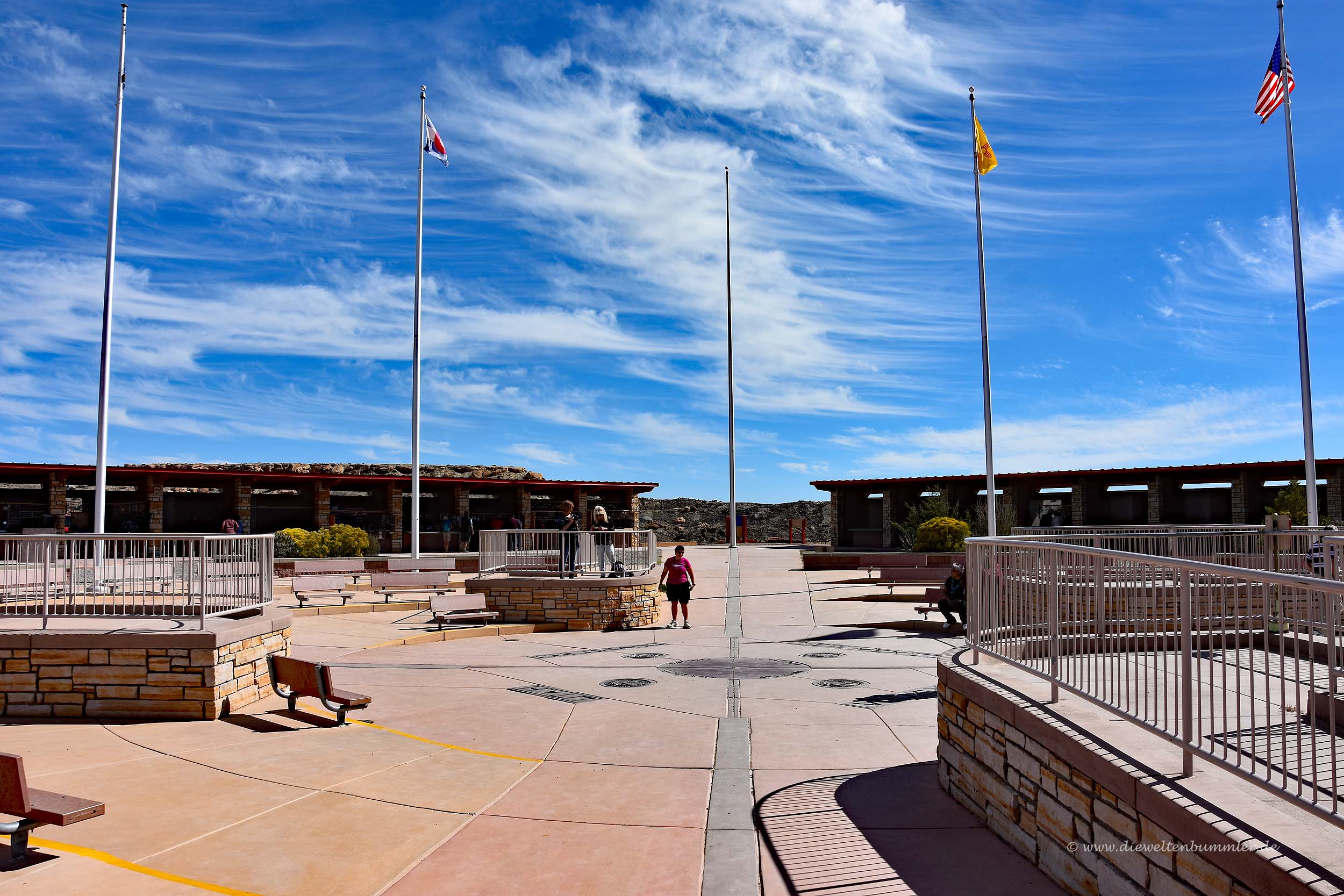 Im Zentrum dieser Häuser ist dann entsprechend die Markierung für das Vierländereck am Boden. Wie man auf einem Bilder sieht, kann man sich draufstellen und ist dann in vier US-Bundesstaaten gleichzeitig.