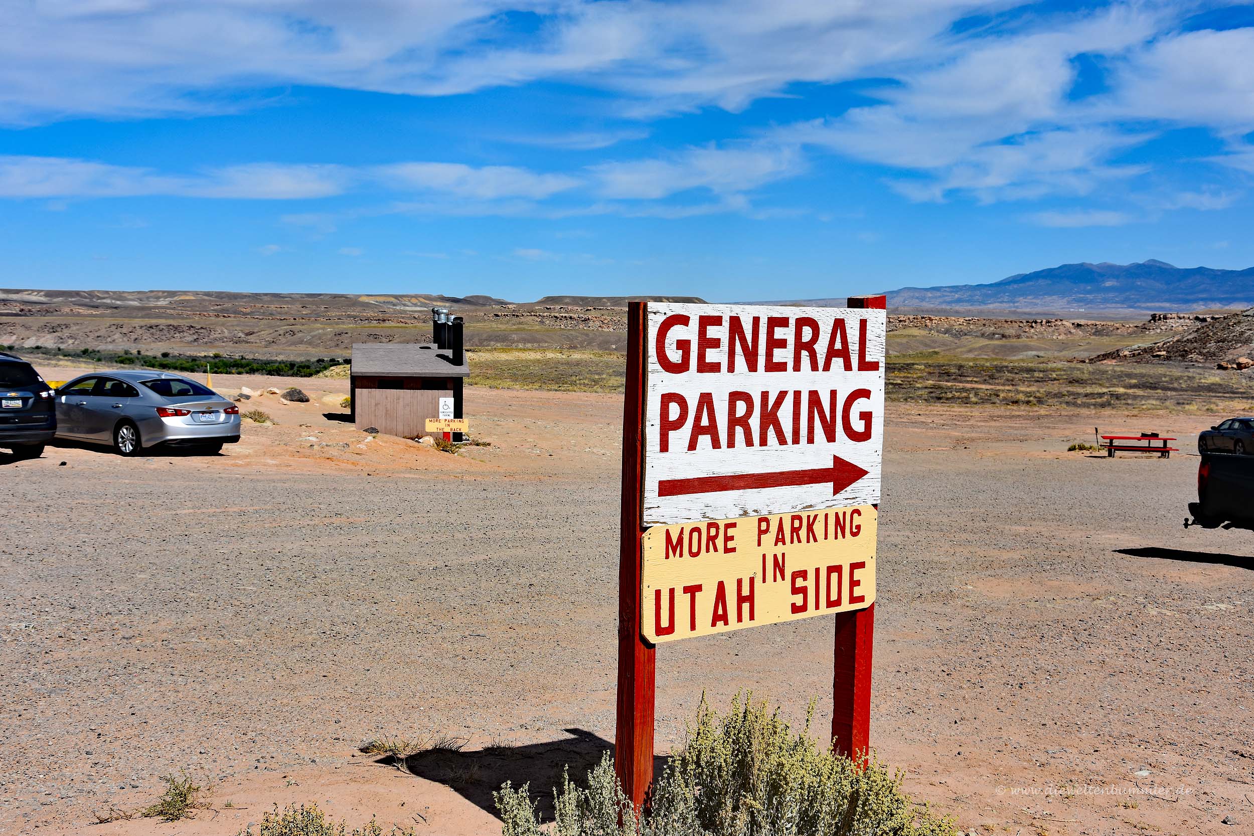 Erst dann kann man das Auto parken und zu Fuß das Vierländereck umrunden. Irgendwie drollig ist das Hinweisschild am Parkplatz, das daraufhin weist, dass auf der Seite von Utah auch noch Parkmöglichkeiten existieren. Um von New Mexico nach Utah zu fahren, muss man aber definitiv vorher noch durch Coloradao oder Arizona. Und mit dem Parken ist es in der sonst recht einsamen Gegend nicht sonderlich schwer.