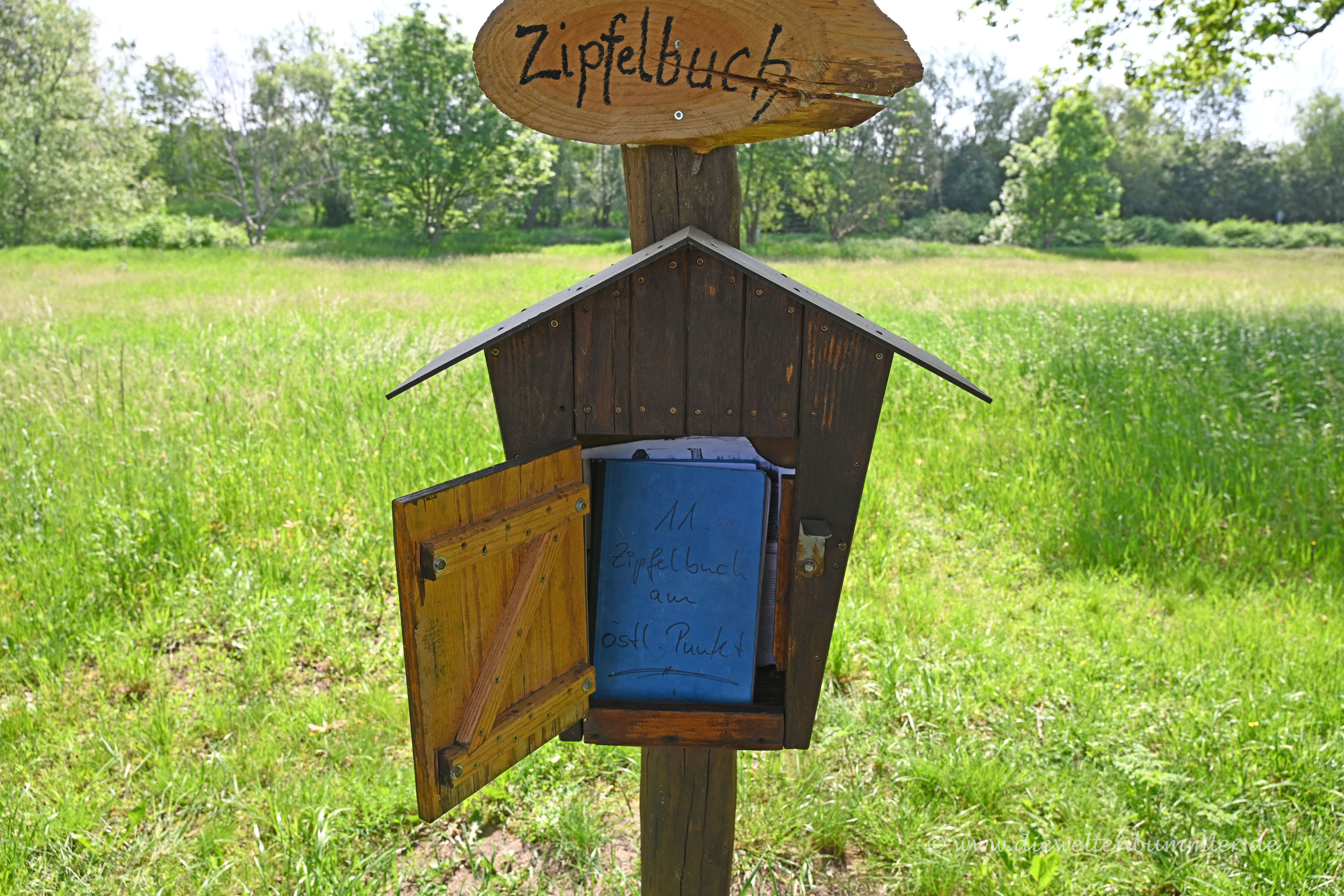 Gleich daneben befindet sich ein hölzerner Ständer, in dem sich ein Zipfelbuch befindet. Wir sind ja hier nicht auf einem Gipfel, wo ein Gipfelbuch notwendig wäre, sondern an einem Zipfel und entsprechend heißt das Gästebuch eben Zipfelbuch. Keine Frage, dass wir uns hier eingetragen haben. In dem Kasten gab es auch Zeitungsausschnitte, die ein wenig traurig stimmten. Denn berichtet wurde in der Lokalzeitung von wiederholtem Vandalismus. Sehr schade, dass einige Leute nichts anderes im Sinn haben als zu zerstören. Sie sollten sich lieber daran erfreuen, in welch reizvoller Umgebung sie sich aufhalten. Ist nämlich nicht überall so idyllisch.