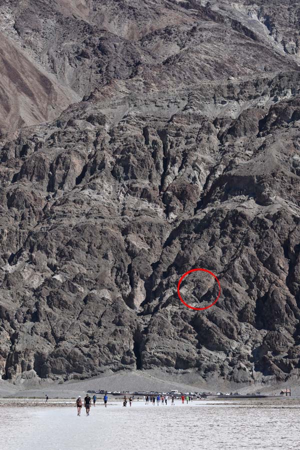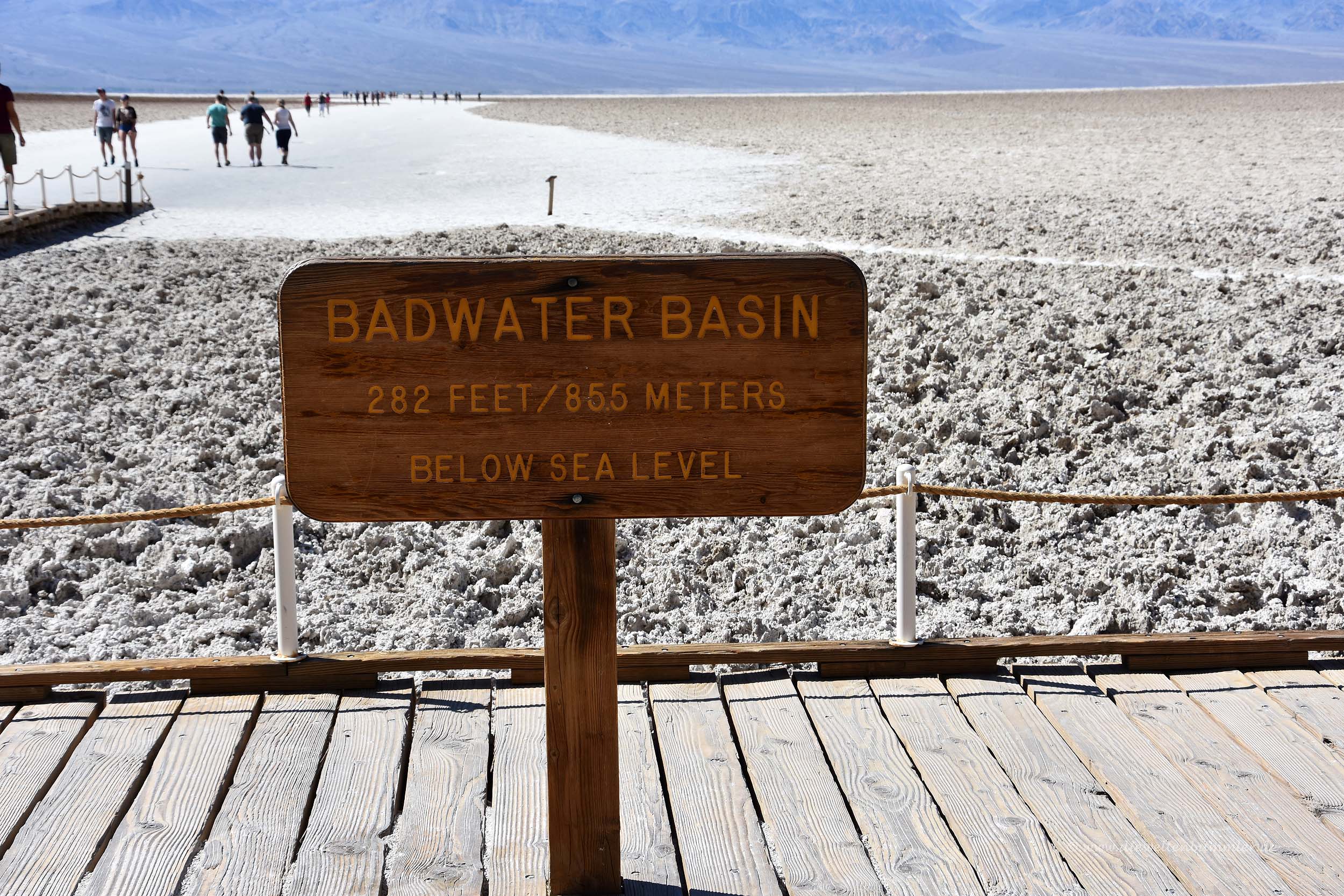 Das ist dann natürlich noch etwas Besonderes, wenn man dafür soweit nach oben schauen muss. Diese tiefste Landstelle der Vereinigten Staaten von Amerika heißt übrigens Badwater Basin. Auf den Bildern sieht man die Touristen auf einem weißen Weg spazieren. Das ist Salz, ähnlich wie am Großen Salzsee bei Salt Lake City in Utah, nur ein wenig kleiner – und tiefergelegen.