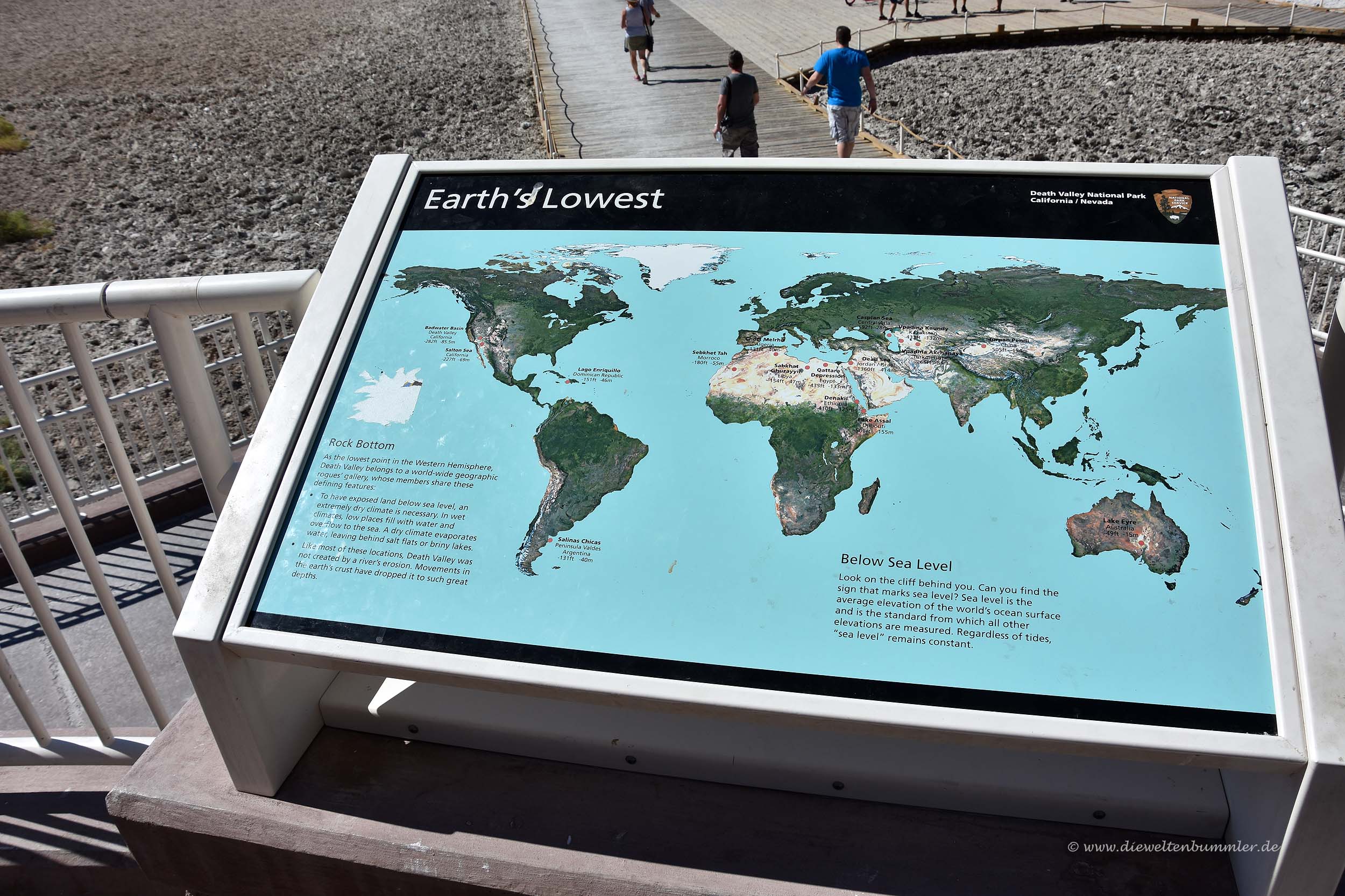 Die tiefste Landstelle der USA befindet sich an einer der trockensten Stellen des Landes, nämlich im Nationalpark Death Valley in Kalifornien. Als wir mit dem Mietwagen zu den Nationalparks der USA fuhren, haben wir diesen natürlich auch besucht und dort auch in einem kleinen Motel übernachtet.