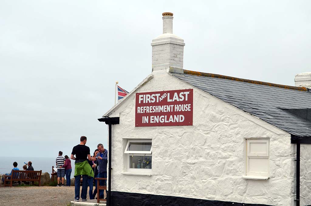 Am Land’s End befindet sich zudem das sogenannte First and Last House in England. Davor steht ein Wegweiser, an dem man sich gegen Bezahlung fotografieren lassen kann. Mit Wechselbuchstaben wird dann auf dem Wegweiser der Heimatort eingetragen. So ein „First and Last House“ gibt es auch in Schottland, genauer gesagt bei John o’Groats.