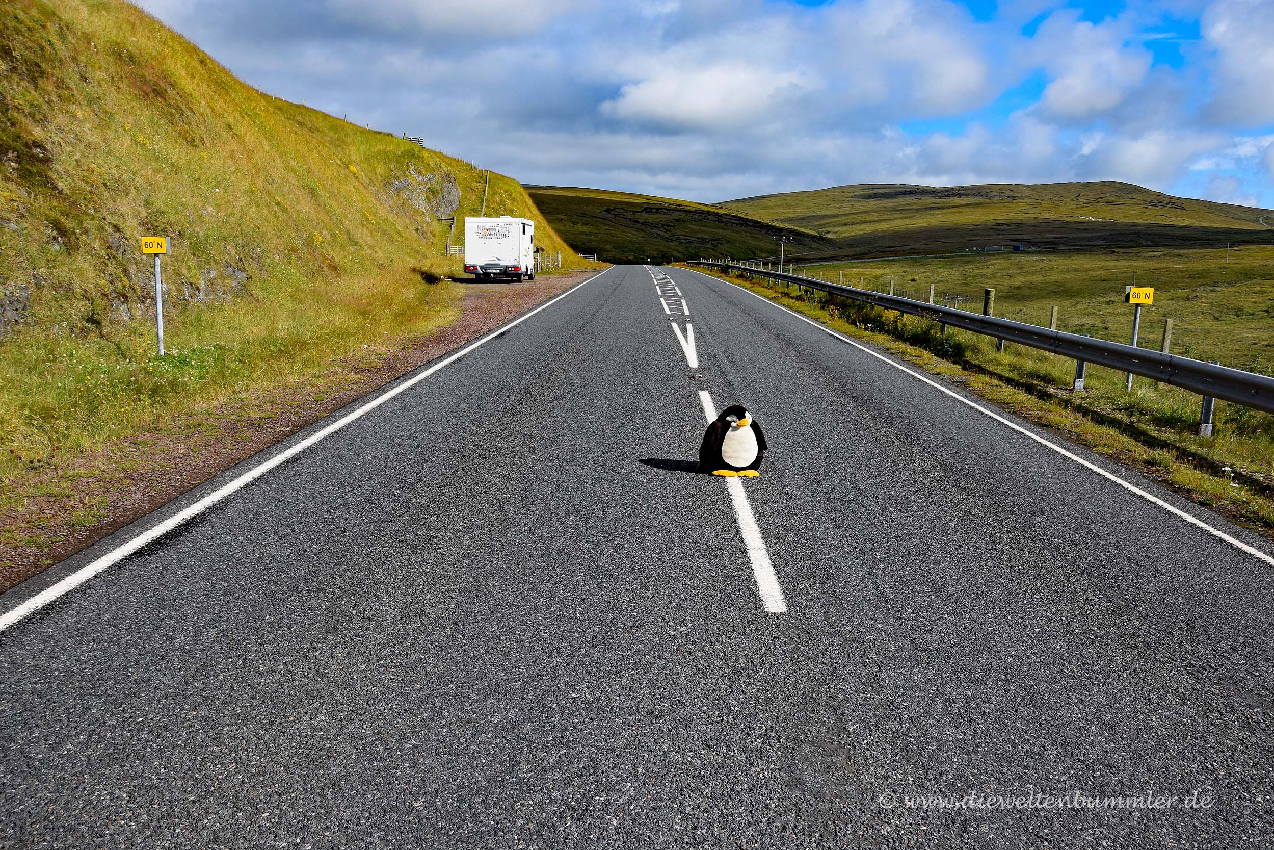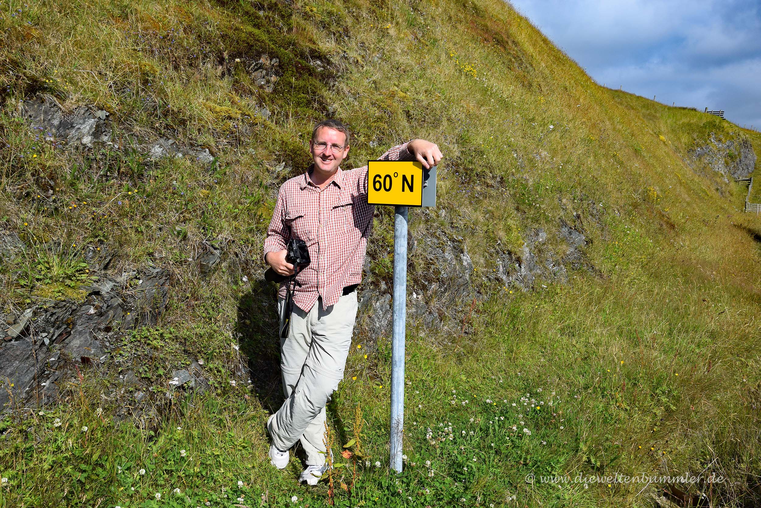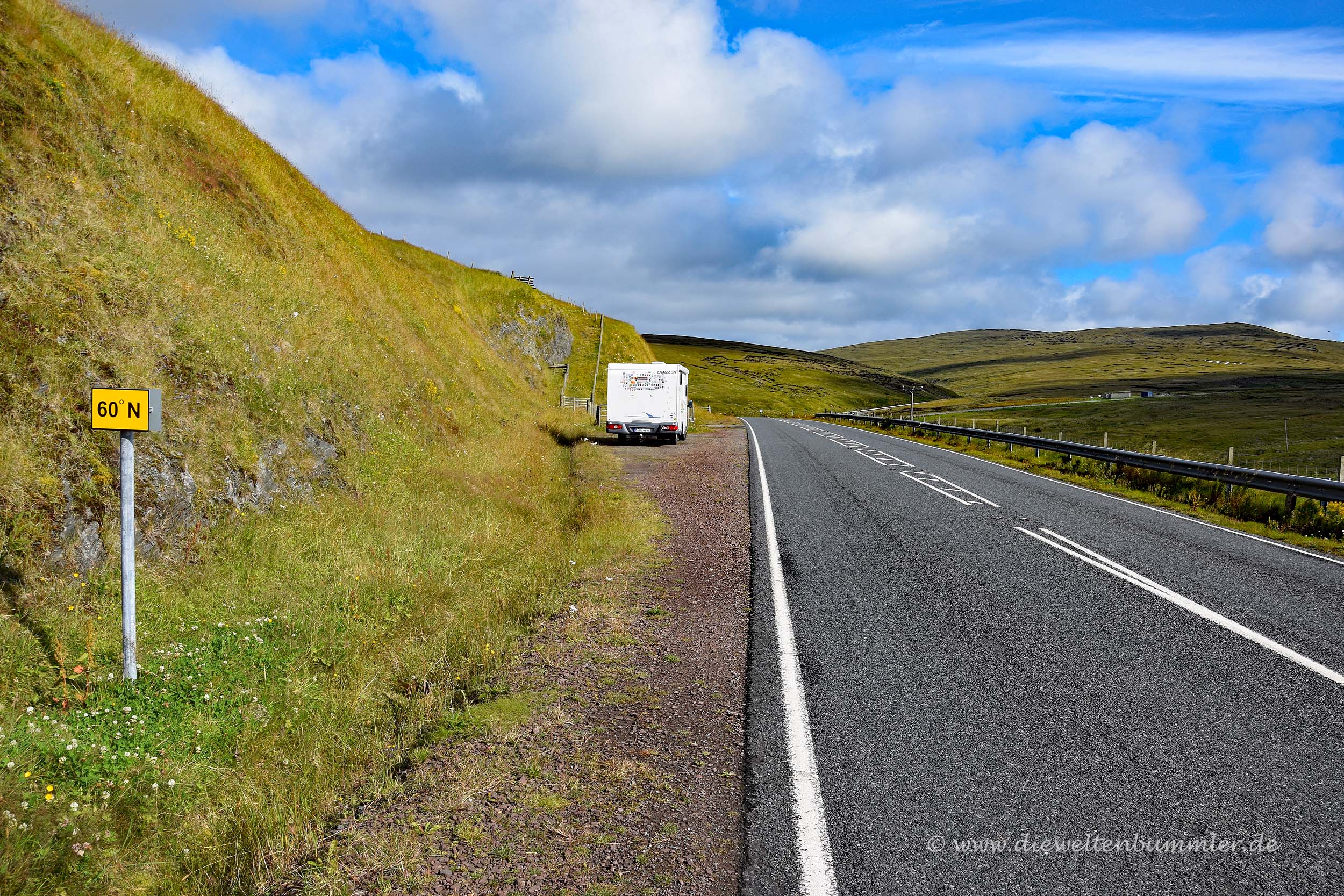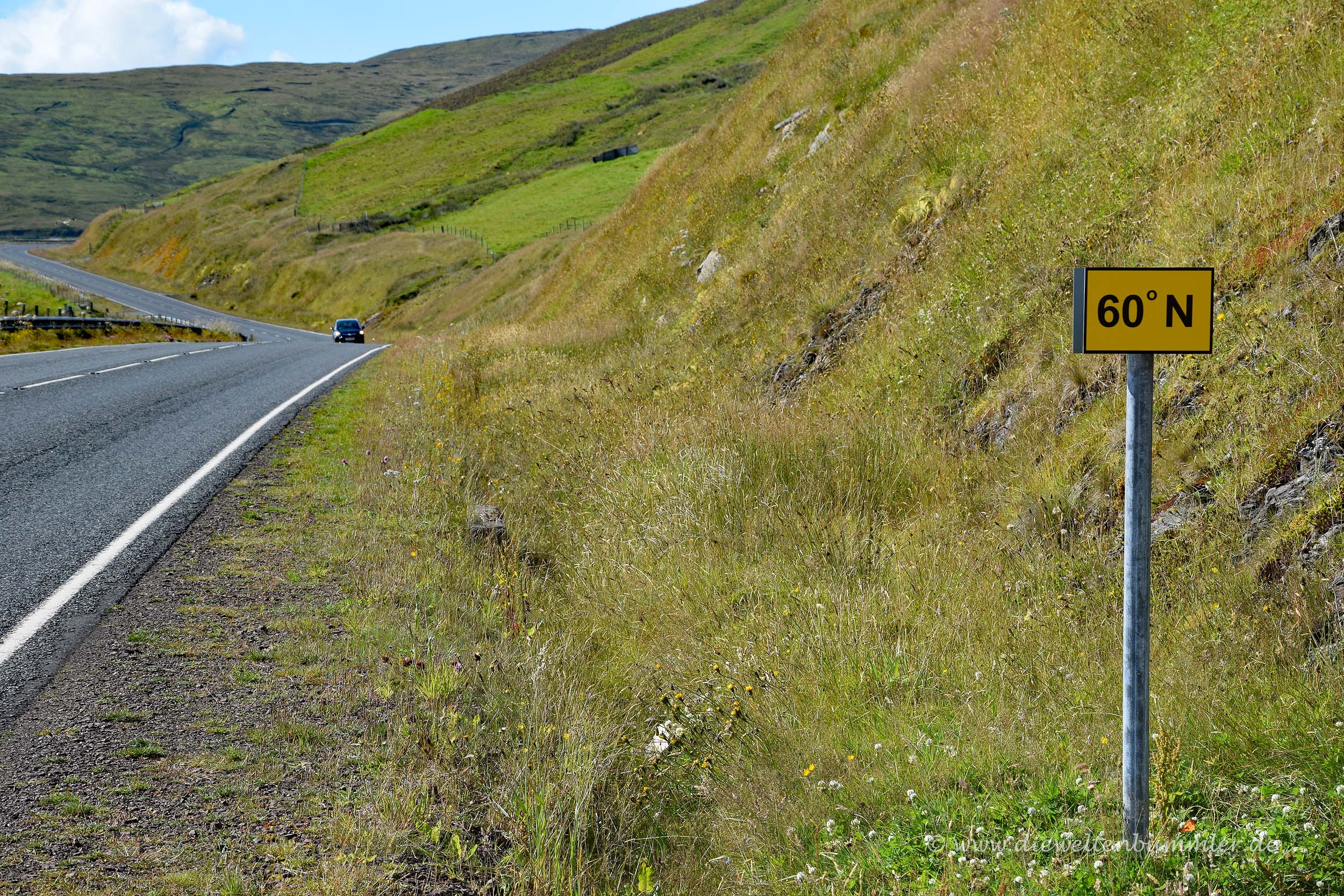 Den 60. Breitengrad kann man natürlich an verschiedenen Orten der Erde besuchen. Er verläuft knapp nördlich von Oslo und Stockholm, wiederum etwas südlicher als Helsinki, dafür aber genau durch St. Petersburg. Er kratzt außerdem auch an den Åland-Inseln, die ich schon vor einiger Zeit mit dem Wohnmobil bereiste. Aber nirgendwo an diesen Orten habe ich eine Markierung hierfür entdeckt. So aber auf den Shetland-Inseln. Und das sogar ziemlich zufällig, denn ich fuhr auf der Hauptinsel Mainland nach Süden, als ich zwei kleine schwarz-gelbe Hinweisschilder am Straßenrand sah, die auf den 60. Breitengrad hinwiesen. Da habe ich also nach der Markierung des 50. Breitengrades nun auch eine für den 60. Breitengrad in meiner Sammlung.