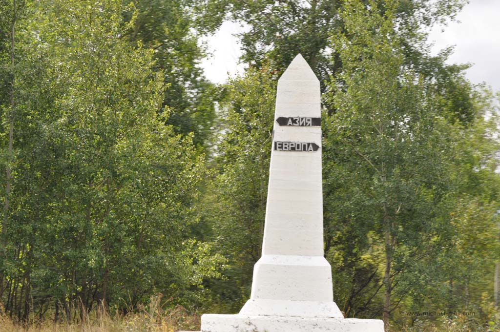 Eine richtige Grenze zwischen Asien und Europa existiert natürlich nicht. Dennoch gibt es einige Obelisken, die einen Grenzverlauf andeuten. Einen davon konnte ich mit der Kamera erwischen, als wir mit der Transsibirischen Eisenbahn von Peking nach Moskau fuhren. Auf der Hinfahrt Richtung Asien haben wir den Obelisken nicht gesehen, da wir den Ort in der Nacht passierten.