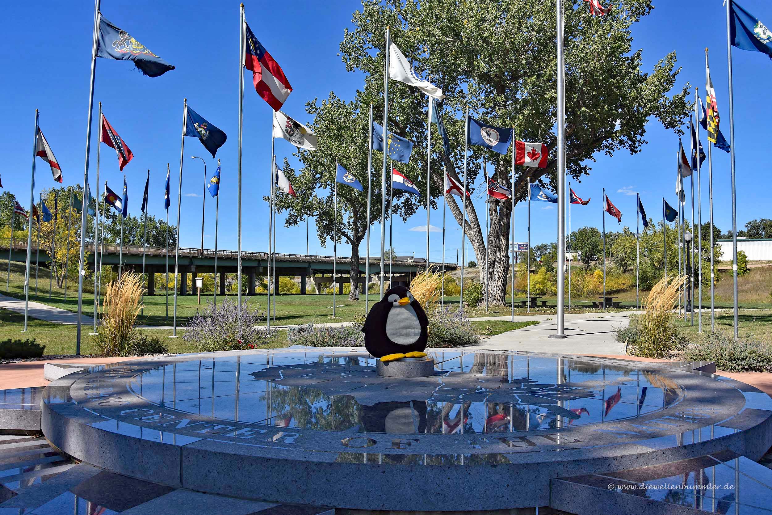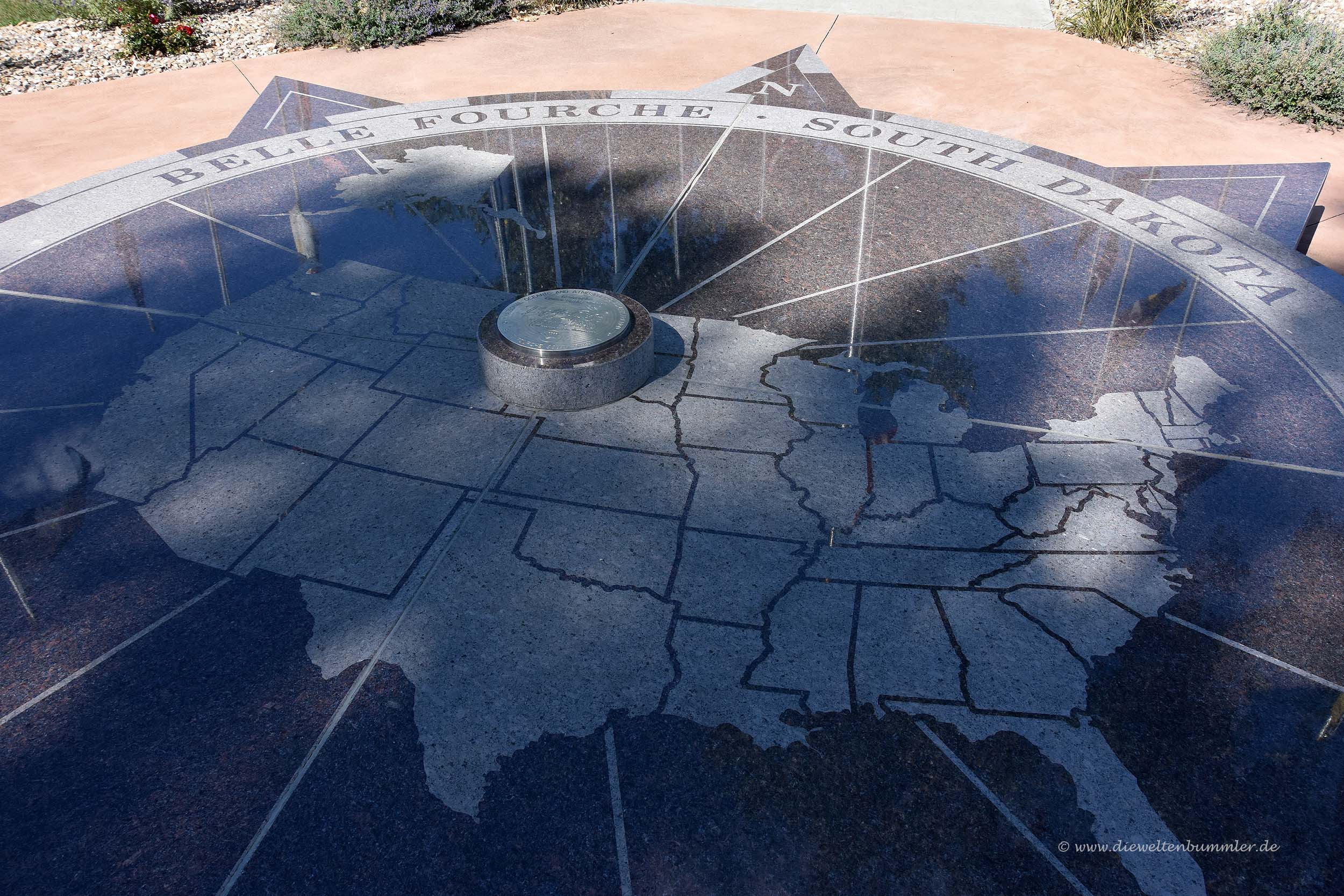 Jedoch ist die Lage der Markierung nicht ganz richtig. Sie wurde, wie das nicht selten vorkommt, stellvertretend für den wahren Mittelpunkt an das Tourismuscenter in der nächstgelegenen Ortschaft Bellefourche installiert. Dort befindet sich eine große Gedenkplatte, in die die Vereinigten Staaten von Amerika eingraviert sind. Gleich daneben erheben sich zahlreiche Masten, an denen entsprechen die Fahnen der einzelnen Bundesstaaten wehen. Kurioserweise habe ich hier auch die Flagge Kanadas wehen sehen, was ich mir zugegebenermaßen nicht erklären konnte.