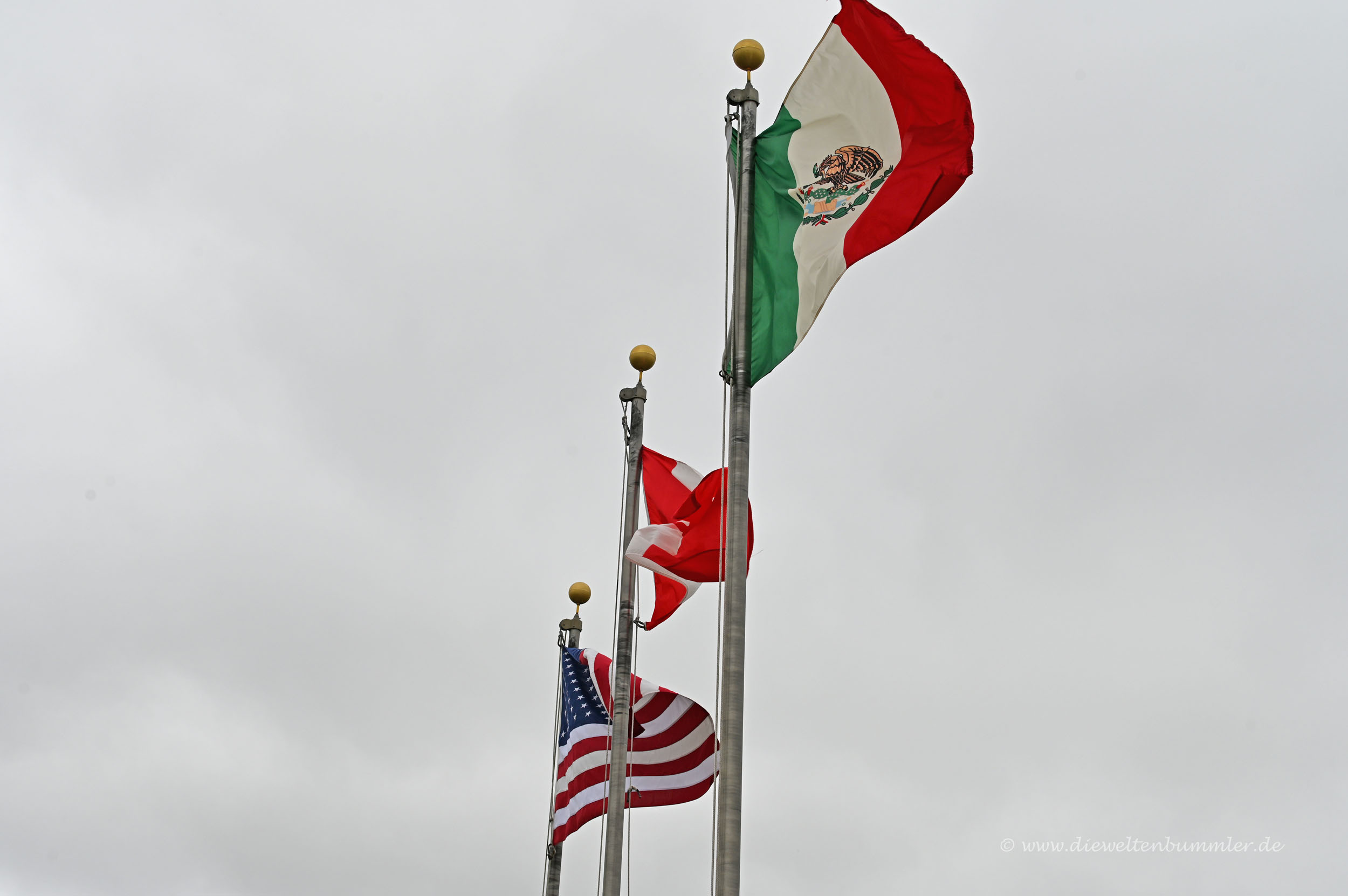 Wie auch immer. Wir standen nun hier vor dem geografischen Mittelpunkt von Nordamerika. Ob der Obelisk das nun ist oder ob er bloß als Symbol aufgestellt wurde, was soll’s? Nicht ganz verstanden habe ich allerdings den Schilderbaum, der in alle vier Richtungen zeigt. Okay, in Richtung Süden ist Acapulco in Mexiko ausgeschildert. Das nehme ich jetzt einfach mal so hin, weil ich ganz sicher nicht die Grenze zwischen Nord- und Mittelamerika definieren kann. Dafür hängt aber neben der US-amerikanischen und der kanadischen Flagge auch noch die mexikanische. Schön, das zu sehen . Dass es gleich nebenan ein mexikanisches Restaurant gibt, wird wohl wieder nur Zufall sein.