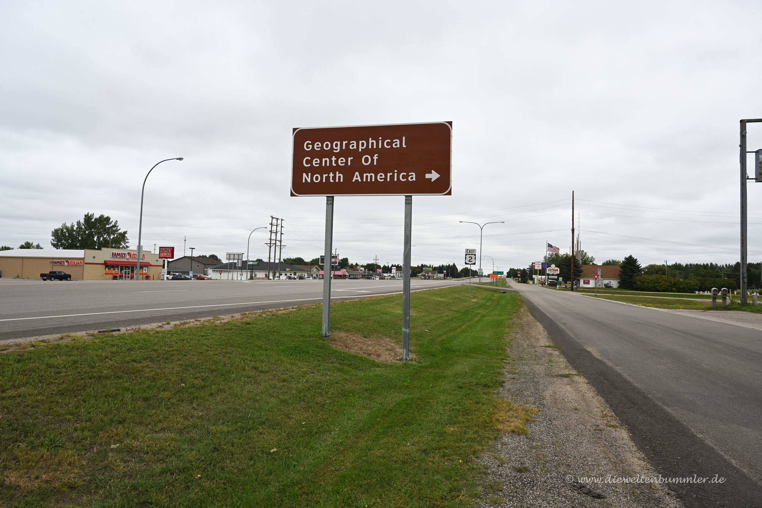 Doch wie es der Zufall wohl in der Tat so will, war das genau die richtige Strecke. Denn einige Meilen vor Rugby tauchte am Straßenrand plötzlich ein Schild mit dem Hinweis auf, dass sich in Rugby der geografische Mittelpunkt von Nordamerika befinden würde. Wir stutzten erst, denn den geografischen Mittelpunkt der USA hatten wir ja bereits auf unserem letzten Roadtrip drei Jahre besucht – übrigens auch durch einen Zufall.