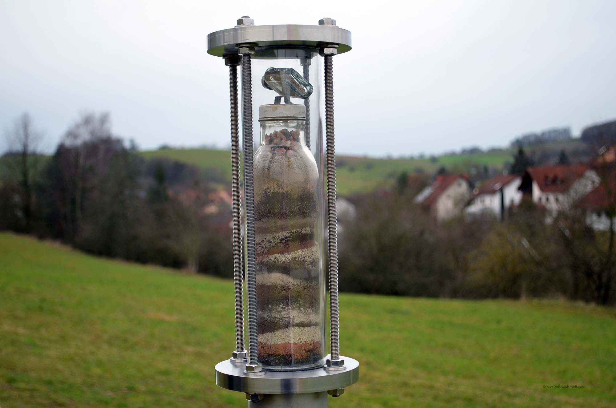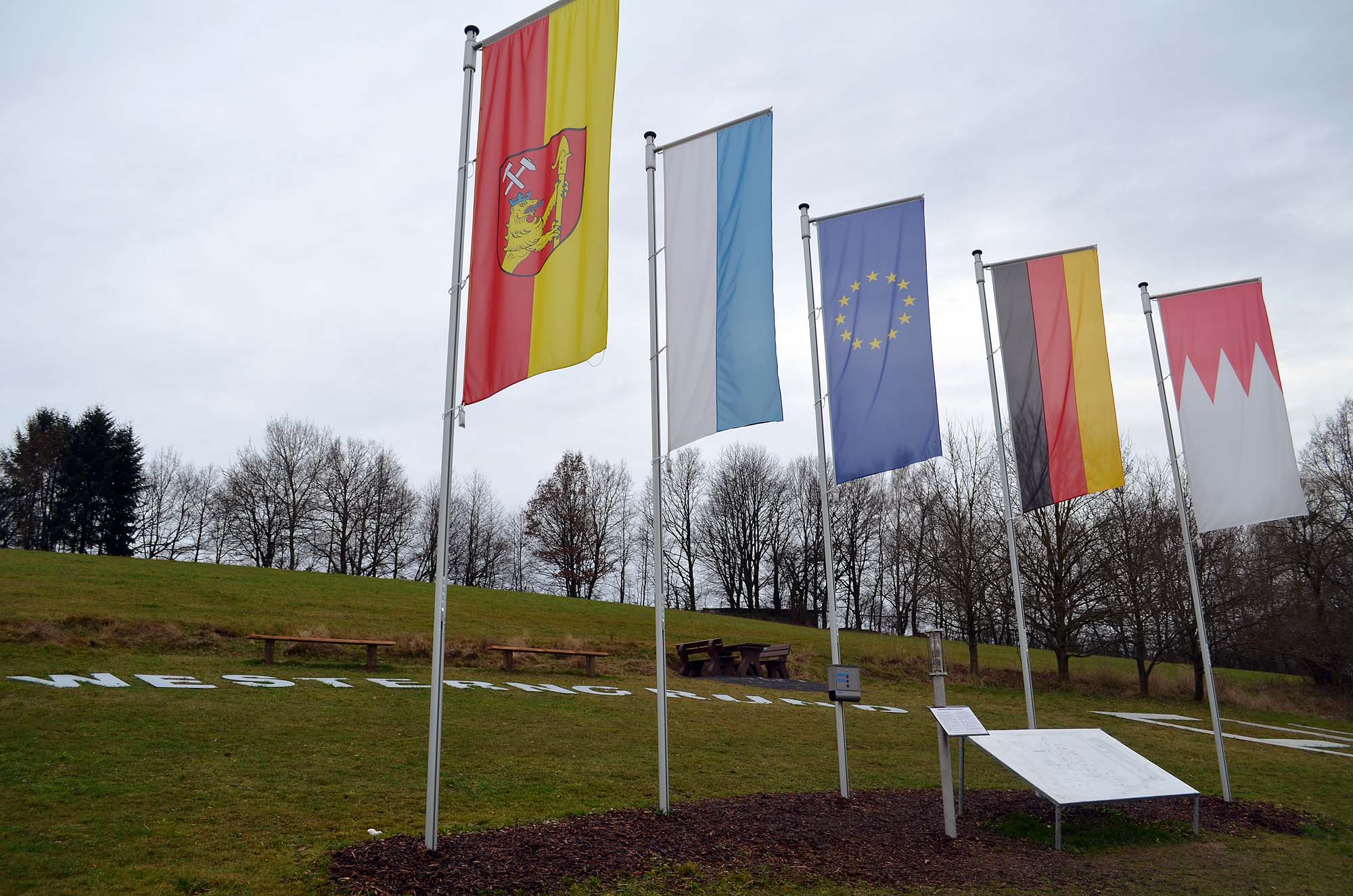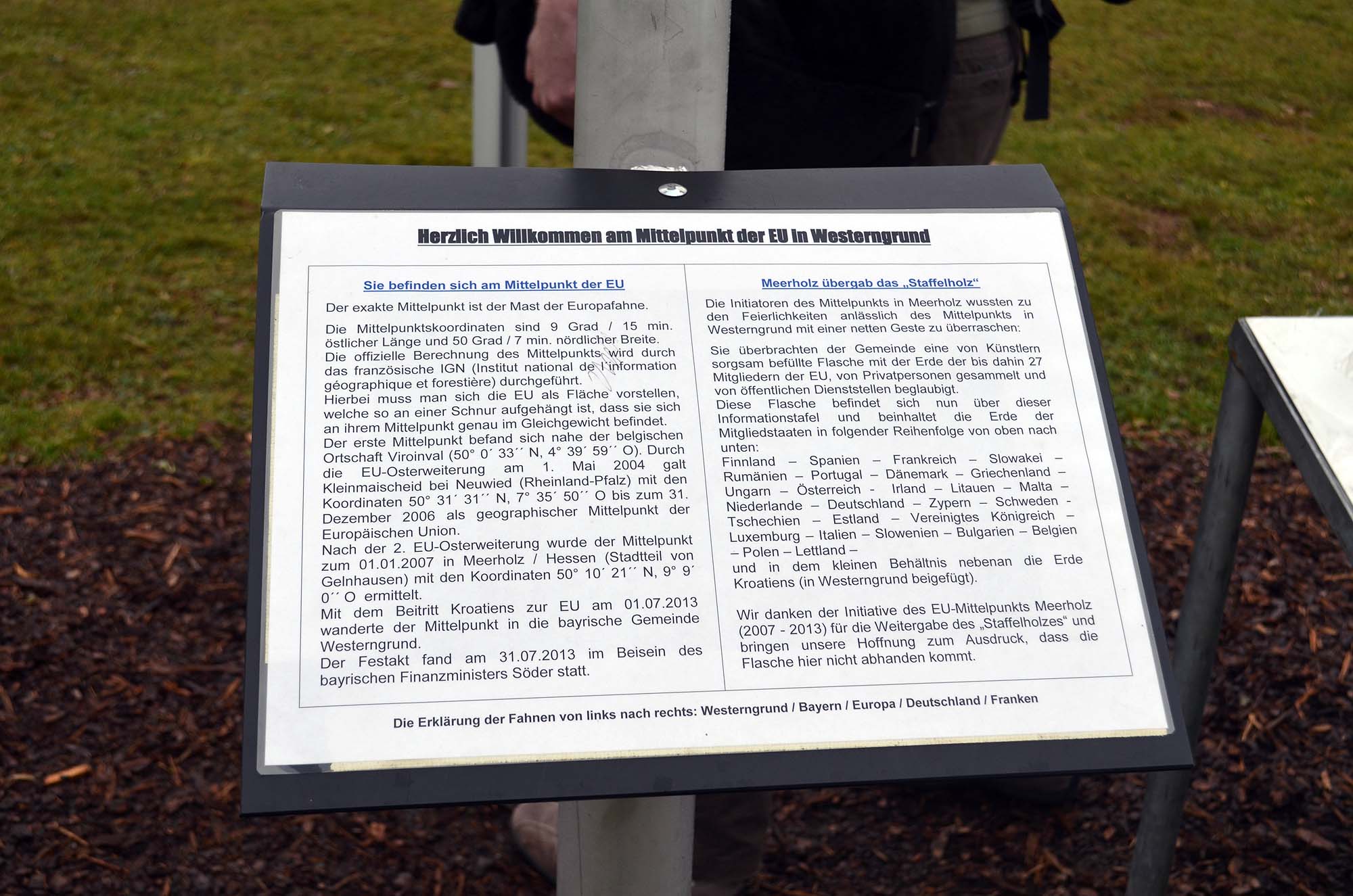 Recht zügig hat man dort einige Fahnenmasten aufgestellt und den Ortsnamen Westerngrund in großen Lettern auf einem Feld vererwigt. Aber nett ist, dass die Initiatoren des vorherigen Mittelpunktes, die eben gar nicht so weit weg wohnen, eine Flasche mit Erde aus den bis dahin 27 beteiligten Nationen und einer weiteren kleinen Flasche mit Erde aus Kroatien als neues EU-Mitglied.
