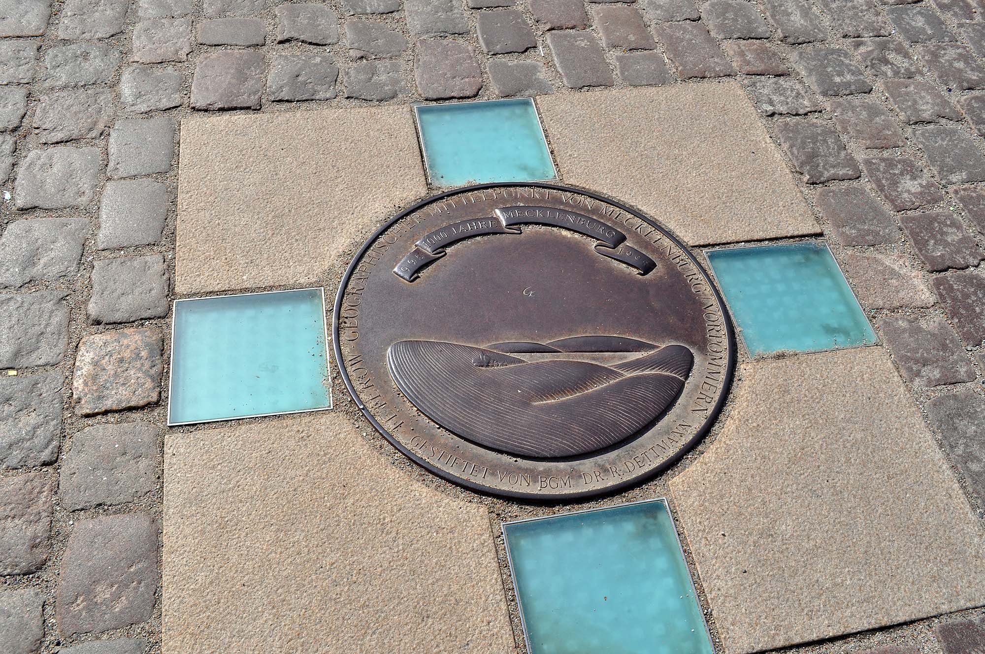 Ich erlaube mir, diesen Mittelpunkt ein wenig in Zweifel zu ziehen.. Denn die auf dem Foto gezeigte Markierung befindet sich auf dem zentralen Marktplatz von Teterow, exakt vor dem Portal des Rathauses. Diese Konstellation ist mir ein wenig zu zufällig und scheint mir eher als Symbol für einen in der Nähe liegenden Punkt zu dienen. Aber egal, es war eine schöne VW-Bus-Tour durch Mecklenburg-Vorpommern.