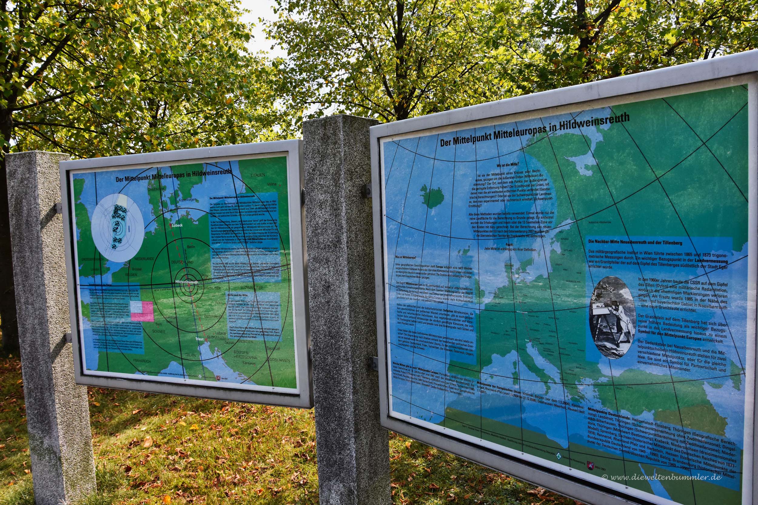 Zwei große Infotafeln erläutern diesen geografischen Mittelpunkt von Mitteleuropa. Einerseits wird ganz gut erklärt, dass es keine klare Abgrenzung gibt, wo Mitteleuropa beginnt oder aufhört. Hier müsste man kulturelle oder politische Grenzen ziehen. Andererseits wird aber auch darüber informiert, dass die Berechnung dieses Mittelpunkts auf Maßgaben des 18. Jahrhunderts zurück gehen.