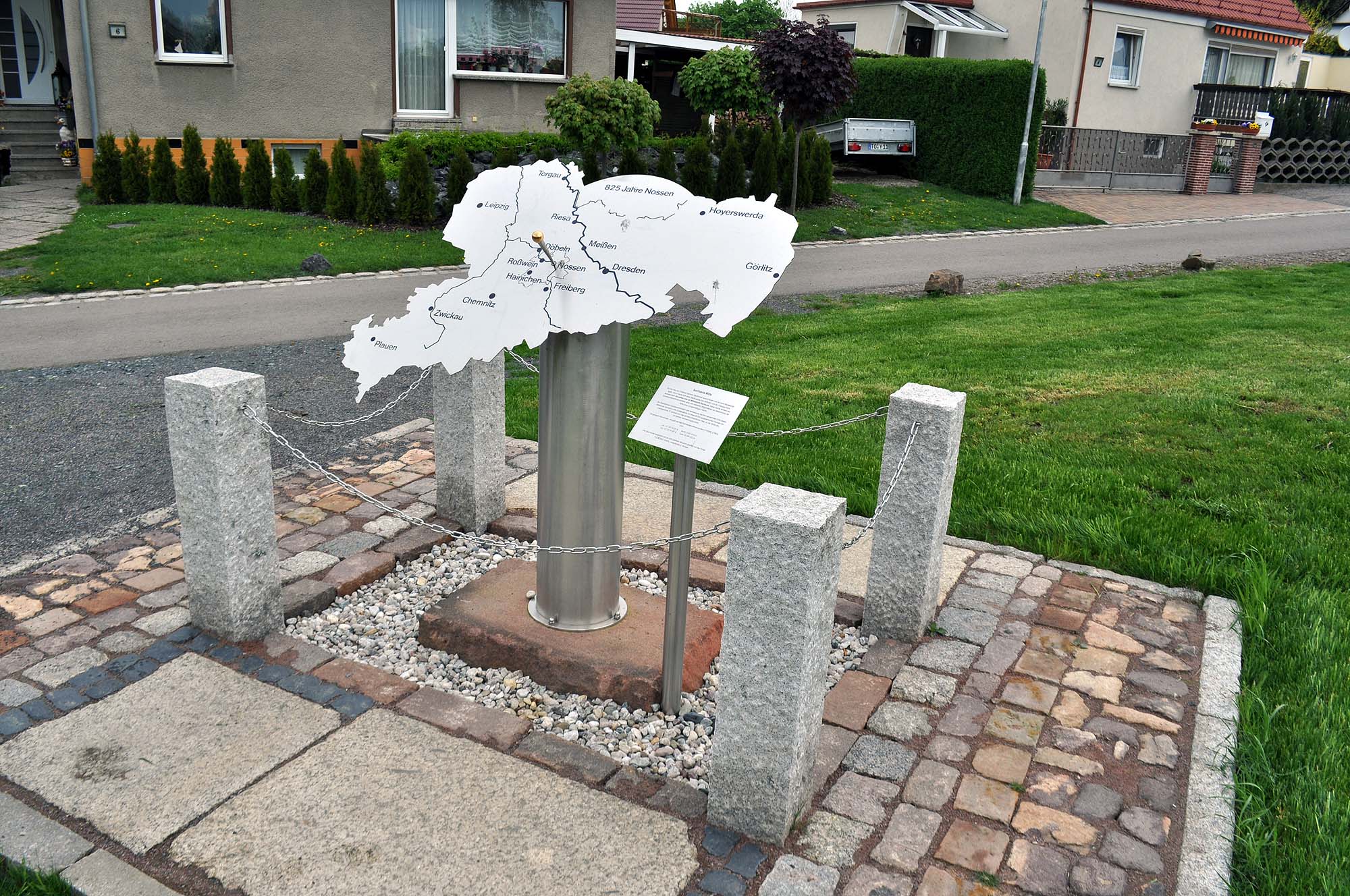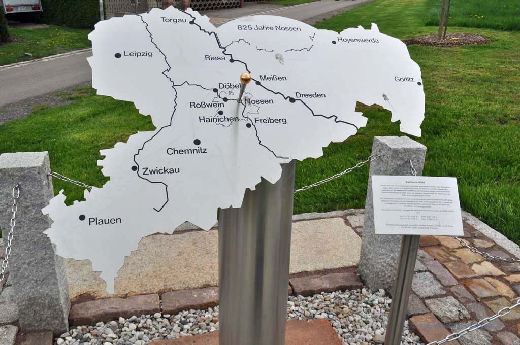 Sachsen gehört zu den Bundesländern, die sich den Luxus von zwei Mittelpunkten leisten. Im Hirschfelder Weg der Ortschaft Nossen, eingezwängt zwischen zwei Autobahnen, befindet sich eines der Zentren Sachsens. Errichtet wurde das Denkmal erst im Jahr 2010, nachdem bis dahin lange Zeit das rund 20 Kilometer entfernte Hartha als Mittelpunkt galt. Prompt war ich 2011 mit dem VW-Bus nach einer Polenreise dort.