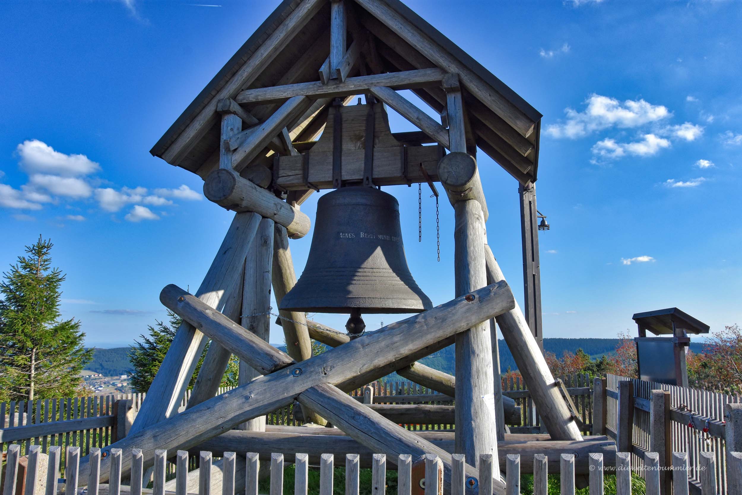 Darüber hinaus gibt es auf der Südseite des Gipfelplateaus einige schöne geschnitzte Holzskulpturen und eine Friedensglocke. Von ihrem Standort aus blickt man weit nach Tschechien rein, wo man neben dem Klínovec noch einige andere kleinere Gipfel des Erzgebirges sieht. Nach Norden hin ist der Blick noch freier und man hat einen tollen Ausblick über das relativ flache Sachsen.