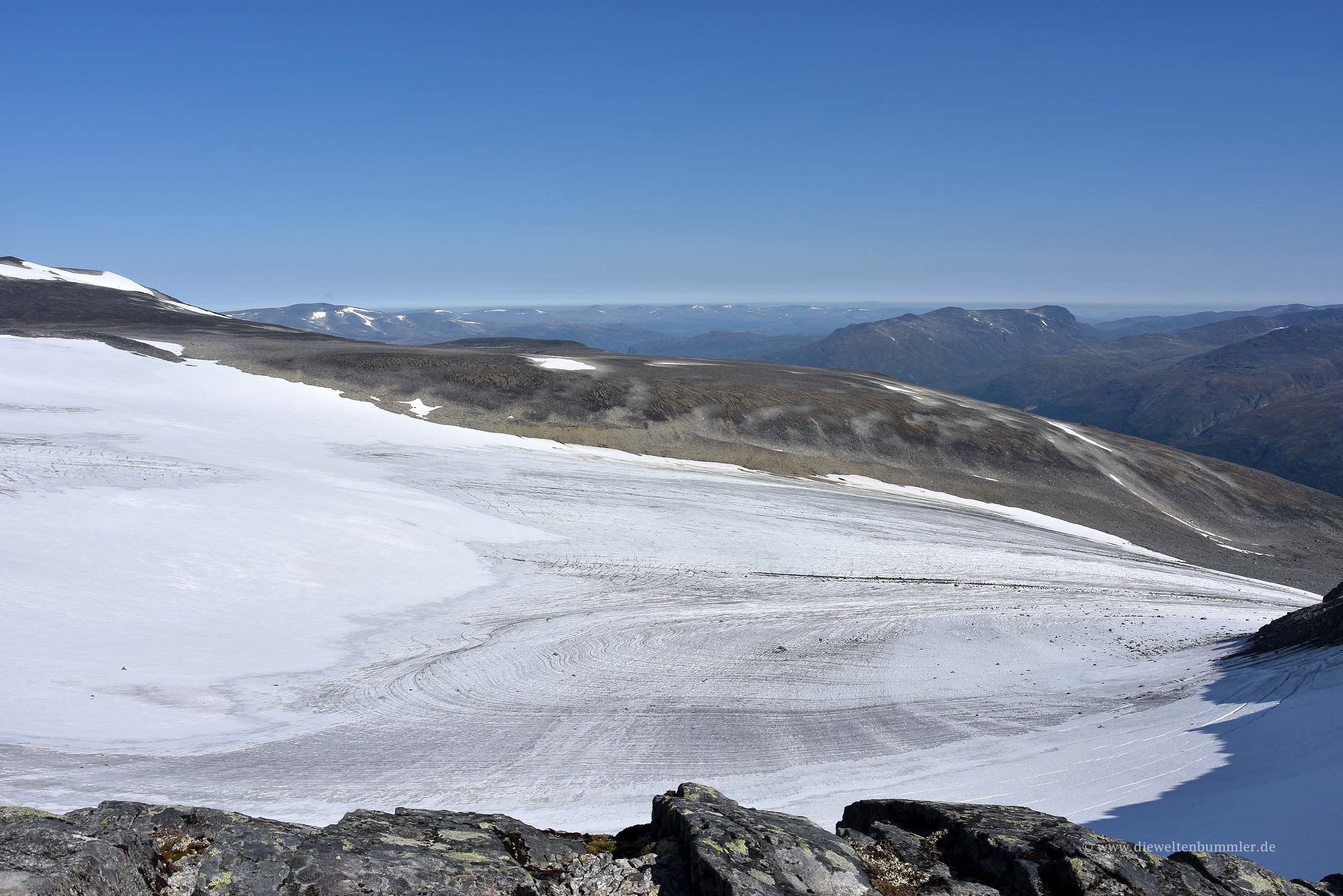 Am Anfang wandert man nämlich die ganze Zeit bergauf und hat dabei nur den Svellnose im Blick. Dieser Berg ist jedoch „nur“ 2.272 Meter hoch. Das gute an der Svellnose ist, dass man ihn nicht komplett überqueren muss (aber man kann es, wenn man möchte). Vielmehr wandert man knapp unterhalb des Gipfels an der Nordflanke entlang und genießt dabei noch den Ausblick auf den nördlich gelegenen Styggebreen, also dem Styggegletscher.