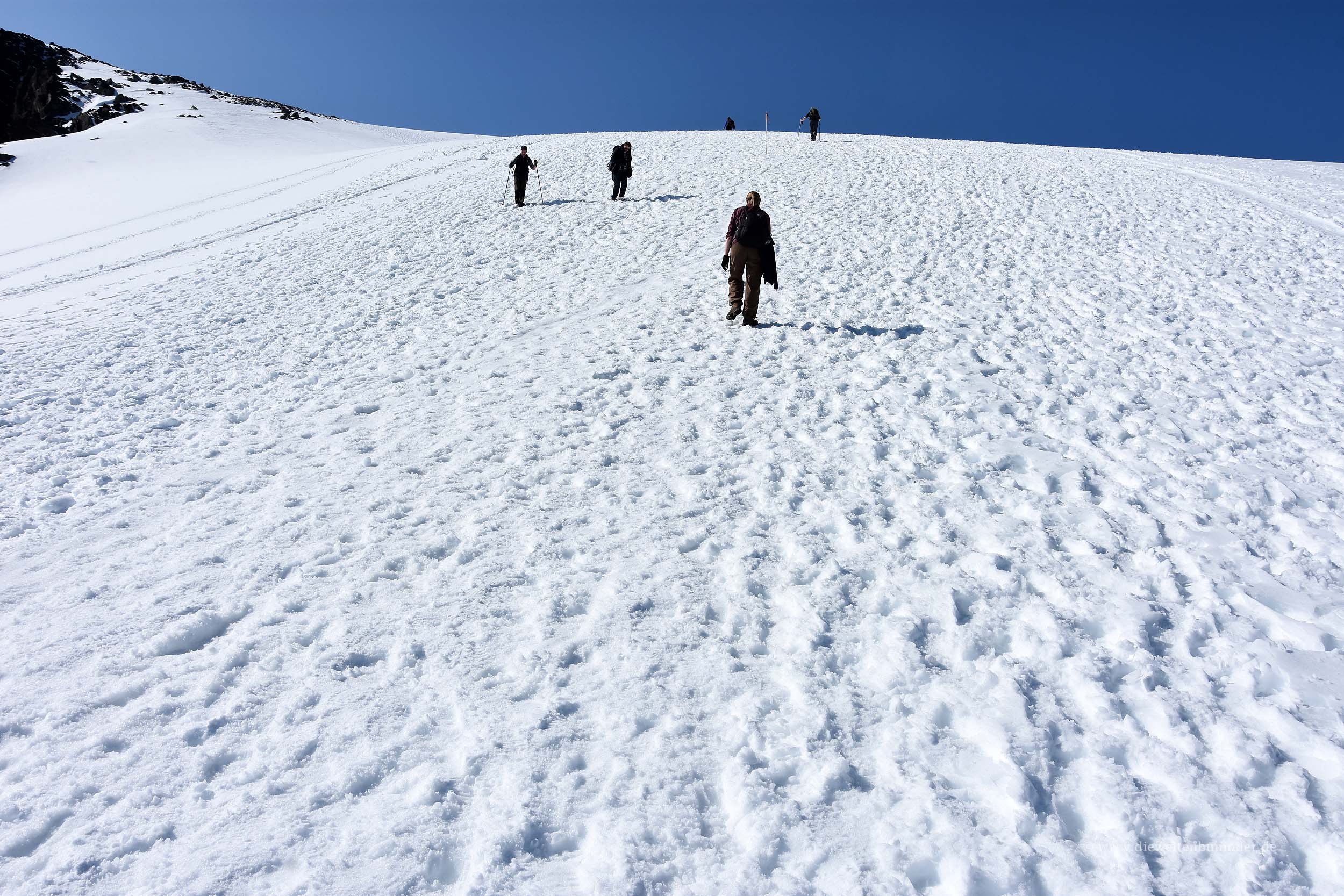 Hat man die Svellnose umrundet, blickt man gleich dahinter auf den nächsten Gipfel. Auch dieser ist noch nicht der Galdhøppigen, sondern erst das Keilhaus Topp mit 2.355 Metern. Und auch diesen Gipfel muss man noch hinter sich lassen und sogar wieder ein kurzes Stück bergab gehen. Das kann ein wenig anstrengend werden, wenn man ständig irgendwelche Gipfel sieht, aber nie das eigentliche Ziel vor Augen hat.