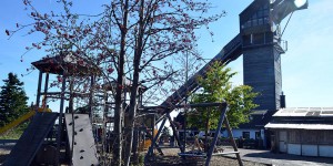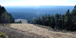 Gleichzeitig kamen vom Gipfel einige Touristen mit sogenannten Monsterrollern – Roller auf übergroßen Luftreifen. Das alleine erinnerte schon ein wenig an einen Freizeitpark. Oben angekommen nahm ich die Treppen, die neben der Skischanze bis auf den höchsten Punkt führen. Gleich neben der Skischanze befindet sich zudem ein Wirtshaus, in dem der Betreiber gerade unter dem Vorwand eines Oktoberfestes meinte, den gesamten Harz beschallen zu müssen, ein Streichelzoo, die Bergstation einer Seilbahn und die neue Bergstation eines Sessellifs, der erst in der kommenden Wintersaison 2013/14 eröffnet würde. Für letzteres entstand ungefähr auf der Hälfte zwischen Braunlage und dem Gipfel ein überdimensionaler Parkplatz und natürlich eine weitere Schneise im Wald, damit die Wintersportler hinab fahren können.