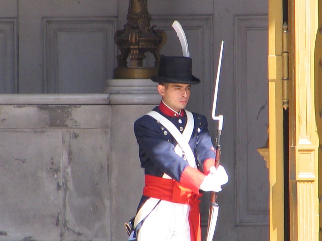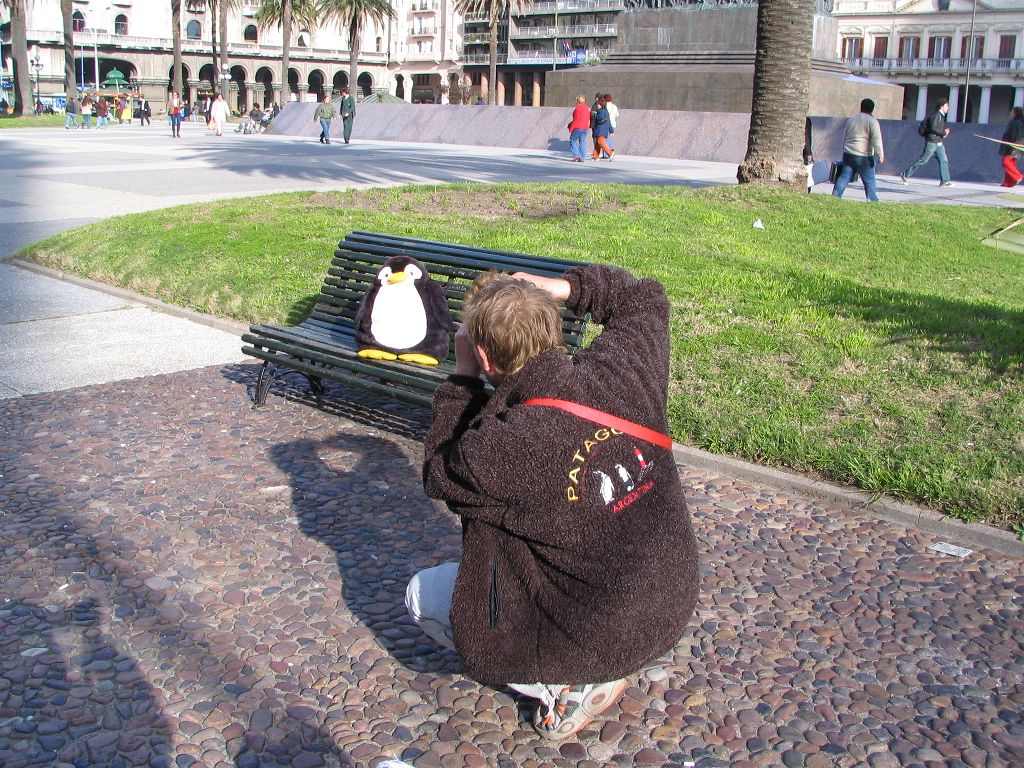 Ein paar Soldaten, diese wenigstens in Uniform, frage ich, ob wir ein Bild von unserem Stoffpinguin vor der Nationalflagge machen dürfen. Freundlich wird genickt und Platz gemacht für die Verrückten, die ein Stofftier ablichten, während um uns herum in dem hektischen Grenzgewimmel ab und an das Wort „Pinguino“ zu hören ist.