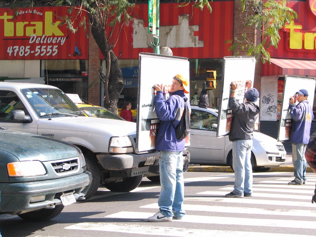 Am Busbahnhof von Posadas erkundigen wir uns lange in den verschiedenen Räumen der Busgesellschaften nach Preisen und Möglichkeiten, weiter in den Süden Argentiniens vorzudringen. Immerhin wollen wir endlich zu den Pinguinen an der Küste Patagoniens. Es gibt schäbige, kleine, verrauchte Büros, die nur 2 qm groß sind und klimagekühlte Ladenlokale, die ein vielfaches größer sind und in denen die englischsprachigen Angestellten uniformiert sind. Alle Wege nach Patagonien führen aber zunächst über die Hauptstadt Buenos Aires, wo man immer umsteigen muss. Und alle Gesellschaften erklären uns, dass das Auseinandernehmen der Fahrräder unvermeidbar sei. Da die Preise nur geringfügig abweichten, aber dennoch die Bequemlichkeit der Busse sehr unterschiedlich ist, entscheiden wir uns für eine der größeren und dem Anschein nach sichere Buslinie: Via Bariloche. Da die Räder nicht nur auseinander genommen werden müssen, sondern auch noch alles umständlich in Kartons verpackt sein soll, entscheiden wir uns dafür, die rund 1.000 km lange Strecke in einem Stück zu fahren und auf einen Zwischenstopp in Uruguay zu verzichten. Wir beschließen, das kleine Land zu einem Berühren verboten-Schildspäteren Zeitpunkt von Buenos Aires aus zu besichtigen. Da wir Posadas Sehenswürdigkeiten, nämlich eine 100 m lange Einkaufsstraße, nun zu Genüge kennen, begeben wir uns schon am Mittag des nächsten Tages zum Bahnhof, obwohl der Bus erst um 20 Uhr abfährt.