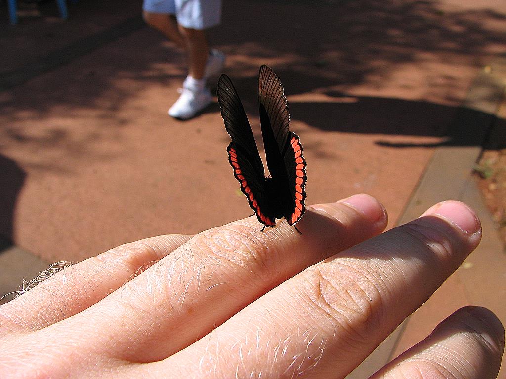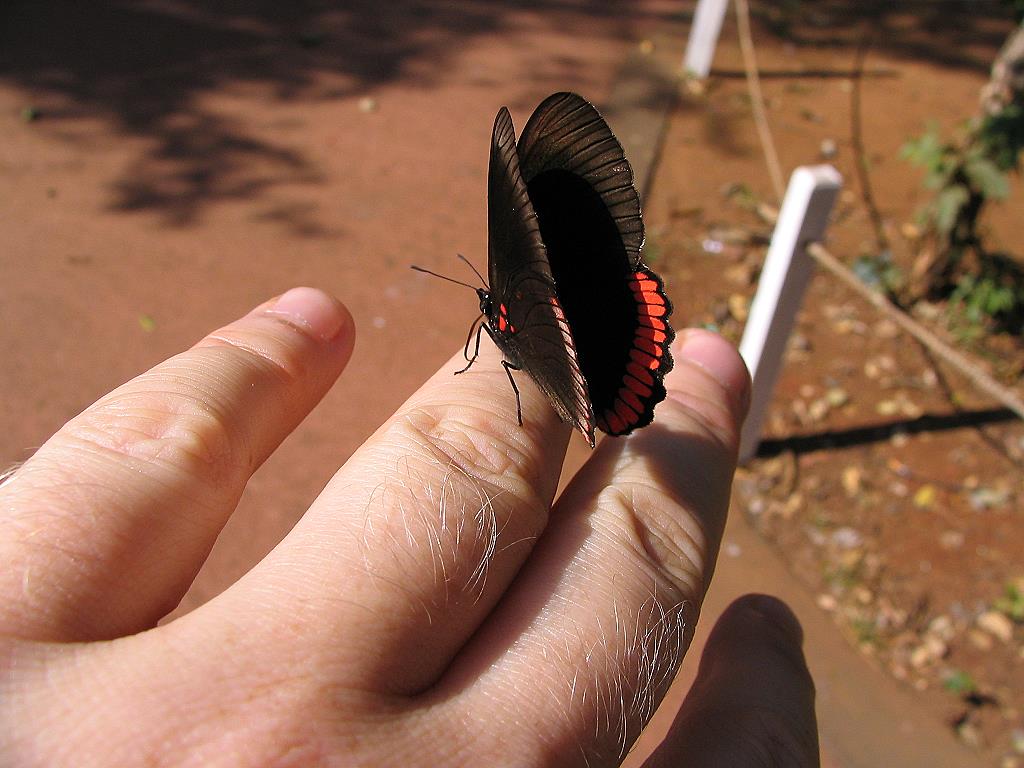 Ohne anzuhalten fahren wir an einer der vielen argentinischen Polizeikontrollen vorbei. Diese sind stationär und halten wahllos ankommende Fahrzeuge an. Das Ganze erinnert sehr an unsere letztjährige Reise nach Russland, man kann aber auch behaupten, an Überwachung. Mit diesen Polizeikontrollen, deren Orte anscheinend willkürlich festgelegt wurden, habe ich nicht das Gefühl, mich in diesem Land frei bewegen zu können. Ich zumindest, finde diese Angelegenheit suspekt. Bei der zweiten Kontrolle halten wir jedoch an, weil sich gleichzeitig im Büro die Touristeninformation von Posadas befindet. Gleichzeitig wird es dahinter auf den Straßen lauter, hektischer und dreckiger. Wir müssen regelrecht Staub schlucken, von den Abgasen ganz zu schweigen, um in die rechtwinklig angelegten Straßen des Zentrums zu gelangen. Die Hotelsuche ist natürlich nicht ganz einfach. Das erste Hotel ist, das zweite ist arrogant und die beiden ach so smarten Typen an der Rezeption haben uns als Gäste vergrault, indem sie beim Anblick zweier abgekämpfter Radler –nämlich uns- hämisch lachen. Dann halt nicht. Beim dritten waren wir willkommen und ich werde zur Zimmerbesichtigung gleich mal in den Fahrstuhl verfrachtet, der erst in der 10. Etage anhält. Das Zimmer ist soweit okay, aber auf die angepriesene Aussicht auf die Stadt können wir getrost Schmetterling auf der Handverzichten. Ich bitte um ein Zimmer wesentlich weiter unten im Haus. Den südamerikanischen Rettungswegen traue ich dann doch nicht so recht. Und überhaupt, ich bin nicht drei Wochen Schiff gefahren und habe das Flugzeug vermieden um in einem argentinischen Hochhaus mit dem Fahrstuhl abzustürzen. Also gehe ich brav wieder zu Fuß hinab.