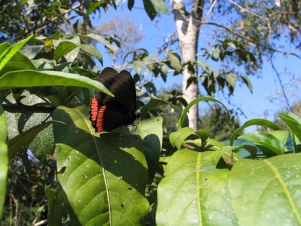 Stockdunkel ist es auf der Ruta 12, die uns die nächsten 60 Kilometer nach Süden bringen soll. Also ziehen wir unsere Warnwesten über den dünnen Pulli und legen los. Nach einer halben Stunde Fahrt Neuer Weg durch den Nationalparkziehen wir sie wieder aus. Nicht, weil es hell genug ist, sondern weil es anfängt zu regnen. Es war ja klar, dass es anfängt zu regnen, sobald wir die Fahrradlenker in der Hand haben. Also Regenjacke an, Warnweste darüber und weiter geht es. Die Region Misiones ist hügelig und –abgesehen von den Andenregionen- die wohl hügeligste Region des Landes. Und nachdem nun auch die Sonne hervor kommt, beginnen wir schließlich zu schwitzen – also Regenjacke wieder aus.