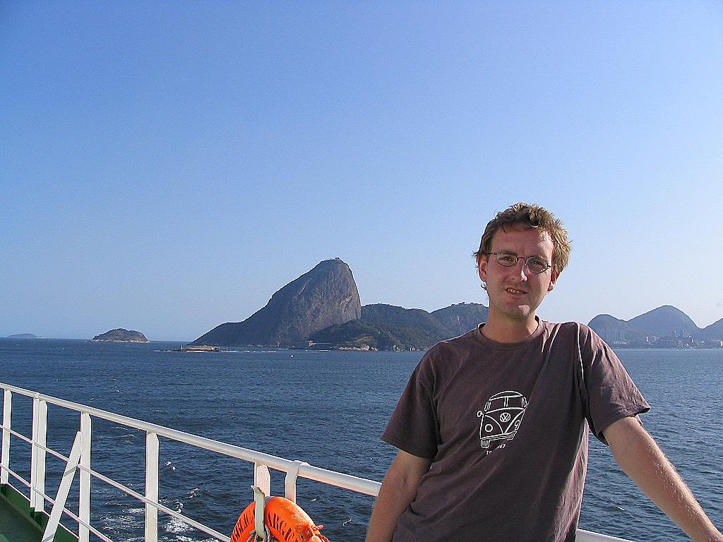 Am Nachmittag saß ich auf Deck und hörte Deutsche Welle. Während es also aus dem Weltempfänger krächzte und quäkte, blickte ich gedankenverloren auf das Meer und sah ein sehr kleines Fischerboot. Meine Verwunderung darüber, dass so weit draußen ein so kleines Schiffchen sein soll, ließ mich neugierig aufstehen, damit ich über das Schiffsdach hinweg auf die andere Seite unseres Frachters blicken konnte. Und siehe da, was erhebt sich da quasi vor meiner Nase? Der Zuckerhut von Rio de Janeiro. Wir waren also schon da. Ich holte Moni aus der Kabine und wir schauten uns an, wie wir uns der weltberühmten Copacabana näherten. Man sah den Strand und direkt dahinter die Promenade mit unzähligen Hochhäusern. Ich versuchte durch das Fernglas die einzelnen Gebäude zu zählen, aber nach rund drei Dutzend gab ich auf und dabei habe ich gerade einmal auf einen Bruchteil des Küstenabschnittes geblickt. Rechts davon erhebt sich der berühmte Zuckerhut steil aus dem Meer und ich fragte Moni, was daran so besonderes sein soll. Sieht doch genauso aus wie die Loreley am Rhein. Und über allem thront die nicht weniger berühmte Jesus-Christus-Figur, die aus der Dunstglocke der Stadt heraus schaut.