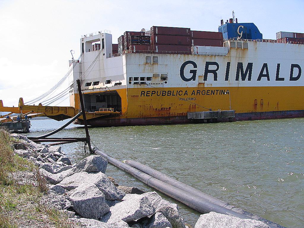 Wir sehen die Wohnmobile wie sie in einer Schlange auf die Einreise warten. Sie kommen gerade von ”unserem” Schiff und stammen aus Deutschland und Frankreich, doch nur ein französisches Pärchen erkennt in uns europäische Touristen und winkt freundlich. Nachdem sich die Tore für sie öffnen und sie nun durch das Land reisen können, erklärt uns Senor Orsini, dass auf jedem Grimaldi-Schiff europäische Touristen sind. Fast alle kommen aus Frankreich, Deutschland und natürlich Holland. Doch jetzt sind wir an der Reihe, immerhin wollen wir endlich nach langer Wartezeit auf die ”Repubblica Argentina”, die uns wieder heim nach Europa bringen soll. Sie befindet sich nur rund 100 m von uns entfernt, doch man verbietet uns auf eigene Faust zum Schiff zu gehen. Jeder, der sich im Hafen befindet, muss den Pendelbus benutzen. Da dürfen wir keine Ausnahme machen. Wo kämen wir denn da hin, wenn wir die argentinische Bürokratie nicht einhielten? Wahrscheinlich zum Schiff aber so…