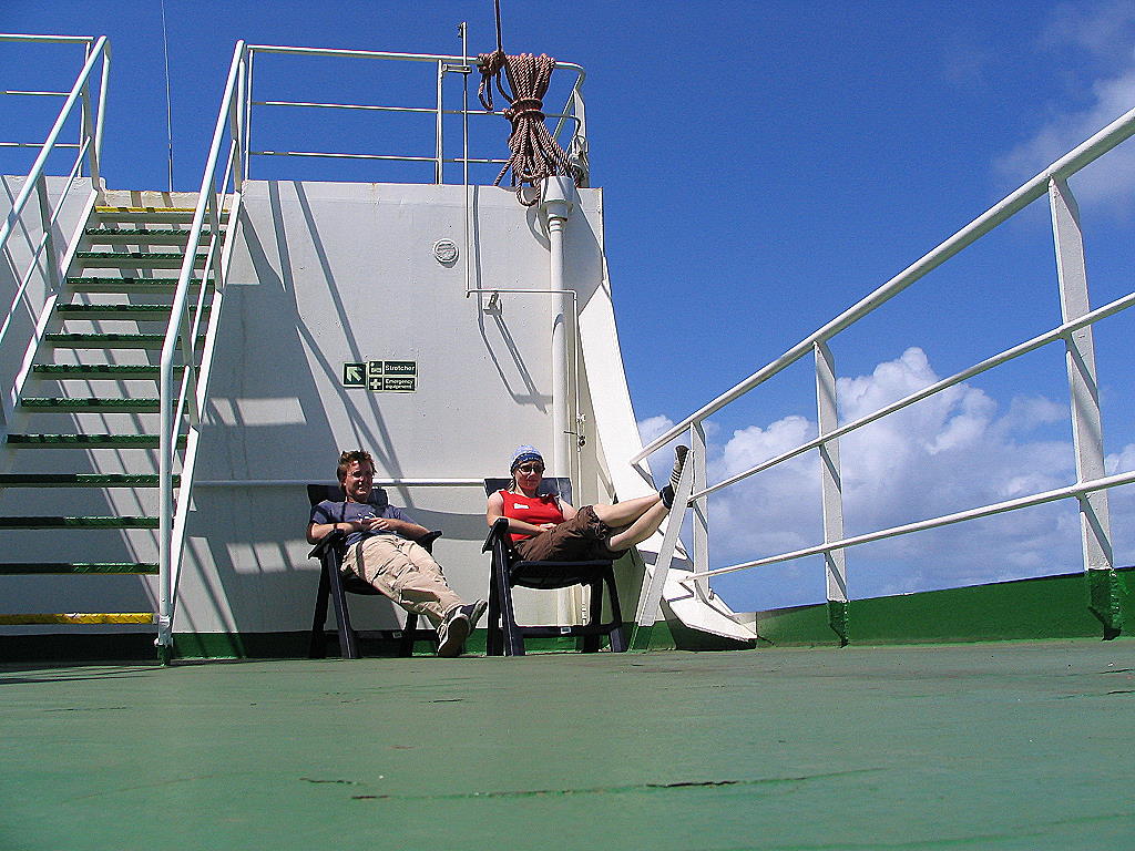 Eines ist dabei sofort offensichtlich: Alles ist hier anders als auf unserer ersten Frachtschiffreise. Die Kabine ist bei weitem nicht so geräumig und luxuriös wie wir es kennen lernten. Auf Teppich, DVD und Haustelefon kann man natürlich verzichten. Weniger schön sind der fehlende Kühlschrank und das verschraubte Bullauge. Diese lässt sich dadurch nicht öffnen, womit das abendliche Nachrichtenhören bei der Deutschen Welle ausfällt, da man durch die Metallumhüllung der Kabine keinen Empfang hat. Ungewohnt auch, dass wir nun in zwei ”echten” Kojen schlafen müssen, also in Doppelstockbetten. Moni entschied sich spontan für oben, schaute aber etwas irritiert, als ich sie daran erinnerte, dass sich das Schiff bewegen wird. Denn seltsamerweise gibt es keine ”Rausfall-Schutzhalterung”. Vielleicht ein gutes Zeichen?