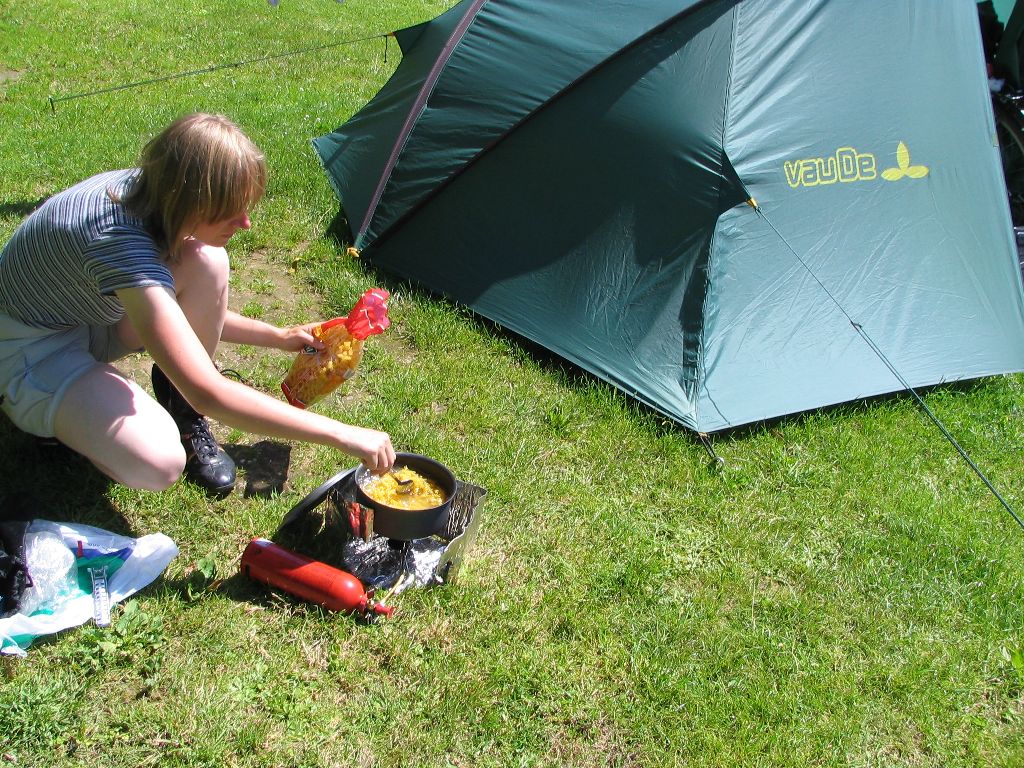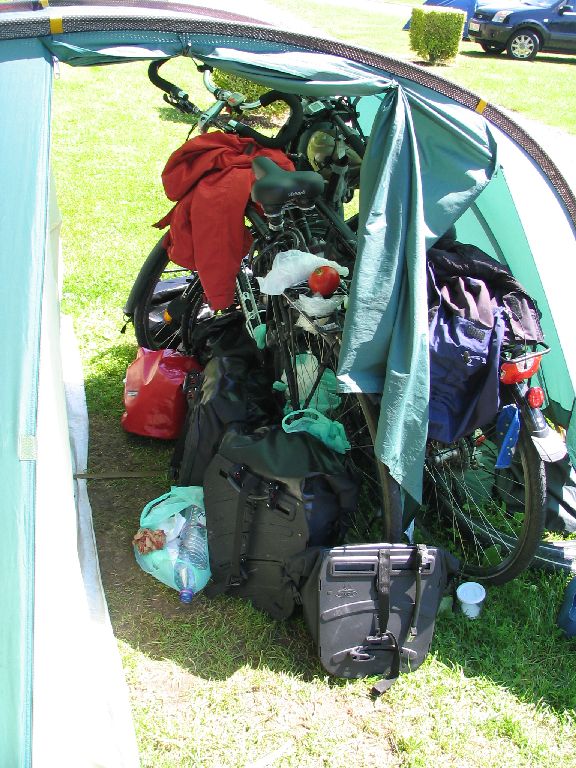 Dabei bestätigt sich sogar manches Klischee. Die genannten Engländer beispielsweise, ein älteres Ehepaar, fallen dadurch auf, dass von ihrer Parzelle eines Morgens Knister- und Brutzelgeräusche zu hören sind. Nachdem ich um die Ecke luge, sehe ich wie der britische Küchenchef Eier in der Pfanne wendet. Leise sage ich zu Moni, dass jetzt nur noch der Schinken fehle, als Frau Küchenchefin aus dem Vorzelt tritt und ihrem Mann genau diesen Schinken zum Anbraten reicht. Guten Appetit…