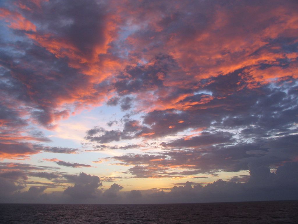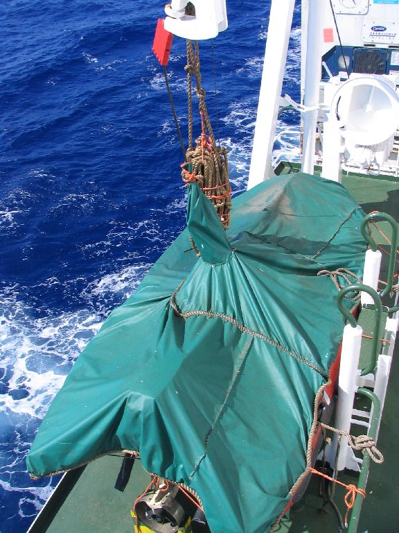 Am Abend schauten wir zu, wie am Himmel Schichtwechsel war und der Vollmond die Arbeit der Sonne übernahm. Als wir ins Bett gehen wollten spürte ich im Schlafzimmer, wie es plötzlich unter meinen Füßen feucht wurde. Ein Blick nach unten verrät, dass der Teppich auf einer größeren Fläche, von der Wand ausgehend, nass war. Alles klar, jetzt ist es soweit: Wir sinken! Völlig panisch wollte ich das Bullauge aufreißen und laut in die stille Dunkelheit SOS schreien, als mein Verstand wieder einsetzte und zu mir sagte: “Ihr seid im 3. Stock rund 15 m über der Wasseroberfläche. Würdet ihr sinken, hättet ihr es früher gemerkt.” So ging ich halt bloß runter zu den Matrosen und suchte jemanden, der weiterhelfen konnte. Doch wegen der späten Uhrzeit war dies nicht ganz so einfach. Vielleicht sinken wir ja doch und beim Evakuieren hat man uns vergessen? Ich kam am Mannschaftsraum der Matrosen vorbei, wo wieder irgendein Video aus dem Fernseher dröhnte. Zwei Matrosen erfreuten sich meines Anblickes und im selben Augenblick, wie ich “Good Evening” sagen konnte, hielt mir einer beiden auch schon eine Bierdose unter die Nase. Mit einem “No, thanks, diesmal nicht” erläuterte ich das Problem und einer der beiden schaute es sich umgehend an. Nach kurzem Hin und Her einigten wir uns aber darauf, dass das Problem morgen angegangen wird. 6. Tag Auf einer Reise, wie wir sie bestreiten, ist es immer wieder interessant dass man morgens nicht weiß, wo man abends zu Bett geht. Doch wenn man den Atlantik überquert und naturgemäß das Schiff nicht verlässt, sollte man glauben, dass dieses Reisegefühl anders sein wird. Doch was ist bei uns schon normal? Nach dem Frühstück klingelte unser Zimmertelefon und der Steward kündigte sich an um nach dem Wasserschaden zu sehen. Er brachte direkt einen Matrosen, den Maschinisten und einen der Offiziere mit. Alle schlenderten in unser Schlafzimmer und die Diagnose lautet: Umziehen. Sofort bekamen wir eine neue Kabine angeboten, die genau spiegelverkehrt gegenüber lag. Doch musste diese erst von den Matrosen aufgeräumt werden. So packten wir also unsere Sachen und bekamen das Gefühl auf Möbelpacker und Umzugshelfer zu warten. Nur zur Erinnerung: Wir befinden uns rund 500 km südwestlich der Azoren mitten auf dem Nordatlantik. Es wurde uns zwar auch Hilfe angeboten aber unsere paar Dinge trugen wir dann alleine rüber. Währenddessen kam auch noch der Kapitän und erfühlte durch Handauflegen, dass es sich nicht um Salzwasser handelte. Nach diesem kleinen Zwischenfall, verursacht durch ein defektes Rohr oder sonst irgendetwas nahmen wir unser Zelt und schlugen es auf Deck auf. Natürlich nicht so ganz, wir verbrachten bloß den Rest des Vormittages damit, den Zeltboden zu imprägnieren.