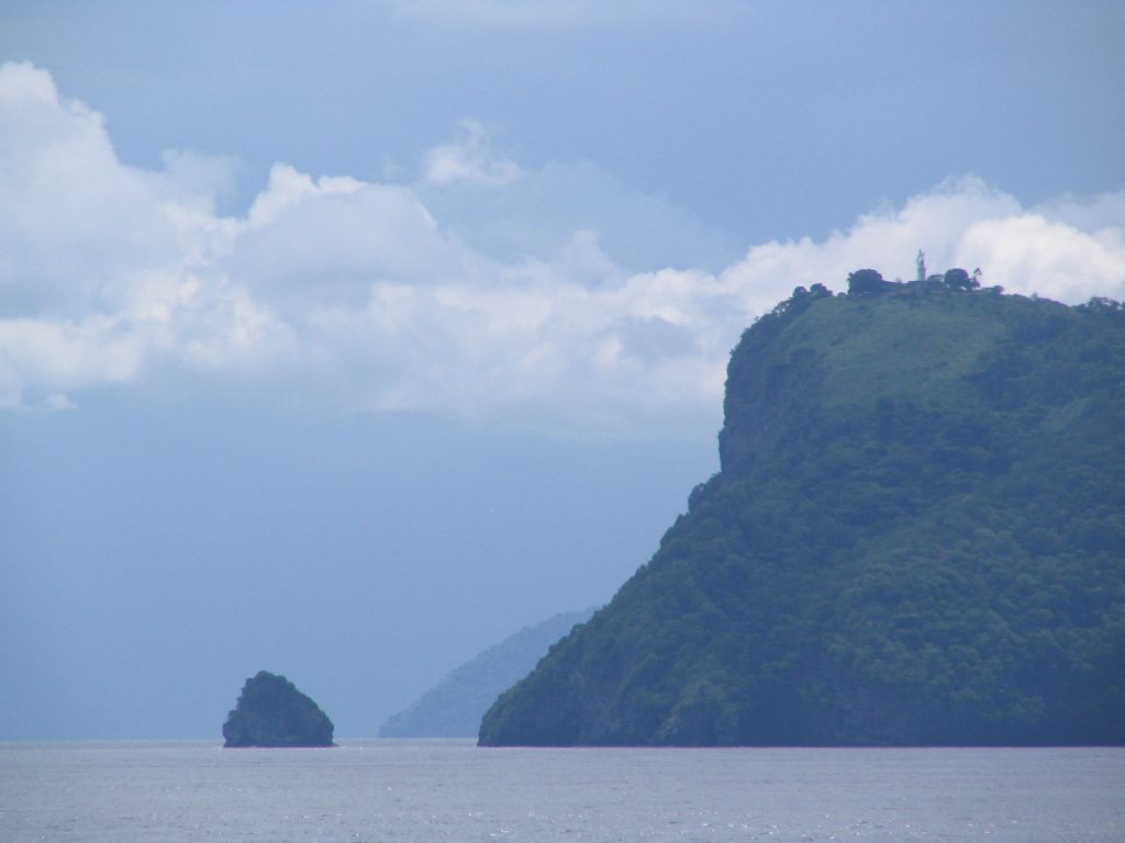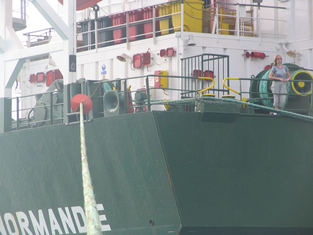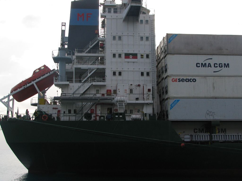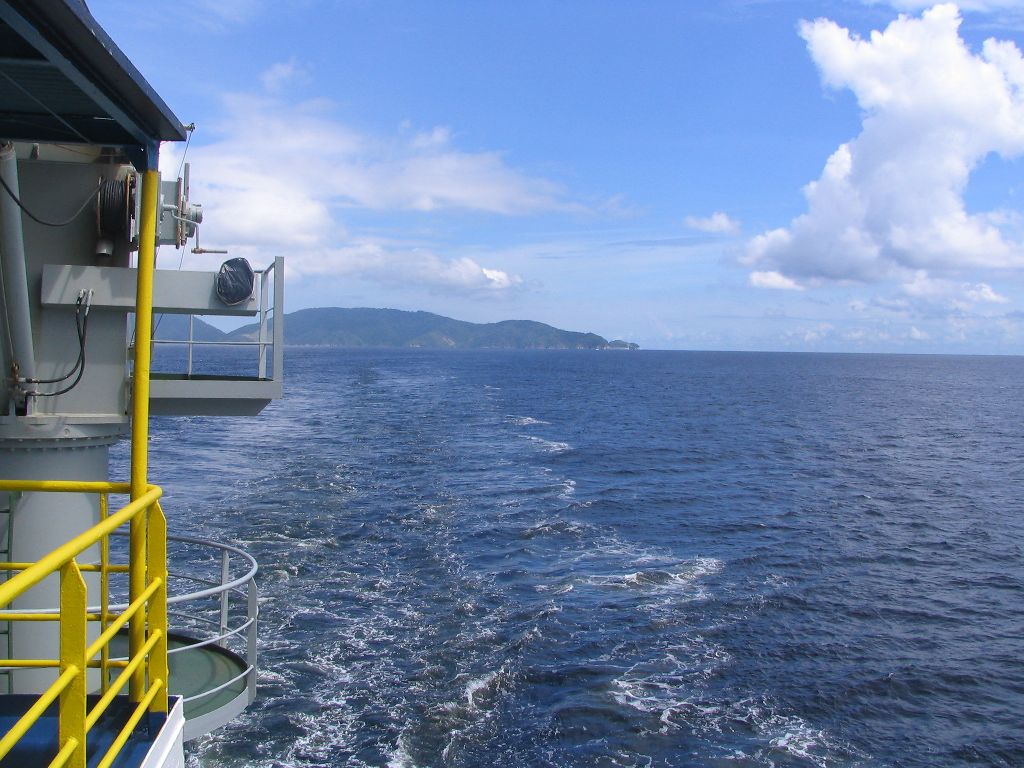 Leichte Aufregung machte sich bei uns breit, als sich plötzlich das ansonsten ständig gleiche monotone Motorengeräusch ändert und anscheinend der Rückwärtsgang eingelegt wird. Nach wenigen Minuten kam das Schiff dann letztendlich zum Stehen. So trieben wir mitten auf hoher See ohne Motorenkraft, merkwürdiges Gefühl aber laut Aussage der Besatzung nicht schlimm. Es musste wohl etwas im Maschinenraum gemacht werden. Nach dem Lunch warteten wir sehnsüchtig auf Deck auf das versprochene Land, welches auf der rechten Seite auftauchen sollte. Und tatsächlich, nach tagelangem Blick auf das Meer tauchten in der Ferne Berge auf. Es dauerte noch rund 2 Stunden bis nur noch 6-8 km von einer der Azoreninseln entfernt waren. Ein schöner Anblick als die bewaldete, wolkenverhangene und mit Steilküsten versehene Insel langsam an uns vorüber zog und man auch vereinzelt Häuser erkennen konnte. Natürlich nutzten wir die Chance und sendeten SMS in die Heimat und riefen kurz meine Mutter an, die das nur so kommentierte: “Azoren? Ja, das habe ich mir fast schon gedacht. Wenig später erklärte uns de Steward die Waschmaschine und en Trockner auf Deck 6, gleich neben der Kapitänskajüte, welche wir auch direkt mal nutzten. Also die Waschmaschine, nicht die Kajüte. Eine Etage über Deck 6 befindet sich die Brücke, wo wir bei der Gelegenheit endlich mal einen Blick rein warfen. Ein einzelner Offizier steuert das Schiff und hat einen prächtigen Blick auf das gesamte Geschehen. Demnächst schauen wir noch mal vorbei, doch jetzt müssen wir erst mal Wäsche aufhängen.