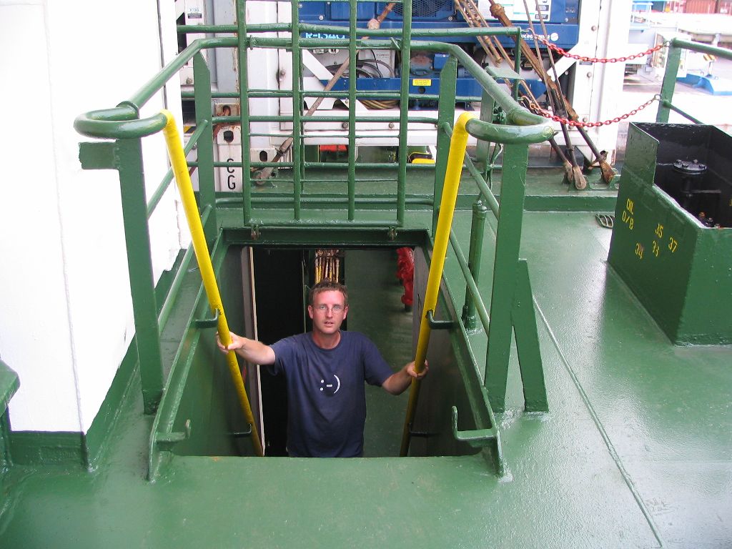 Nachmittags traf ich einen Matrosen, der mich einmal rings um das Schiff führte und mir viel erklärte. So kam ich auch endlich mal nach ganz vorne zum Bug, wo es erstaunlich ruhig ist. Man muss erklären, dass auf diesem Schiff ständig das leise Dröhnen des Motors zu hören ist. Nach so vielen Tagen auf See stört es zwar nicht mehr und man hat sich daran gewöhnt, doch wenn man vorne steht und es ist völlig leise, dann fällt das schon auf. Warum wir bisher nicht auf eigene Faust zum Bug sind? Ganz einfach, es ist ein wenig unheimlich. Unter den tonnenschweren Containern hindurch, während sie knarrende Geräusche von sich geben und das fast auf Meereshöhe, das in einem rasanten Tempo an einem vorbei rauscht, da bekommt man ja doch ein mulmiges Gefühl. Aber Moni und ich wollen morgen noch einmal auf eigene Faust los ziehen. 8. Tag Was für eine Nacht. Schon am gestrigen Nachmittag begann das Schiff zu schaukeln. Man unterscheidet zwischen Schaukeln und Stampfen. Letzteres hatten wir die ersten beiden Tage in der Bucht von Biskaya. Dabei kommen wir Wellen von vorne und das Schiff hebt vorne auf dem Wellenkamm ab und knallt runter in die nächste Welle. Unangenehm für Mensch und Maschine und erinnert an diese Parabelflüge, bei denen Astronauten auf ihren Weltraumflug vorbereitet werden. Das Schaukeln hingegen findet von links nach rechts statt. Schaut man durch das Fenster als Anhaltspunkt, dann sieht man den Horizont weit auf- und absteigen. Sieht spektakulär aus, ist aber eher harmlos solange alles auf dem Tisch stehen bleibt. Wie es aber nachts so üblich ist, kommt einem in der Dunkelheit alles unheimlich vor. Und jedes Mal, wenn man im Bett von links nach rechts gerollt wird und wieder zurück, hat man als Landratte das Gefühl, das Schiff kippt um, was natürlich Quatsch ist. Denn selbst unser Apfel rollte nicht vom Tisch. Es kommt einem halt nur schlimm vor. Also war an Einschlafen aber nicht zu denken. Im Bett rumwälzen brauchte ich mich auch nicht, das tat ja schon das Schiff für mich. Ich überlegte also, auf die Brücke zu gehen, zu puzzeln, Radio zu hören oder mir aus der Bar einen Videofilm zu holen. Doch ich war einfach zu müde und so schlurfte ich wankend vom Bett auf die Couch, wo ich jederzeit aus dem Fenster gucken kann, was einem irgendwie ein beruhigendes Gefühl gibt. Moni solidarisierte sich und brachte gleich eine Decke mit und so konnten wir die letzten drei Stunden der Nacht doch noch dahin schlummern. Im Verlauf des weiteren Tages gingen wir zum Bug und Moni bestätigte, dass sich der unheimliche Weg unter den Containern hindurch lohnt. In bester Titanic-und-di-Caprio-Manier standen wir vorne und blickten aufs Meer bzw. suchten wir vorne vergeblich Delfine, die ja bekanntlich gerne vor großen Schiffen schwimmen. Dieses Ritual gehört nun zu unseren täglichen Aufgaben. Später schauten wir mal, was die bordeigene Videothek hergibt. Meist sind es original englischsprachige Filme mit holländischen oder dänischen Untertiteln. Zwei deutschsprachige Filme fanden wir aber auch: ”JFK” und ”Auf dem Weg in die Verdamnis”. Wir entschieden uns für den Präsidentenmord und griffen uns zum Spaß noch das Original von Godzilla. Die Filme ”Untergang der Poseidon” und ”The perfect storm” ließen liegen. Auf Filme mit Monsterwellen und untergehenden Schiffen hatten wir aus irgendwelchen Gründen keine Lust. Beim Dinner gab es wieder einige schweizer Verschwörungstheorien, die von manchen Anwesenden, einschließlich dem Kapitän mit unverständlichem Kopfschütteln begleitet wurden. Dieser öffnet dafür für uns die Türen seines ”Privat-Aldis”, wie er den Proviantraum nennt und wir konnten uns eine Palette Cola-Dosen kaufen. Am Abend saßen die drei Rumänen und der Schweizer mit hochprozentigem Alkohol zusammen und es gab wieder aufschlussreiche Informationen aus der Welt der Verschwörer. Ich verzog mich frühzeitig, weil es mir zu anstrengend war, dass einfachste Fragen nach Reiseplänen nach 20 Minuten Monolog mit Theorien über Putin beantwortet wurden. 9. Tag Wie der gestrige Abend schließlich ausging, können wir nur vermuten, da einer der Offiziere den Schweizer fragte, wie er sich denn fühle. Vermutlich floss noch viel Alkohol auf dem Ozean. Auf Schiffswrackunserem Kontrollgang zum Bug sahen wir zwar noch keine Delfine, dafür aber in der Tat kleine fliegende Fische. Sie sind ca. 10 cm lang, schimmern silbern und mit ihren Flügeln sehen sie aus wie Schmetterlinge. Zuvor waren wir eine Stunde lang im Pool und haben in dem kleinen Becken rumgeplantscht. Täglich wird der Pool mit frischem Meerwasser aufgefüllt und ist daher mittlerweile auch gar nicht mehr so kalt. Man merkt, dass wir uns der Karibik nähern – nur noch ca. 1700 km, was im Verhältnis zur Weite des Ozeans so gut wie nichts ist. Beim Relaxen erfand Moni die Disziplin ”Bergaufschwimmen”. Dieser Hochleistungssport ist jedoch nur auf einem schwankenden Schiff möglich, wenn das Wasser im Pool von einer Seite auf die nächste plätschert. Ansonsten lief ich mal wieder mit der Kamera übers Schiff und fotografierte alles, was nicht schnell genug war, um sich zu verstecken. Manchmal komme ich mir vor wie Herbert Grönemeyer in seiner ersten Filmrolle als Kriegsberichterstatter in dem Klassiker ”Das Boot”. So machten wir heute auch ein Foto von Pingu als Kapitän auf der Brücke. Nach dem Dinner zogen wir uns zurück und schauten ”JFK”, bis wir einschliefen. Beim Filmschauen vergisst man völlig, dass man sich auf einem Schiff befindet. Draußen am Pool wurde indessen wieder kräftig getrunken. 10. Tag Im Auge des Hurrikans. Na gut, etwas übertrieben, aber draußen blitzt es und es regnet, die dunklen Wolken hängen tief aber es ist nicht stürmisch. Um 10.20 Uhr fand, wie gestern angekündigt, eine Feuerübung statt. War aber nicht so spektakulär zuzusehen. Gegen Mittag legte Moni sich etwas hin und ich wackelte zum Bug, wo ich ein bisschen Musik hörte. 