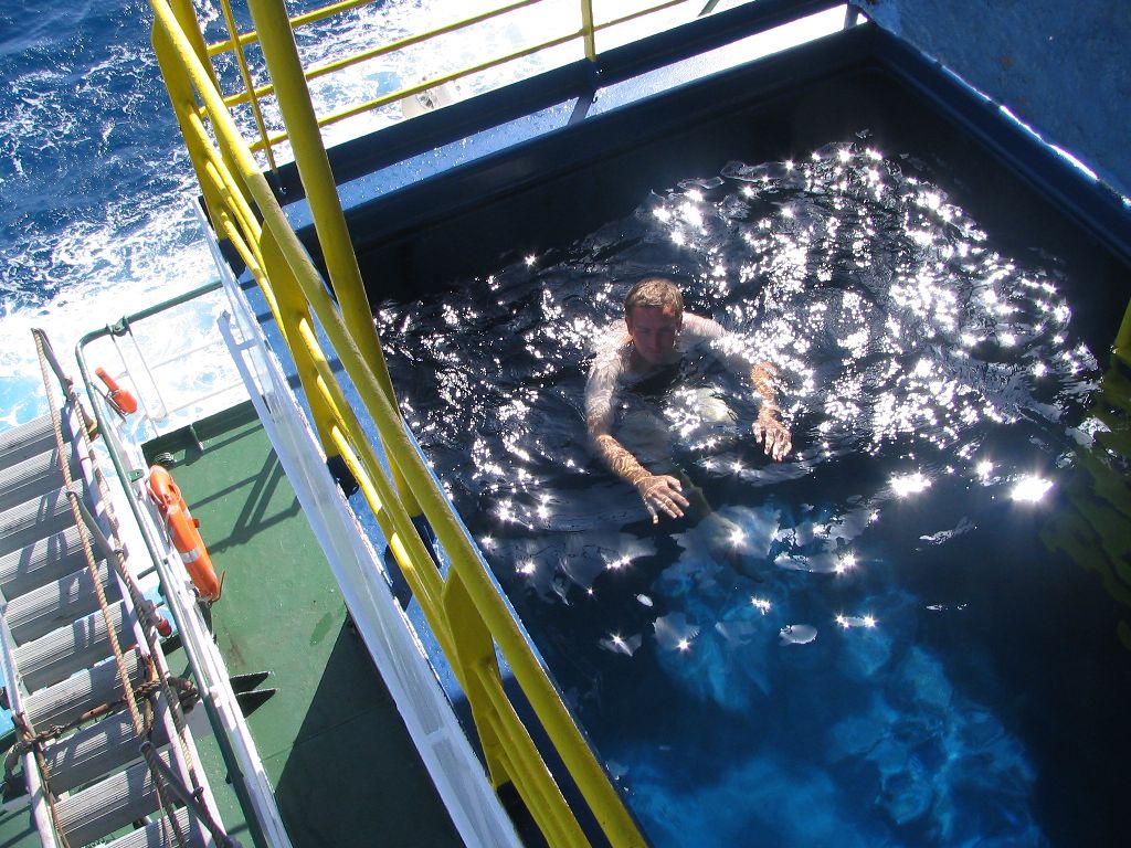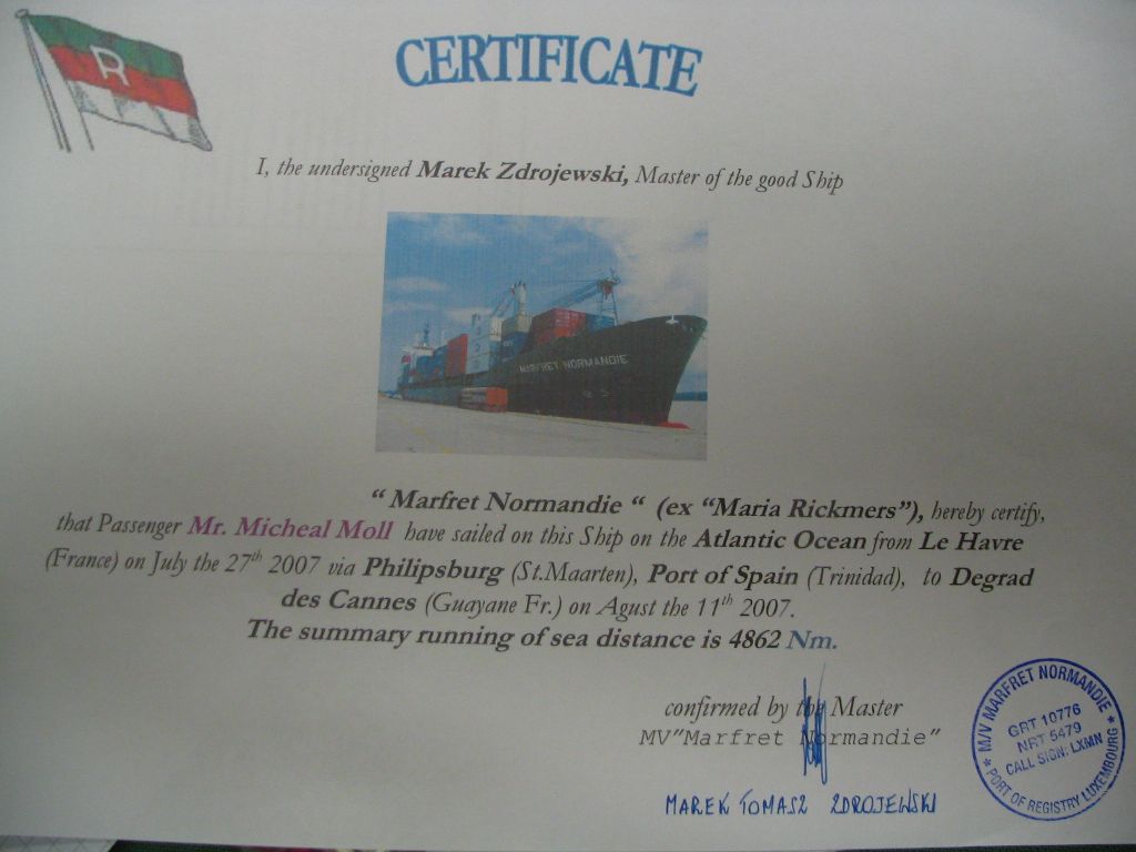 Nach einem letzten Abschiedsfoto mit dem Kapitän radelten wir zurück und verbrachten den gesamten Nachmittag im klimatisierten Internetcafé, schrieben Mail, Raupe Wurmtelefonierten für 2 Cent nach Hause und recherchierten für unsere Weiterreise. Immer öfter dachten wir laut darüber nach, wie es wohl wäre und ob es wohl nicht sinnvoller wäre, mit dem Schiff weiter zu fahren, so wie es uns auch die Offiziere empfahlen. Immerhin liegt das Schiff ja nur 12 km von uns entfernt und wartet ja noch zwei Tage geradezu auf uns. Wir wären dann im brasilianischen Belem, könnten dort in einem klimatisierten Bus einsteigen und uns nach Brasilia (2.100 km) bringen lassen. Ich muss zugeben, dass mein Körper nicht für die Tropen geschaffen ist. Des Weiteren kämen die Kosten zu, die wir hätten, wenn wir auf dem Landweg reisen. Durch das Radelverbot auf der N1 nach Suriname wären wir gezwungen Minibusse zu nehmen. Unsere Erkundigungen ergaben Kosten von 100 Euro. Dazu die beiden Visa für je 30 € und die Übernachtungen bis wir das Visa erhalten. Für Guyana bräuchten wir auch noch ein Visum und die dortige Hauptstadt Georgetown gilt mal wieder als gefährlich, worauf wir mittlerweile keine Lust mehr haben. Von Georgetown aus käme dann eine 480 km lange Urwaldpiste auf uns zu, die Einheimischen zufolge nur mit einem Truck zu schaffen ist (Nachtrag: Mittlerweile wissen wir, dass man die Strecke doch radeln kann. Zu dem damaligen Zeitpunkt galt das nicht als sicher). So beschlossen wir, schnellstmöglich aus den Tropen heraus zu fahren und dafür morgen beim Kapitän nachzufragen, ob wir nochmal mitkönnen. Doch wie der Zufall es will, nach unserem mehrstündigen Internetbesuch gingen wir zum Hotel zurück und wer saß dort in der Bar und trank einen Cocktail? Der Kapitän und seine Frau. Er versprach uns, direkt morgen früh um 7, wenn es in Deutschland 12 Uhr ist, die Reederei in Hamburg anzumailen, sofern er eine Satellitenverbindung hat. Uns bat er, gegen Mittag bei ihm vorbeizuschauen, weil er bis dahin eine Antwort haben müsste. So gingen wir voller Hoffnung in unser miefiges 35 Grad-Zimmer zurück und vermieden jede Bewegung. Dabei überlegten wir, ob dies nicht alles eine Art Zeichen sein muss, dass das Schiff drei Tage Aufenthalt hat, dass wir den Kapitän ausgerechnet dann treffen, wenn wir ihn brauchen…Regenwald 19. Tag ”Lustig, gell? Es ist Frankreich und sieht aus wie Afrika.” In perfektem Deutsch sprach die weiße französische Bäckereiverkäuferin mit uns, die sich sehr freute, mal wieder Deutsch reden zu können. Seit drei Jahren lebt sie in Französisch-Guayana und wuchs an der Grenze zum Saarland auf. Nach einem kurzen Gespräch schenkte sie uns ein paar Backwaren, nur ein Baguette für günstige 65 Cent müssen wir bezahlen. Super nett und es bestätigt unseren Eindruck, dass die Menschen hier freundlich sind. Nach 48 Stunden Tropen also die erste vorsichtige Nahrungsaufnahme, jedoch gleichzeitig mit der Information, dass es noch gar nicht richtig warm ist und es noch zu oft regnen. Dabei hat es doch nur eine halbe Stunde geregnet. Zwar heftig, aber kurz. Bei einem Gang zur Post glaubte ich plötzlich an Halluzinationen. Mitten auf einem Parkplatz entdecken meine Augen ein altes, kleines Wohnmobil. Beim Näherkommen stellt sich heraus, dass es sich um Belgier handelt und diese den Wagen verkaufen wollen. Auf ihrer Website erfahren wir später, dass sie ganz Mittel- und Südamerika damit bereist haben. Wir hingegen radeln derweil zum Schiff, wo wir wieder mit einem großen ”Hallo” begrüßt werden und vom Kapitän verkündet bekommen, dass alles okay geht. Wir können schon heute einschiffen. Der Kapitän bot uns sogar an, dass seine Frau mit einem von uns in seinem zweisitzigen Leihwagen das Gepäck holen könnte, doch wir bedankten uns freundlich und radelten zurück zum Hotel, diskutierten dort noch ein wenig, weil wir die nächste Nacht nicht mehr zahlen wollten, packten unser Gepäck aufs Rad und radelten erneut zum Schiff. Unterwegs rechneten wir aus, dass unser Wasserverbrauch in den Tropen höher ist, als der Benzinverbrauch unseres alten Wohnmobils. Bei einer Strecke von 36 km kamen wir auf 6 Liter Flüssigkeit, hochgerechnet auf 100 km ist das ein Verbrauch von 16-17 Litern. Bei einem Preis von 0,60 €/Liter nicht gerade wenig. Auf dem Schiff angekommen sprangen wir zunächst unter die Dusche und aßen später zu Abend. Noch nie haben uns Bohnen mit Reis und Makrele so gut geschmeckt.
