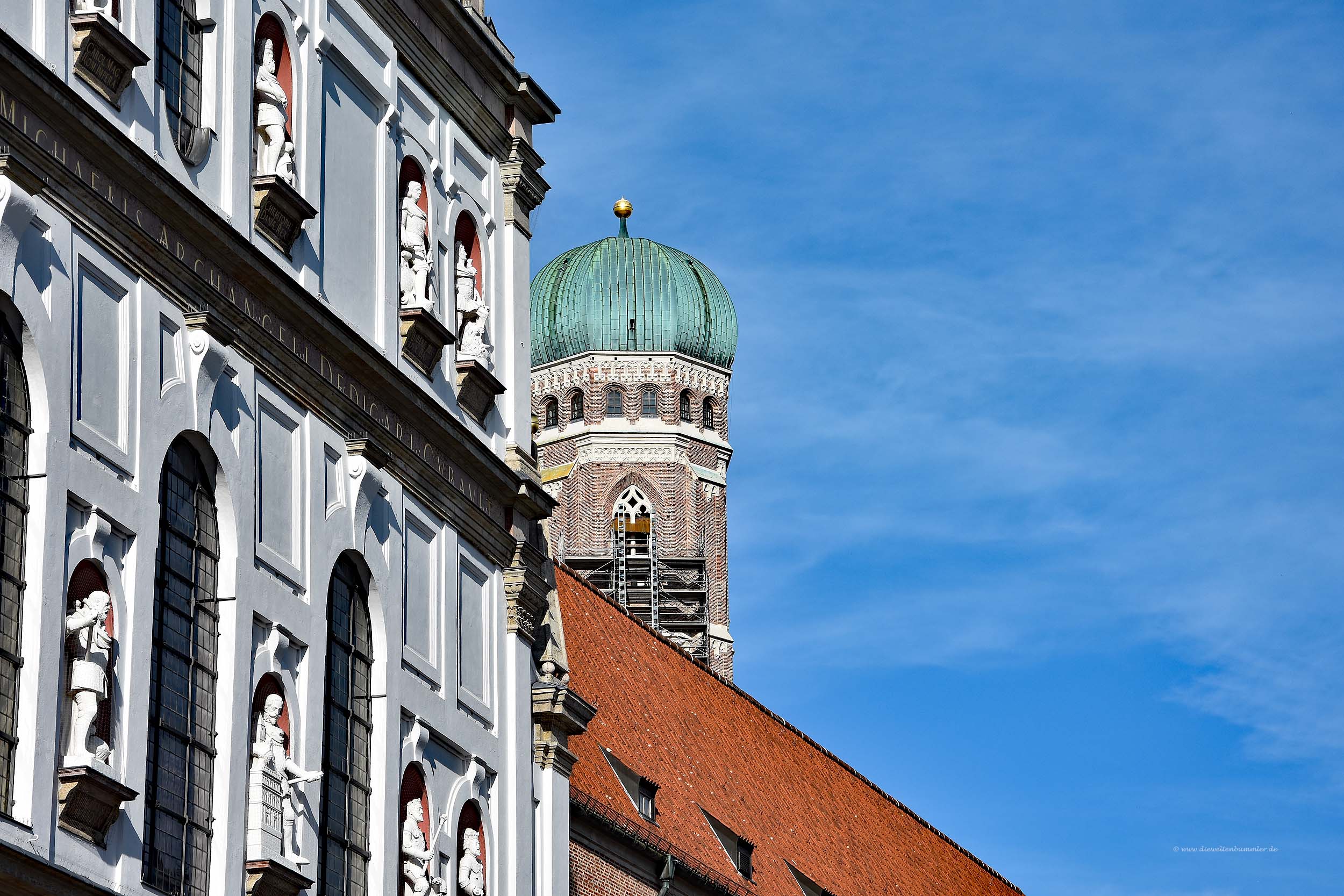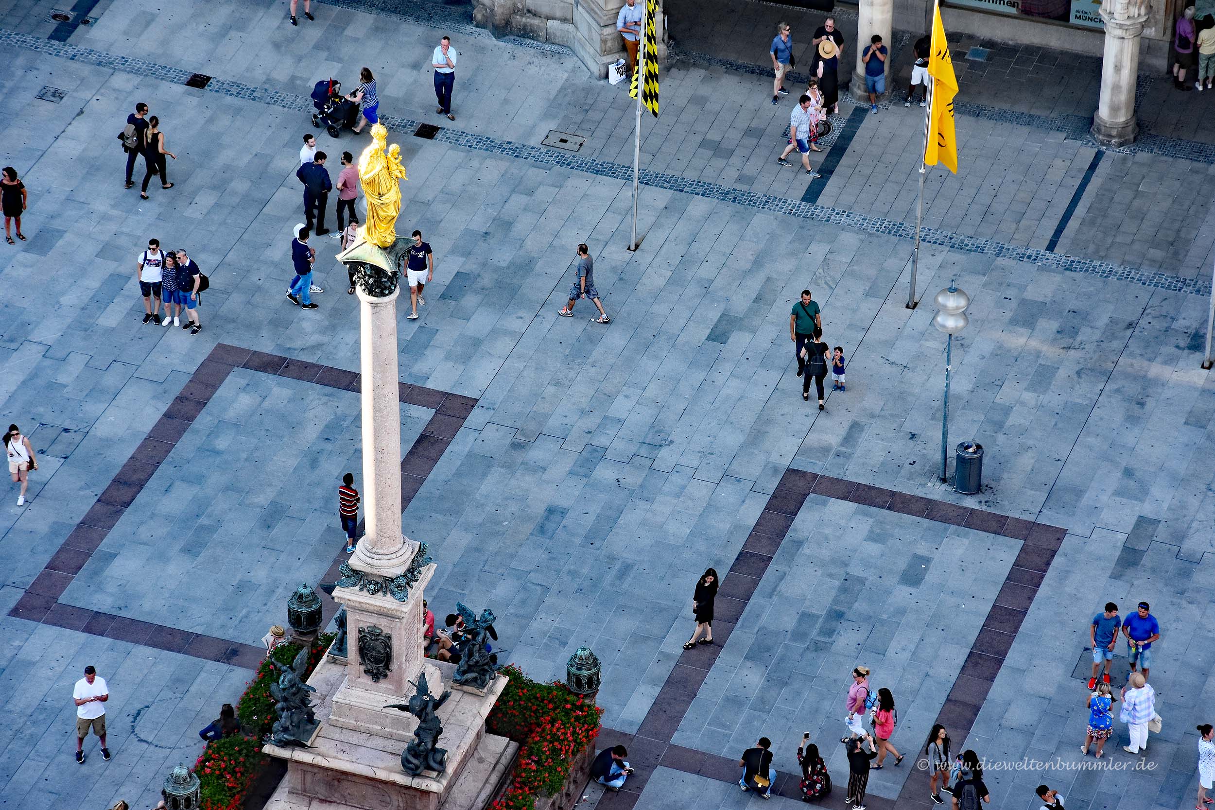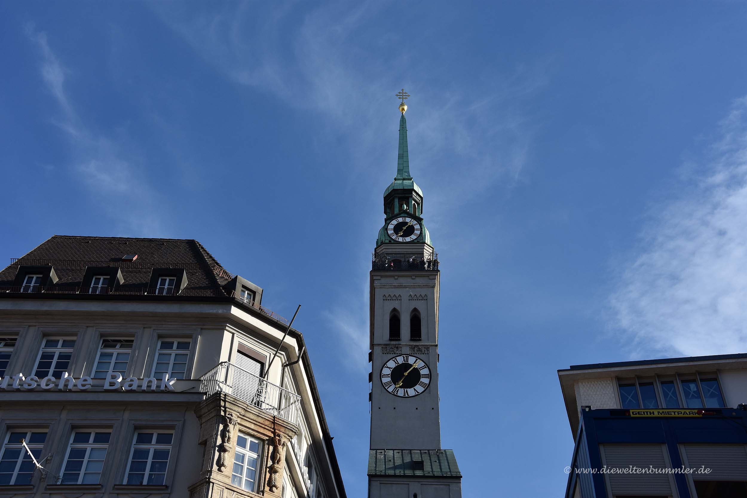 Wir schlenderten durch die Innenstadt zum Rathaus und machten kurzerhand den Turm der St. Peterkirche unsicher. Auch wenn ich nicht fliege und es auch Kirchtürme gibt, auf denen ich mich nicht so sehr wohl fühle, so finde ich Fernblicke immer absolut faszinierend. Und die Aussicht vom Münchener St. Petrikirchturm hat es schon in sich. Zugegeben, wir hatten schönes Wetter. Aber es war toll, bis zu den Alpen blicken zu können.