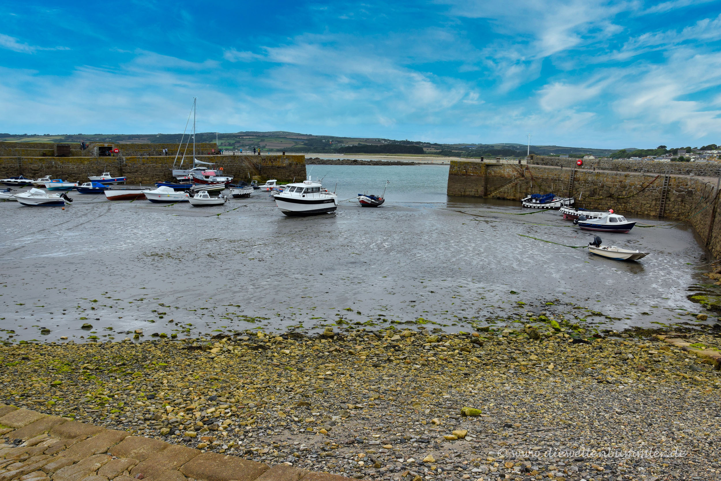 An der Nordseite der kleinen britischen Insel St. Michaels Mount gibt es einen überschaubaren Bootshafen, der bei Ebbe natürlich auch trocken fällt. Diesen erreicht man als Erstes, wenn man den Weg durch das Wattenmeer hinter sich gebracht hat.