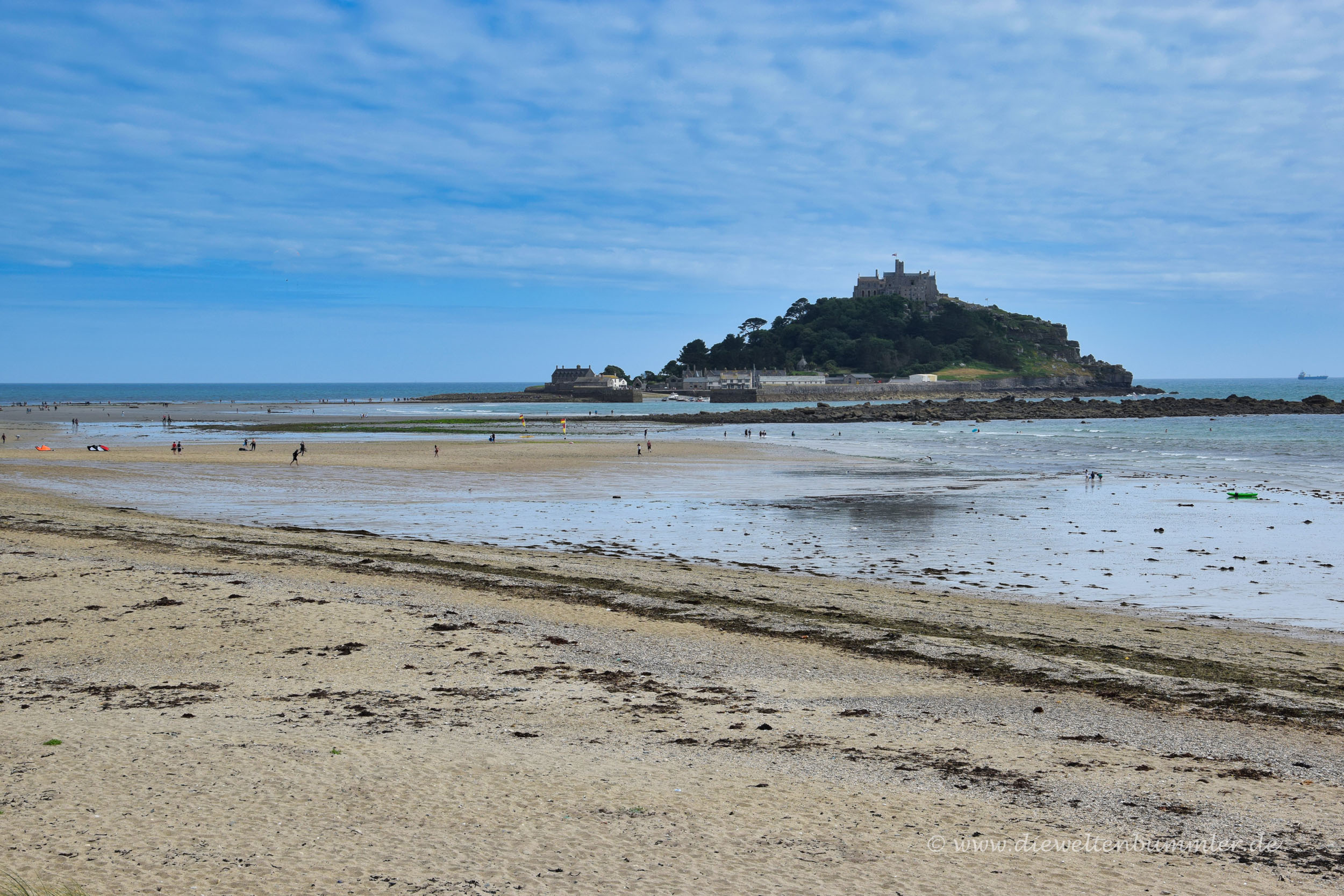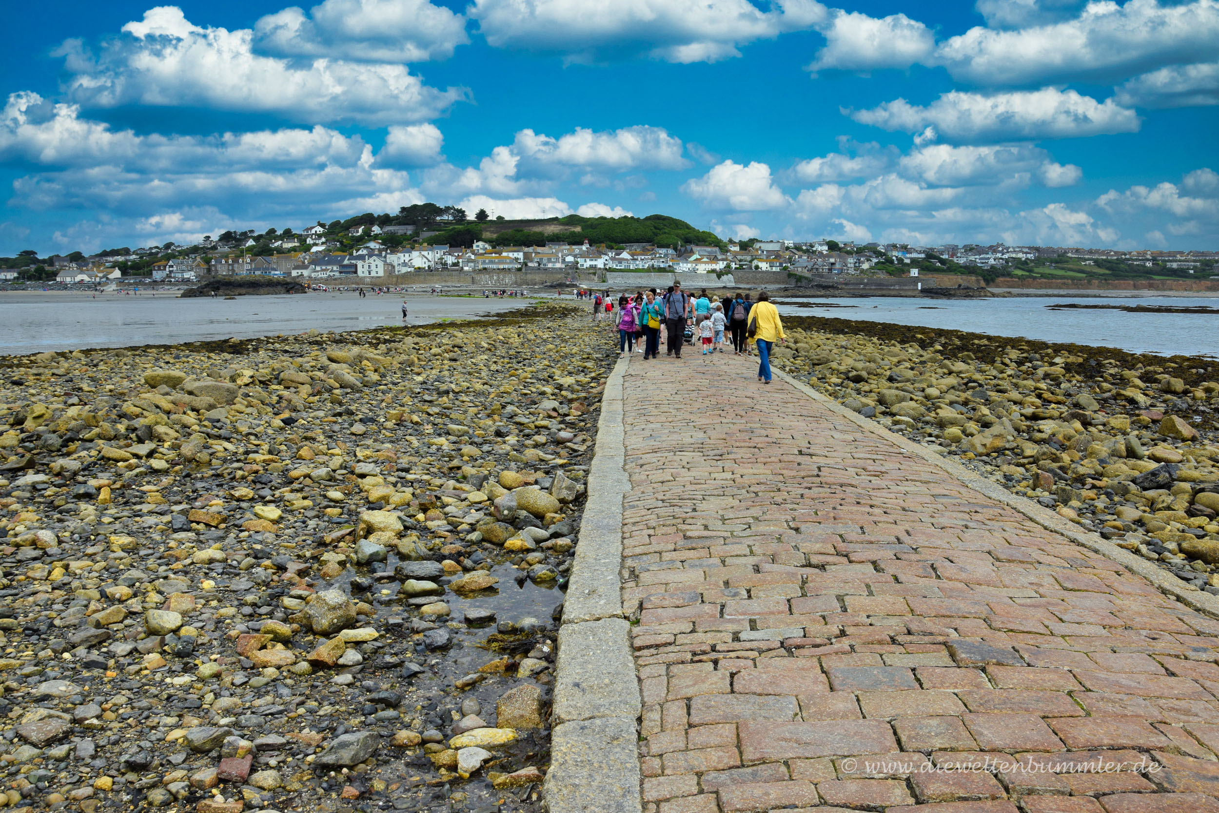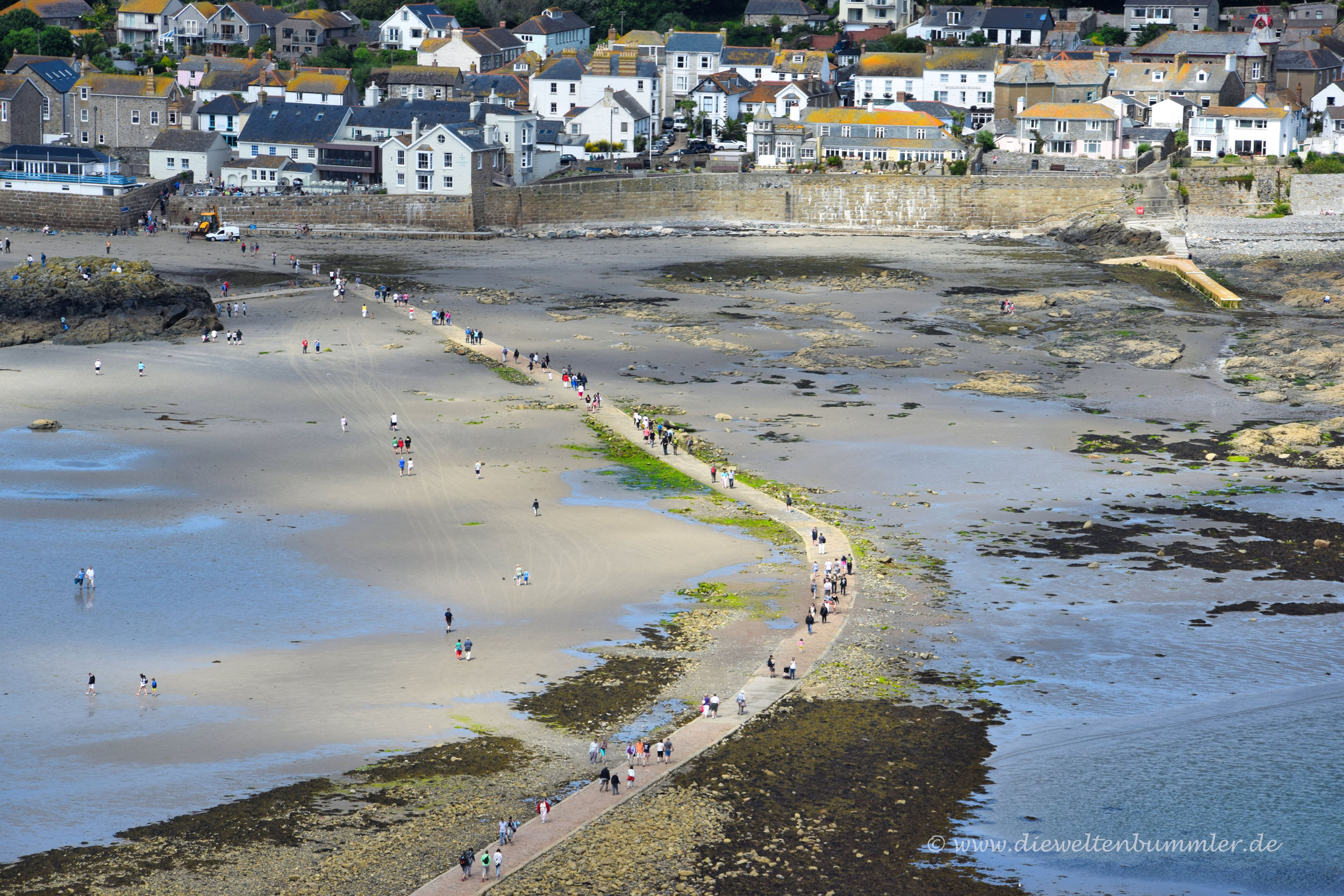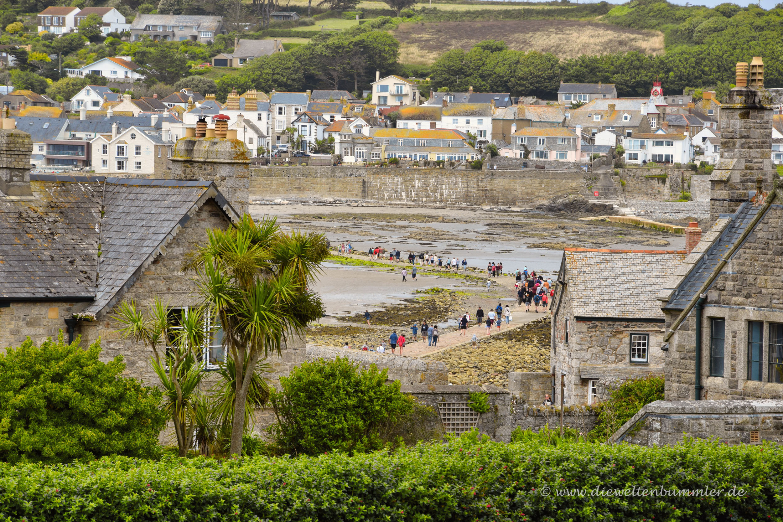 St. Michaels Mount ist nämlich eine Gezeiteninsel und wer zu Fuß hinüber möchte, der muss eben darauf warten, bis sich das Wasser zurückzieht. Aber dann muss man nicht durch das schlammige, matschige Wattenmeer spazieren. Es gibt einen befestigten Weg aus Kopfsteinpflaster, auf dem man ganz bequem und trockenen Fußes zur Insel gelangt. Bei Flut ist von diesem Weg natürlich nichts zu sehen.