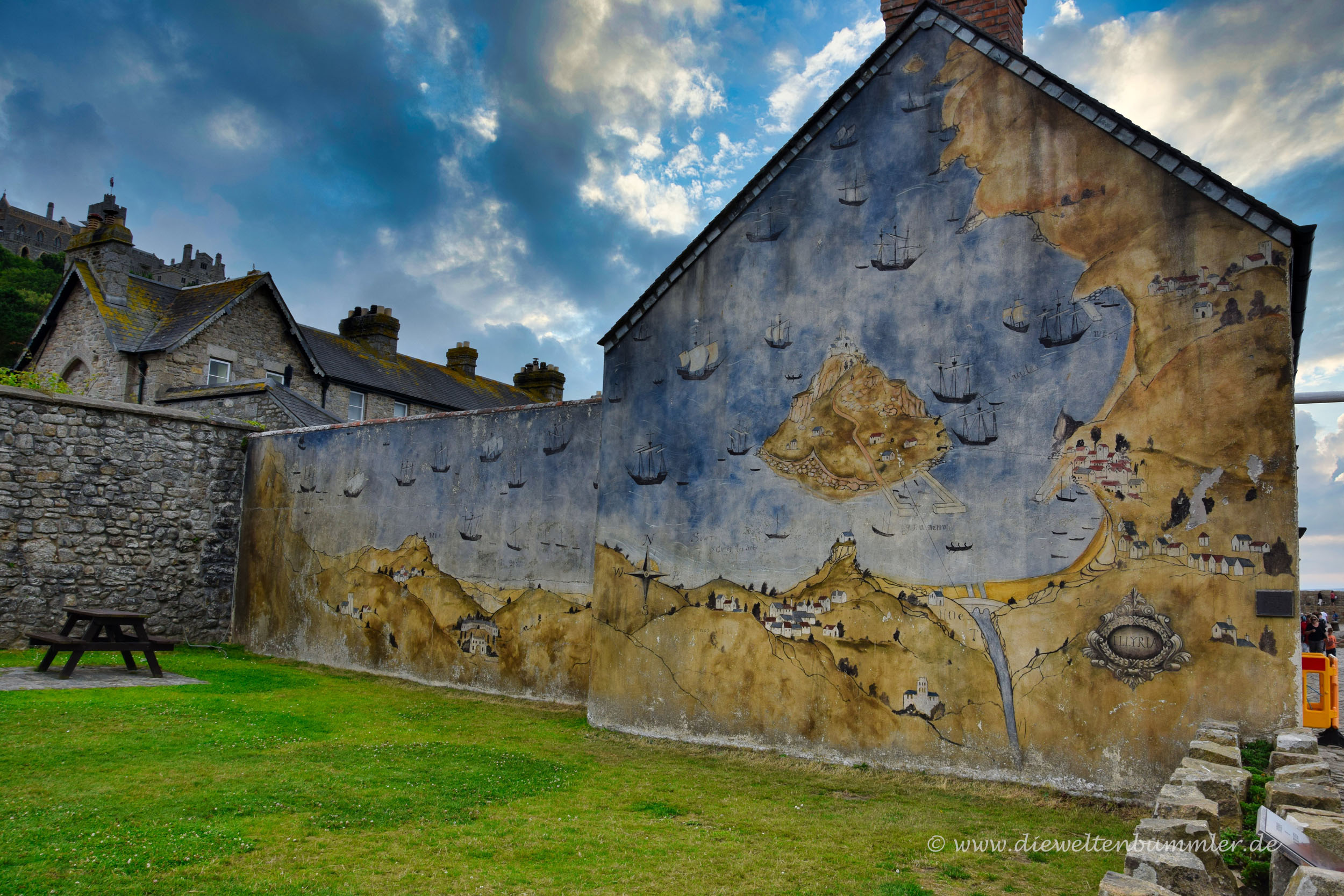 Rechter Hand sieht man eine Häuserreihe. Eines dieser kleinen Häuser ist an der Seite mit einem schönen Gemälde verziert. Es zeigt diesen englischen Küstenabschnitt inklusive Insel und Segelschiffen in historischer Form.