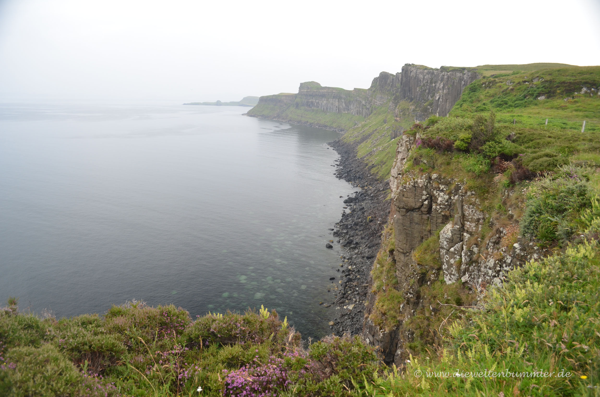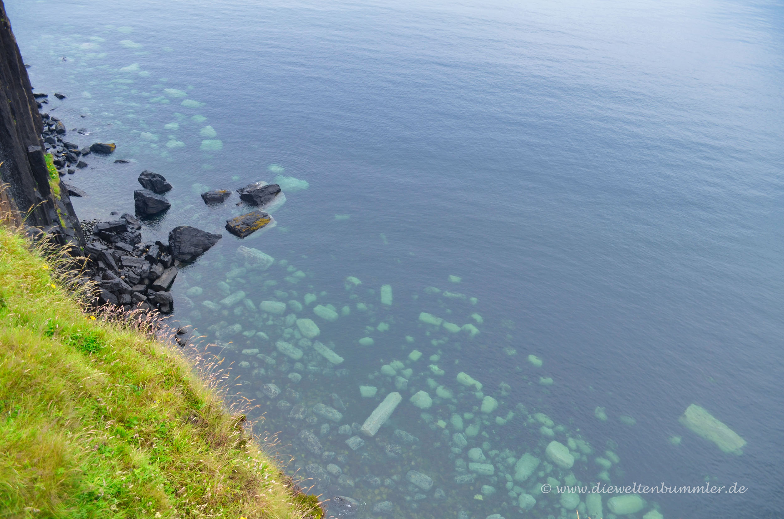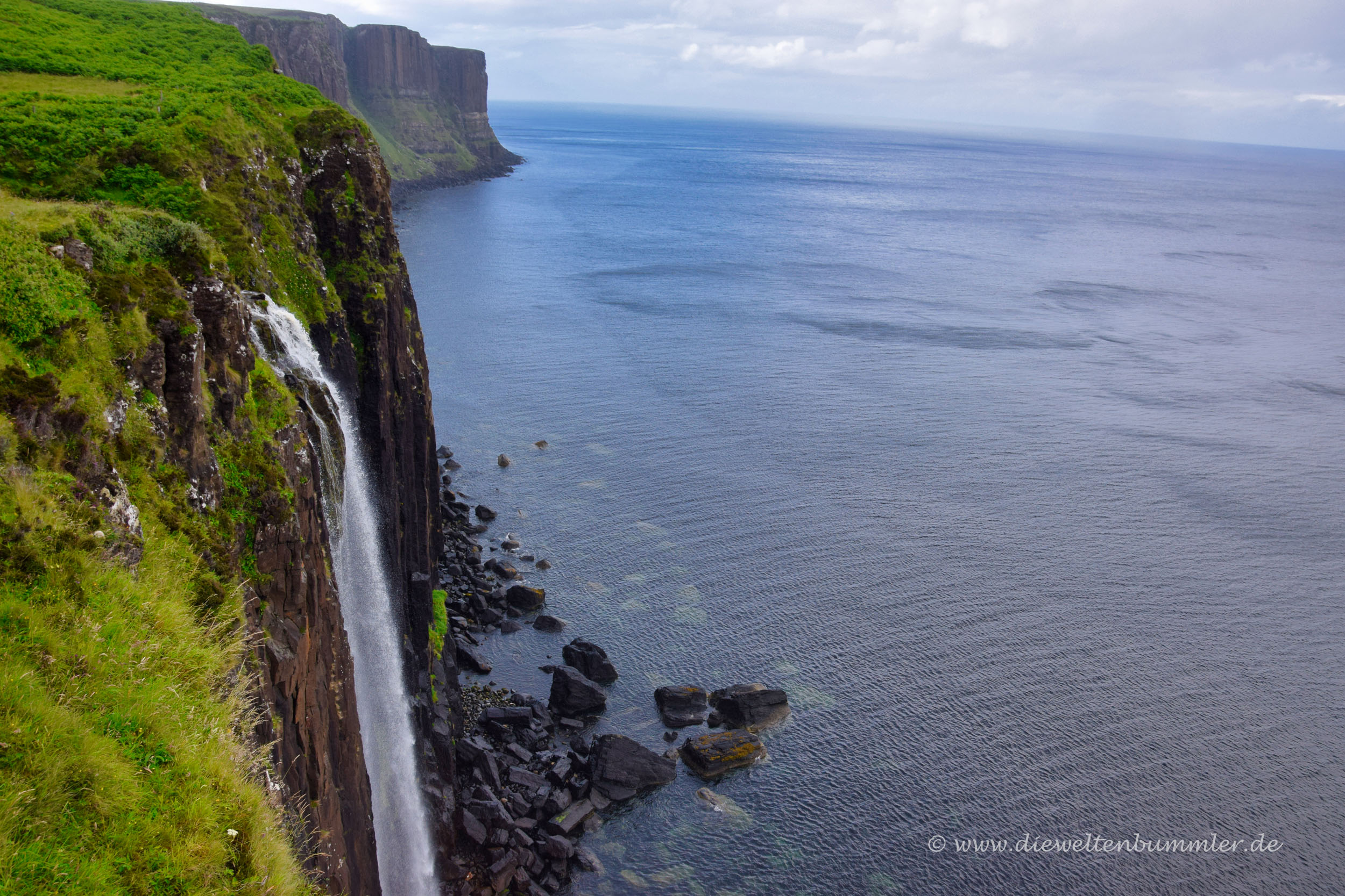 Folgt man der Straße weiter nordwärts, so kommt man zum Kilt Rock und den Mealt Falls. Na gut, dieser Wasserfall konnte mich nur bedingt überzeugen. Der Wasserfall stürzt zwar sehenswert von der Steilküste ins Meer, doch ist dafür eben auch Wasser notwendig. Und bei unseren Besuchen war das nicht wirklich der Fall. Es war eher ein leichtes Plätschern und wirkte nur wenig beeindruckend.