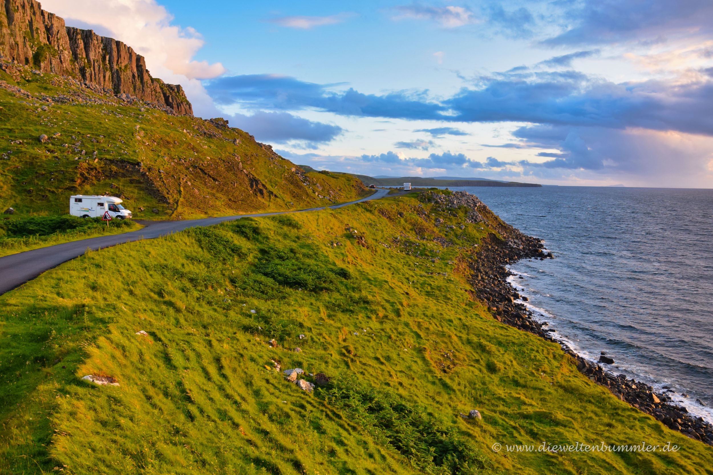 Die Isle of Skye ist eine wirklich schöne Insel und die größte der Inneren Hebriden. Allerdings ist sie auch gut besucht. Auf meiner ersten Womo-Tour durch Schottland hatte ich sogar einen kleinen Kulturschock erlitten. Denn zuvor fuhren wir durch die schottischen Highlands und genossen dabei die Ruhe und Einsamkeit. Auf der Strecke, auf der wir unterwegs waren, waren kaum andere Wohnmobile zu sehen und schon gar keine vom europäischen Festland.