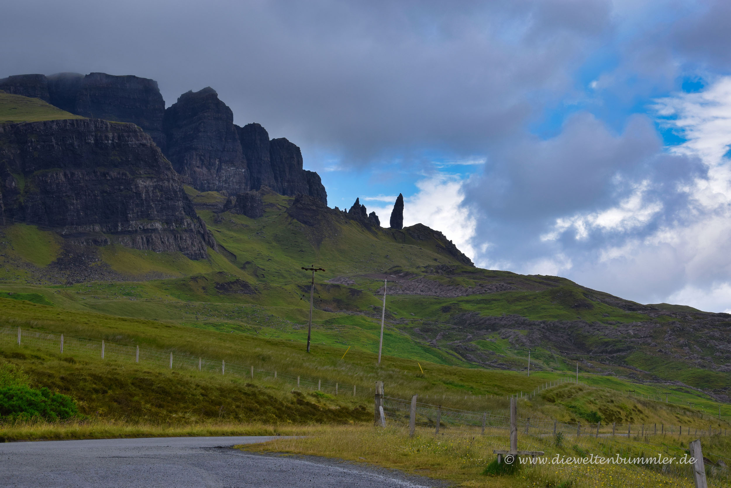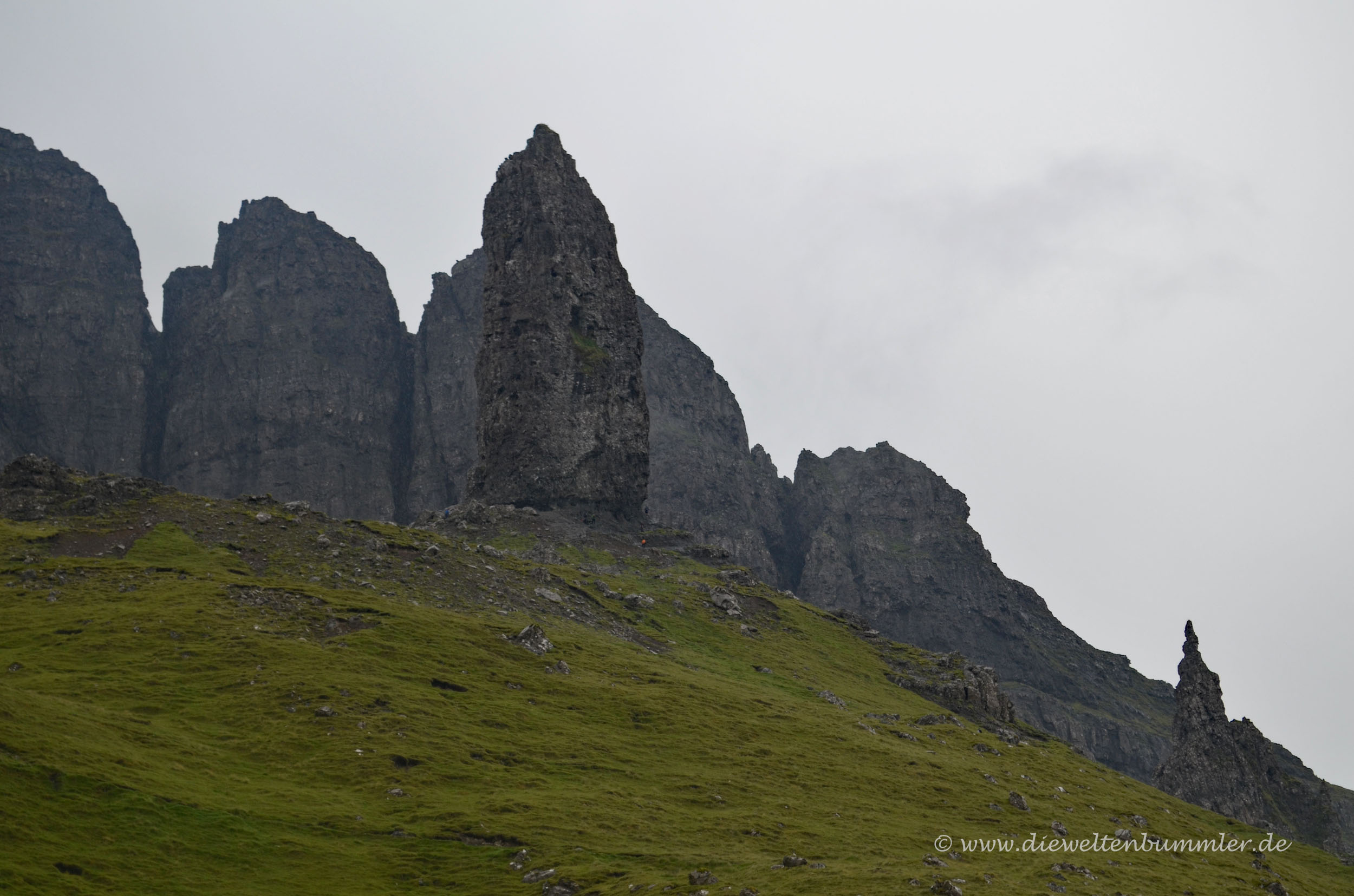 Besonders sehenswert fand ich dabei den östlichen Teil dieser Halbinsel namens Trotternish, also abseits der A87. Dort gelangt man nämlich sehr schnell zu einem Parkplatz, von dem aus man ganz leicht zum Old Man of Storr wandern kann. Der Old Man of Storr ist eine imposante Felsnadel, die optisch stark an die Hinkelsteine von Obelix erinnert.