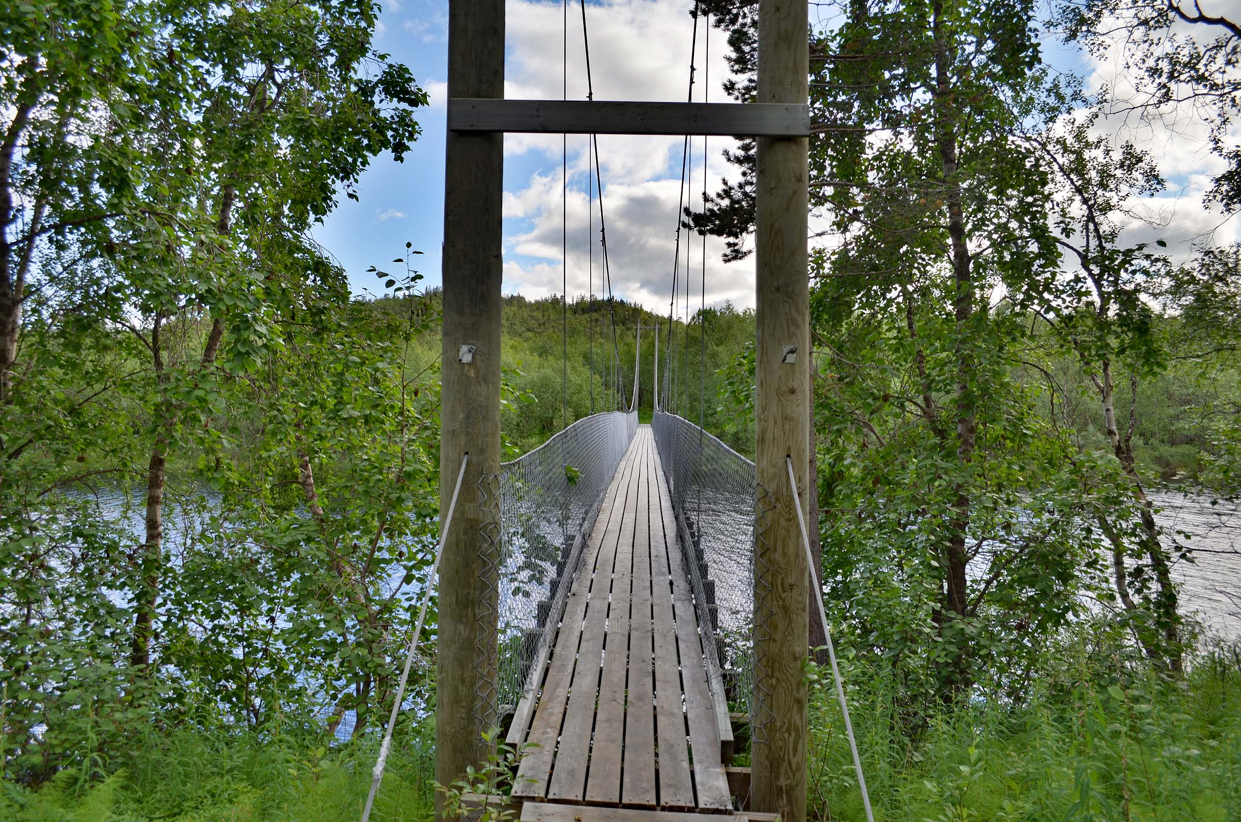 Südlich von Lakselv, eine Ortschaft nicht weit vom Nordkap entfernt, fährt man auf der E6 an einem unscheinbaren Parkplatz vorbei. Von diesem aus kann man über eine schwankende Fußgängerbrücke in einen Wald hinein gehen.