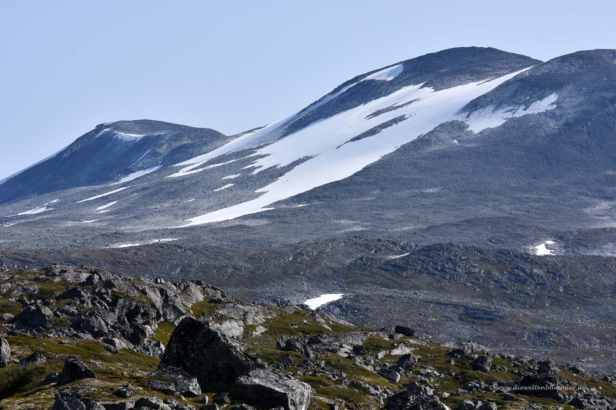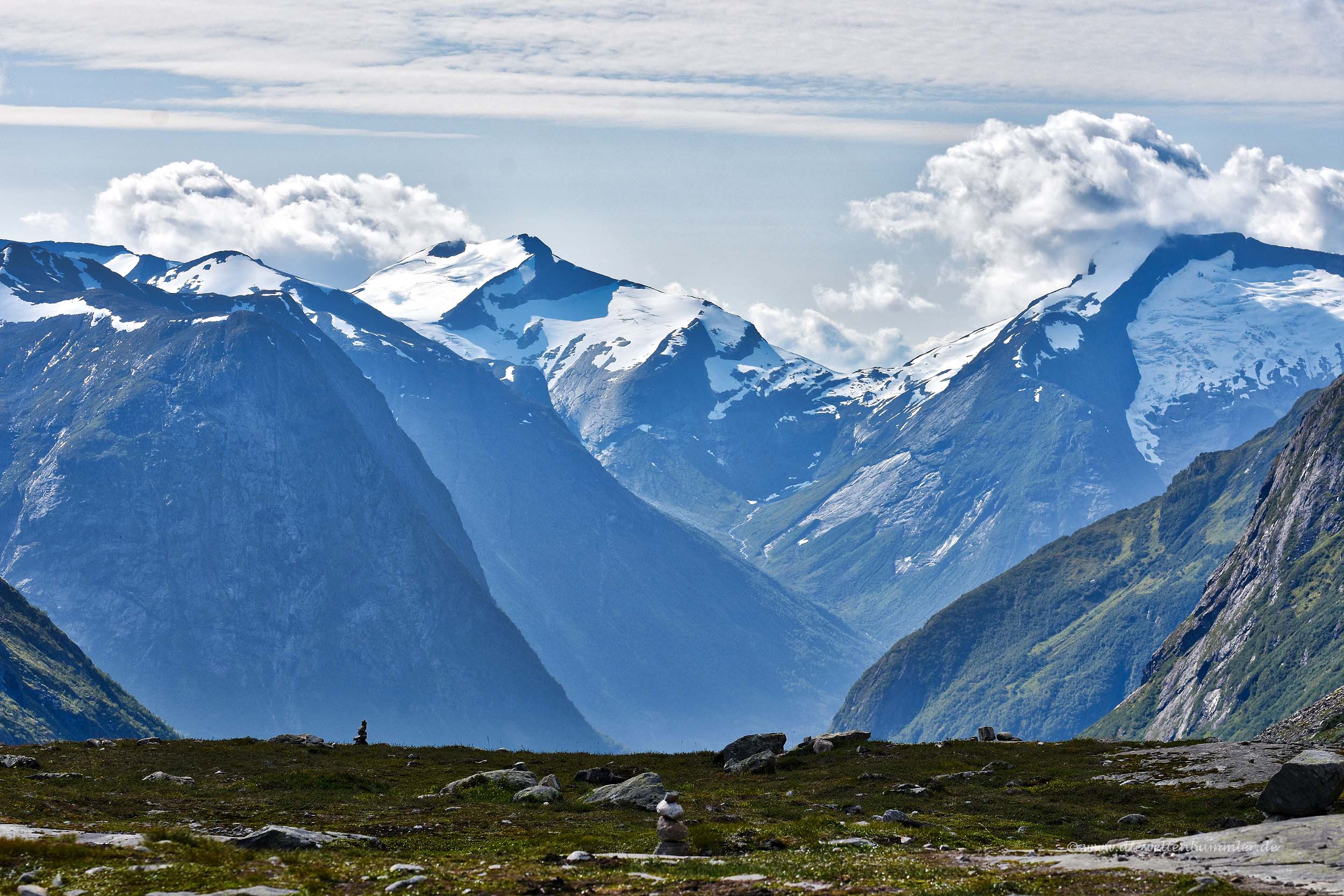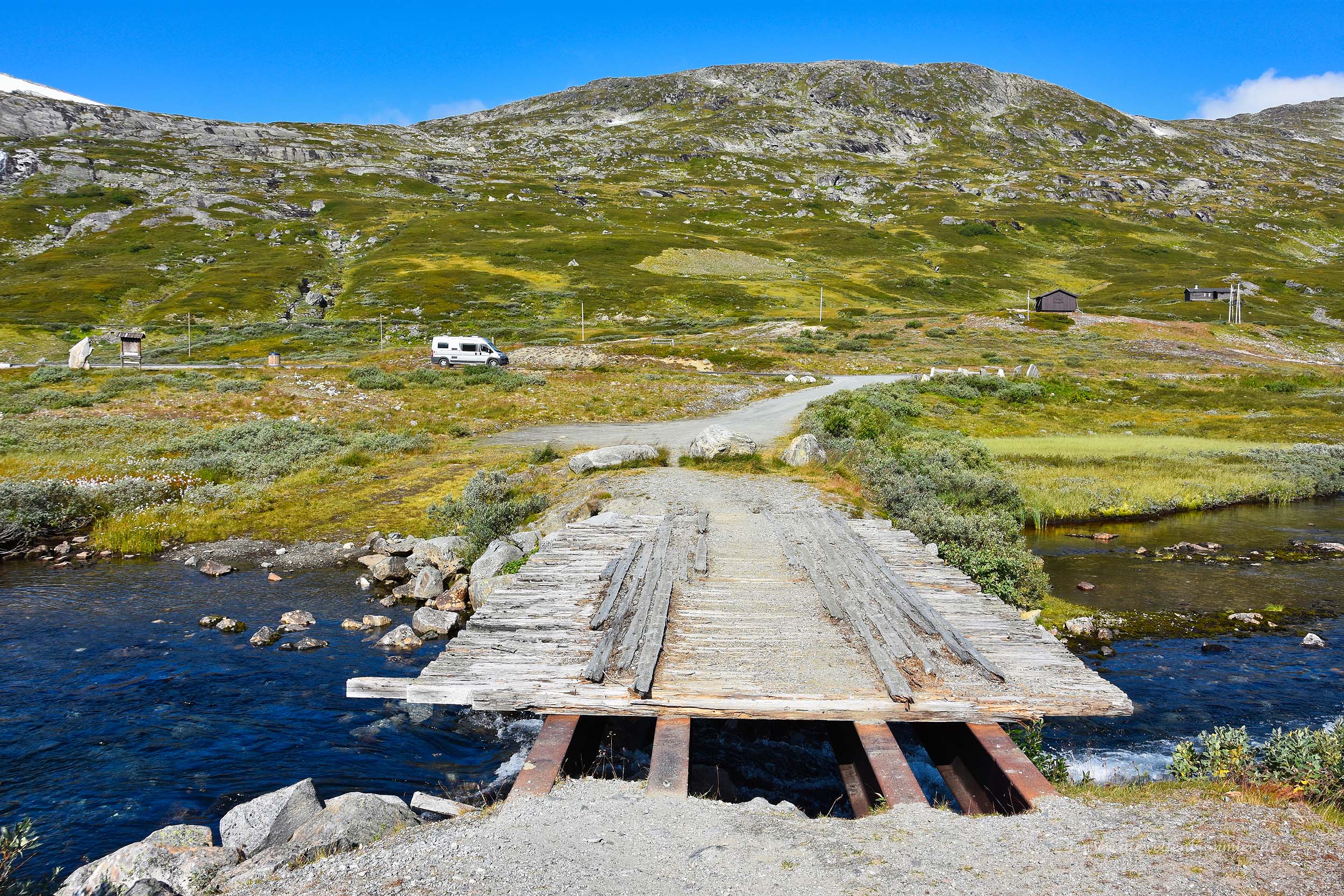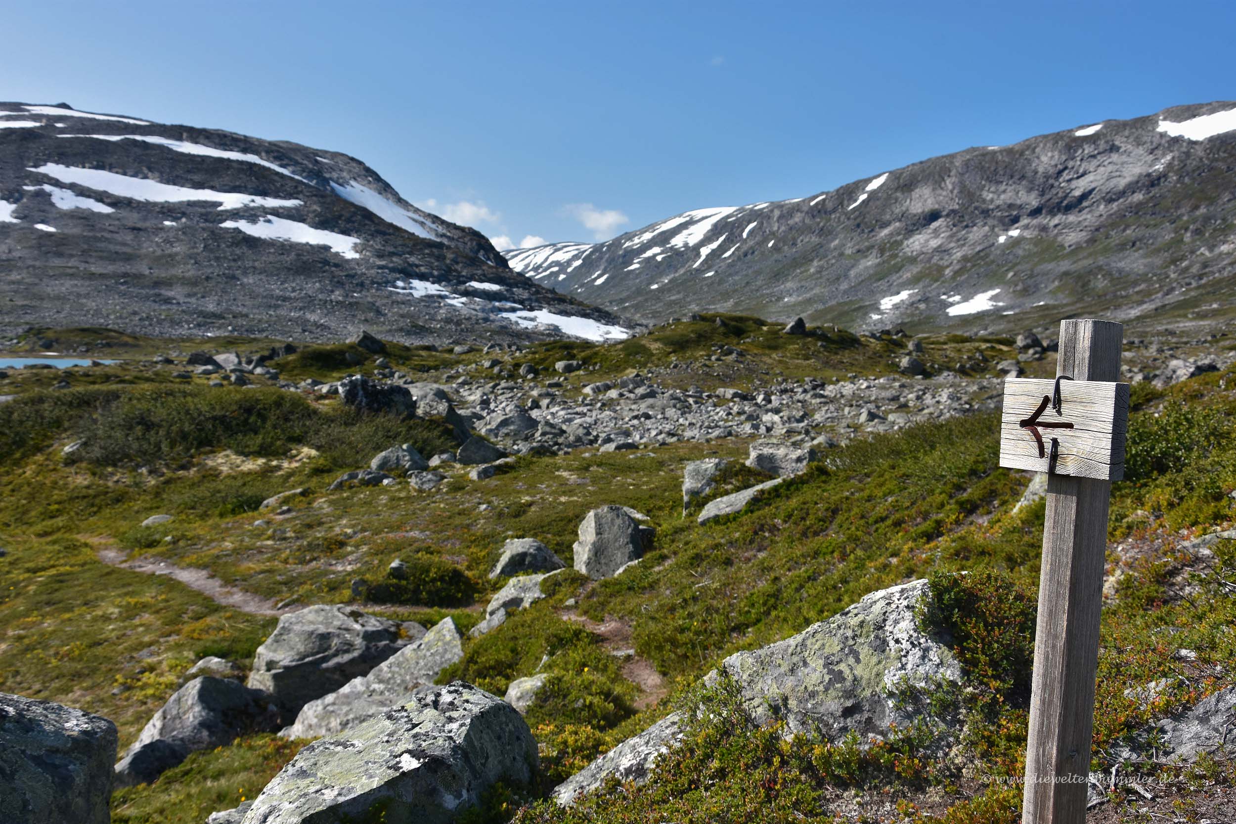 Dazu zählt zum Beispiel der Gamle Strynefjellsvegen in den Provinzen Sogn og Fjordane und Oppland. Wir hatten diese Straße im letzten Jahr eher zufällig kennengelernt, als wir mit dem Wohnmobil von unserer zweiten Nordkap-Tour zurückkamen. Dabei besuchten wir Geiranger und den Berg Dalsnibba, bevor wir weiter südwärts fuhren. Schon kurz nach Verlassen der Mautstraße am Dalsnibba erreichten wir die Straße 15, folgten ihr in Richtung Osten und wurden wenige Kilometer später auf diese touristische Straße aufmerksam gemacht.