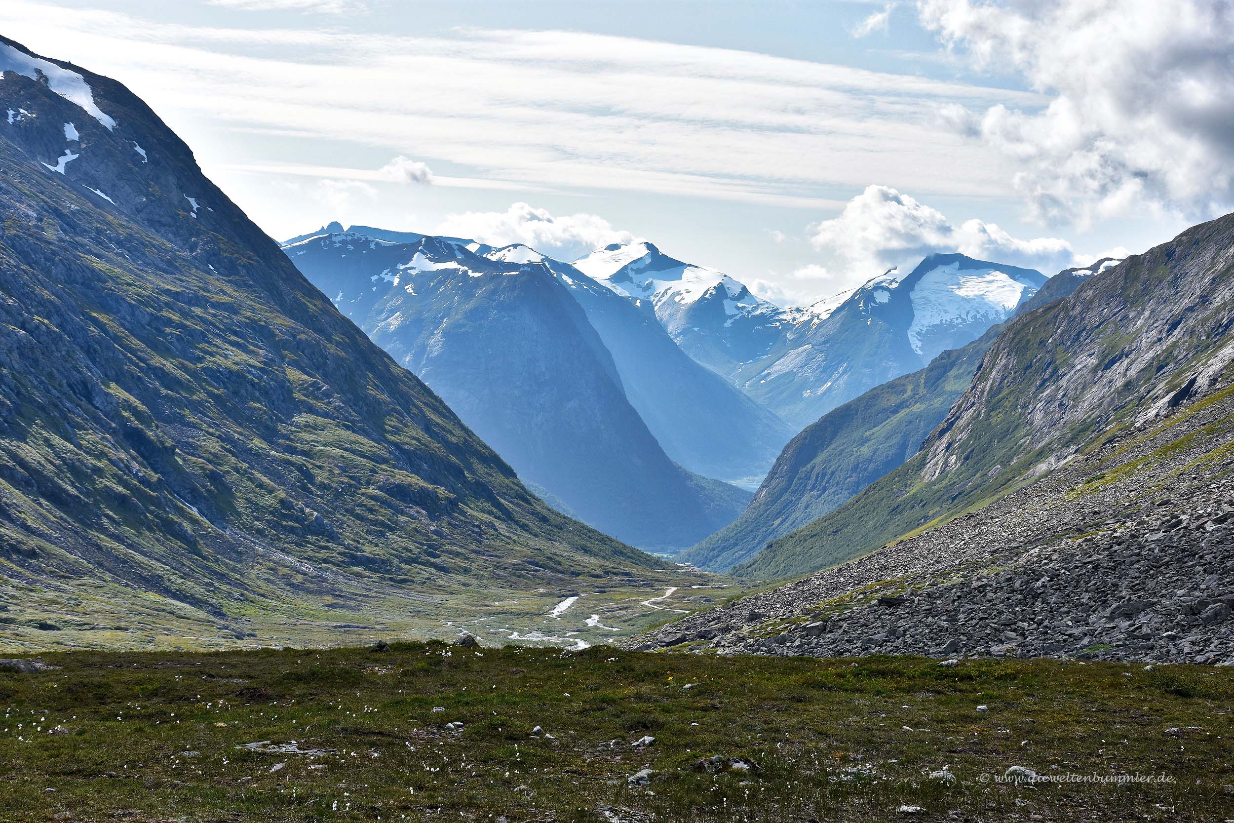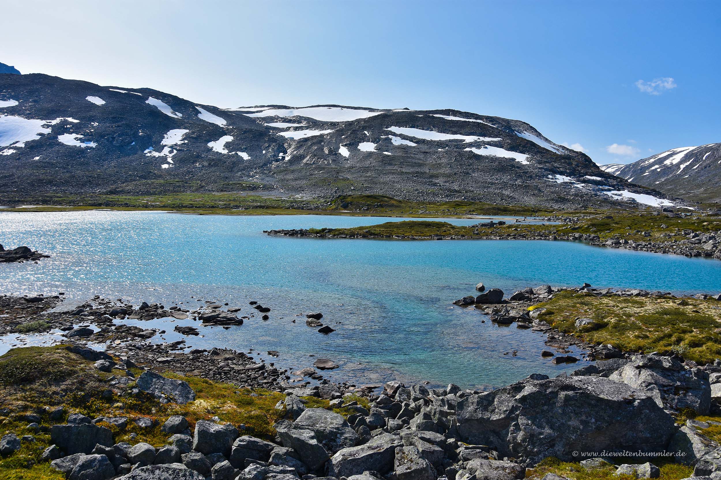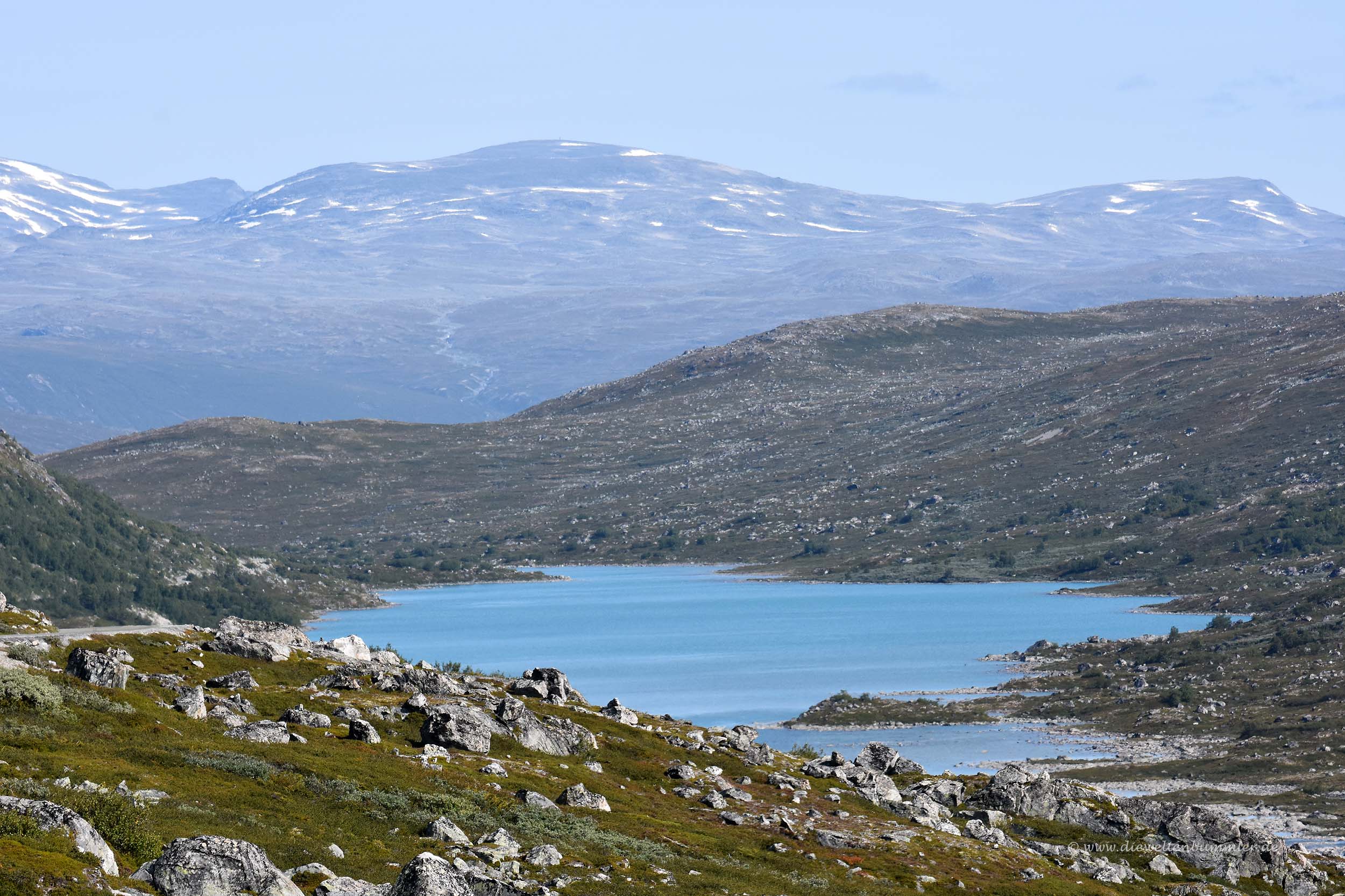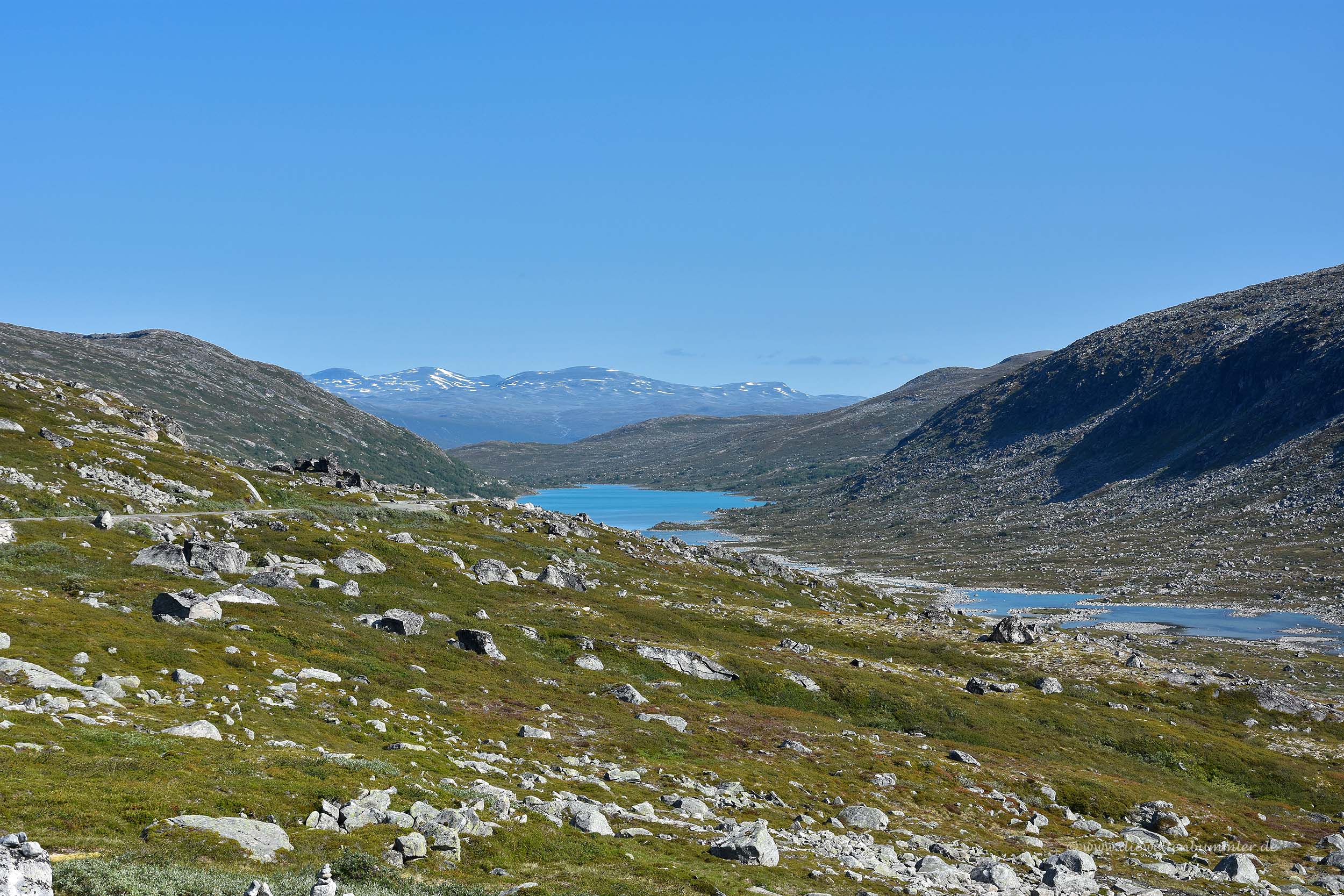Man passiert mehrere größere Seen auf diesem Fjell bis die Berge rechts und links nicht nur höher werden, sondern aus dem Fjell auch immer mehr ein enger werdendes Tal machen. Es wird noch schnell ein Skigebiet durchquert, bis es dann nach 20 Kilometern deutlich bergab geht. Hier sollte man unbedingt auch nochmal anhalten, bevor es dann in engen Serpentinen abwärts geht. Der Ausblick nach Westen ist einfach nur traumhaft. Eine grandiose Berglandschaft breitet sich vor einem aus.