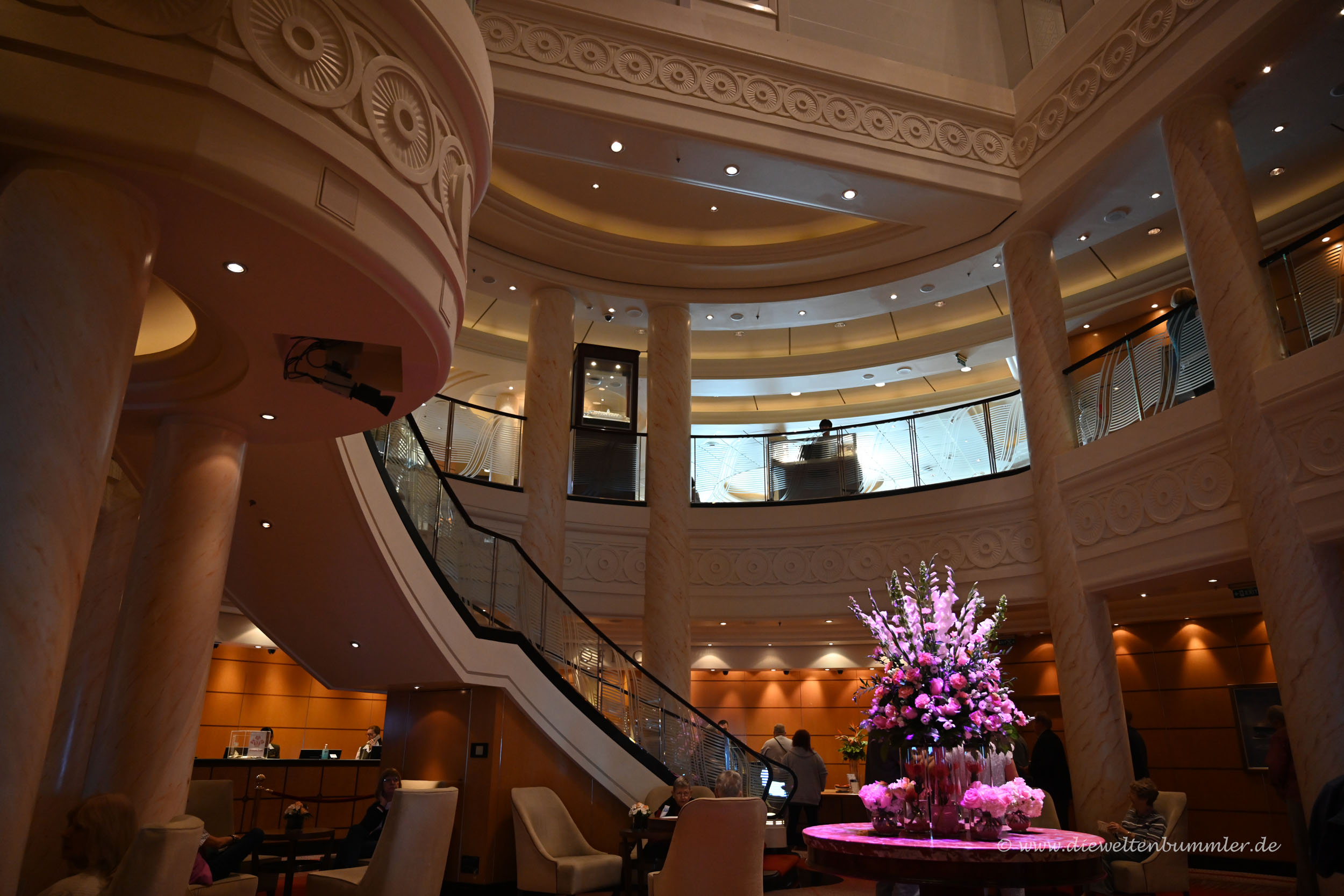 Moni hatte ziemlich schnell einen guten Vergleich parat. Sie hatte auf der Transatlantikfahrt (mal wieder) das Gefühl, alle Passagiere würden sich im Notfall gegenseitig unterstützen und helfen. Auf dieser eineinhalbtägigen Fahrt von Southampton nach Hamburg wäre sich jeder der Nächste. Und ja, das stimmt. Diese Einschätzung teilte nicht nur ich, sondern auch ein sehr sympathisches deutsches Pärchen, das ebenfalls die Transatlantikfahrt mitgemacht hatte und das wir bei den Deckspielen kennen lernten (Viele Grüße nach Bonn). Mit diesem Pärchen standen wir bei einem netten Gespräch im Untergeschoss der Grand Lobby und tauschten unsere Erfahrungen über die neue Kultur an Bord aus. Während dieses Gesprächs hörten wir zwei oder drei Mal, wie ein Deck über uns die Glocke geschlagen wurde.