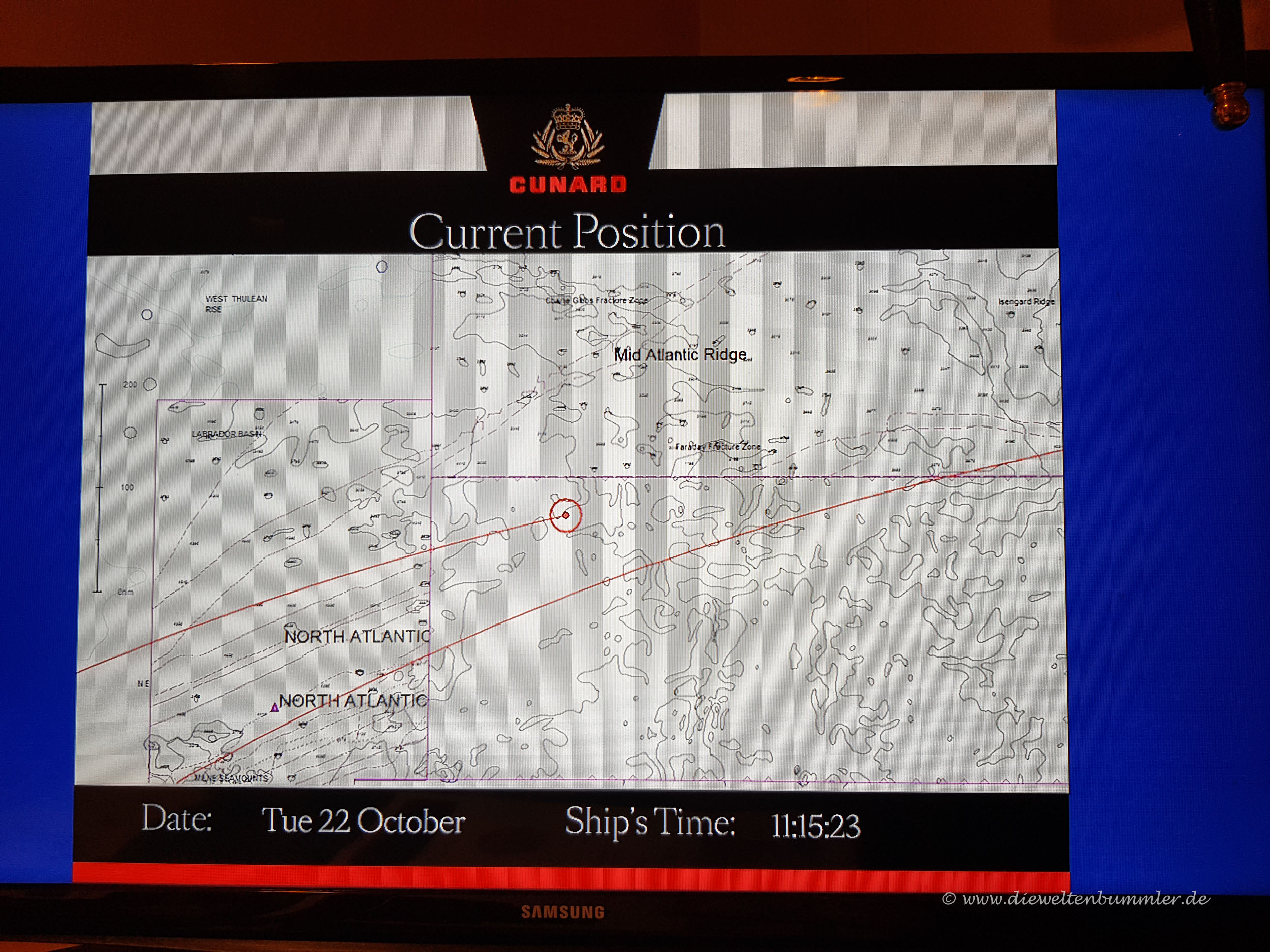 Am letzten Nachmittag lösten wir natürlich auch noch unser Stempelheft mit den 16 Stempeln und Stickern ein und erfreuten uns der Andenken von Cunard, die wir zum Abschluss natürlich auch noch in unsere Koffer verstauen mussten. Außerdem schauten wir bei der Versteigerung der Seekarte zu. Hier war ich ein wenig enttäuscht, weil nur 150 Dollar geboten wurden. Hätten wir das gewusst, hätten wir mit geboten, denn der Erlös kommt einem guten Zweck zu Gute.